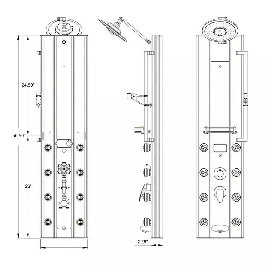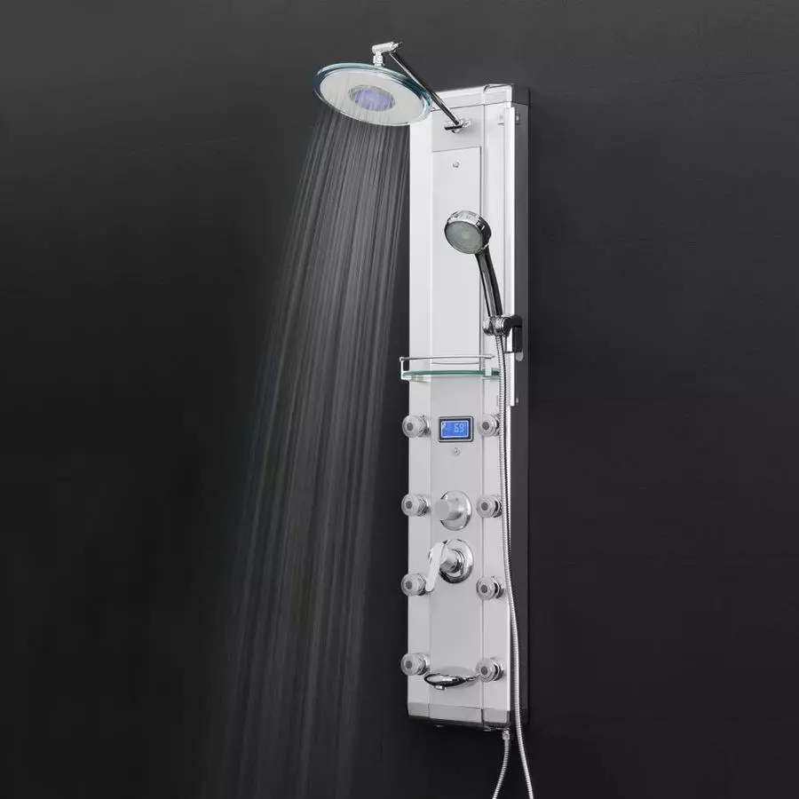Slimline luxury shower panel has built-in LED overhead rainfall showerhead, adjustable high-powered body massage jets, tub spout and high-efficiency LED handheld shower wand and mirror