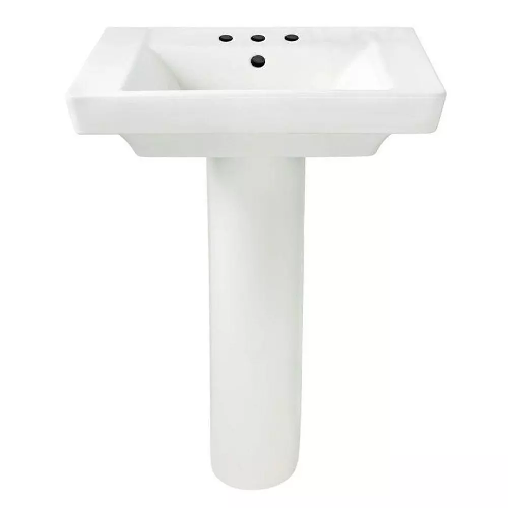 A bold, sophisticated classic. This striking rectangular pedestal sink from the Boulevard Suite brings a touch of uptown flair to any bathroom. It’s ergonomic Right Height design helps prevent back strain. Made from high-gloss, stain-resistant vitreous china. Available with a single hole or 4 in. or 8 in. center faucet holes.