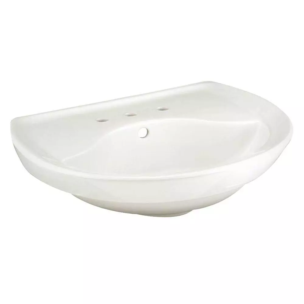 Use the American Standard Ravenna 6 in. Pedestal Sink Basin in White to help transform the look of your bathroom. Crafted from vitreous china, this sink resists staining for long-lasting strength and easy cleaning. Contemporary-styled, this basin offers a ledge for storing soap and accessories for convenient use. 1 pre-drilled hole is included for installation of a faucet (not included).