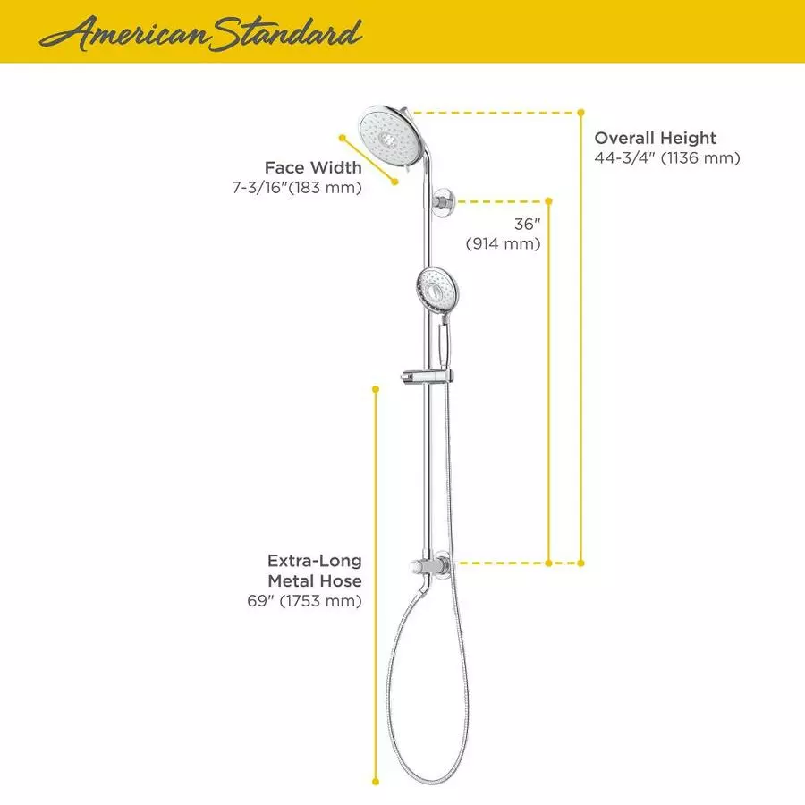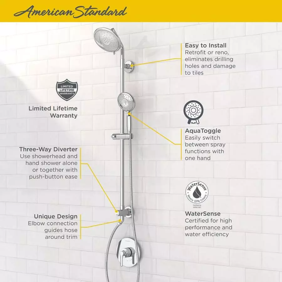 System includes 7-in four-spray showerhead, hand shower, push-button diverter, slide bar with Easy Glide tab, 69-in metal shower hose, adhesive tape and screws