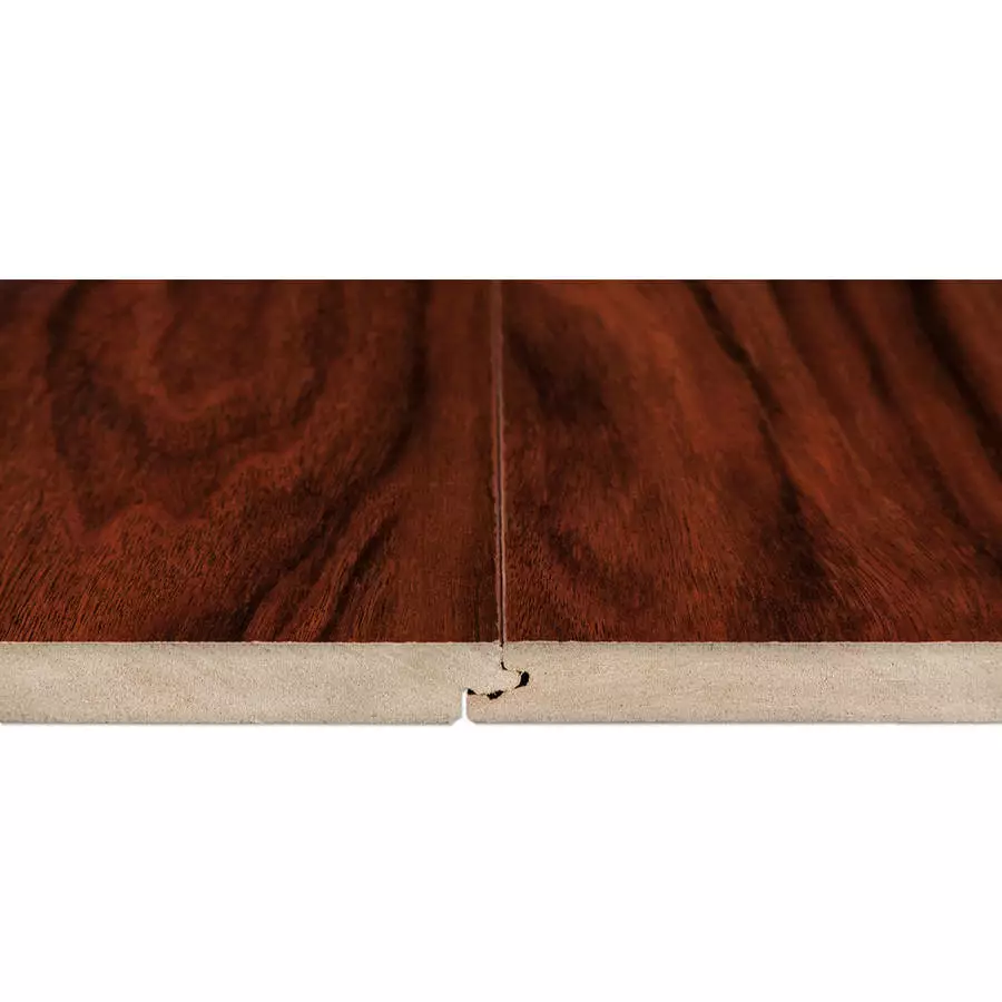 Crystal surface laminate flooring features a Nutmeg color.