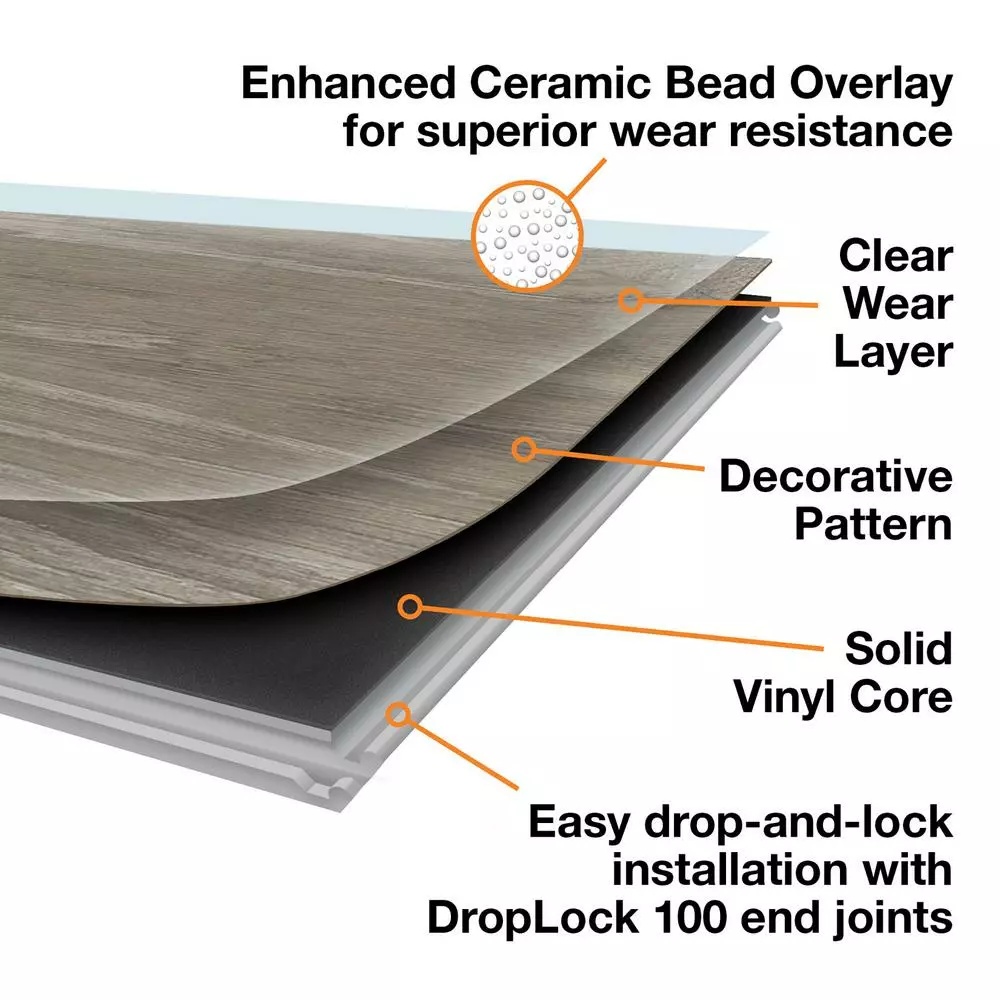 Home Decorators Collection Vinyl Plank Flooring gives you the richness and deep texture of hardwood flooring with luxurious embossing for a beautiful look and feel. This product features enhanced ceramic bead surface coating for scratch resistance. Dramatic 7.5 in. x 47.6 in. planks are durable and quiet underfoot. Home Decorators Collection simple angle-drop-lock installation system allows for easy, no-glue installation, saving time, effort and money. The floating floor installs over most existing surfaces including concrete, tile, wood and vinyl. This flooring is both phthalate-free and formaldehyde-free to ensure product safety. With Home Decorators Collection, you can transform any room in your home quickly and easily.