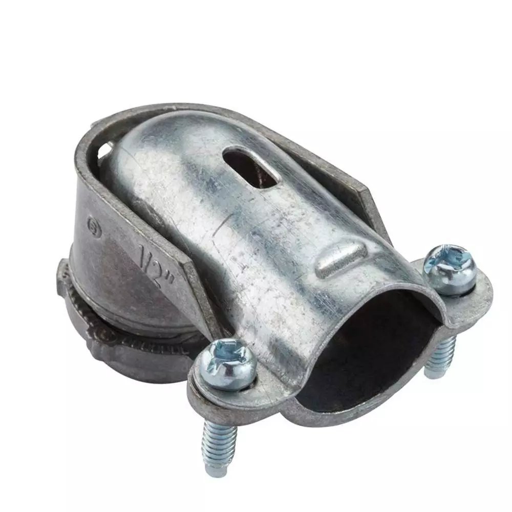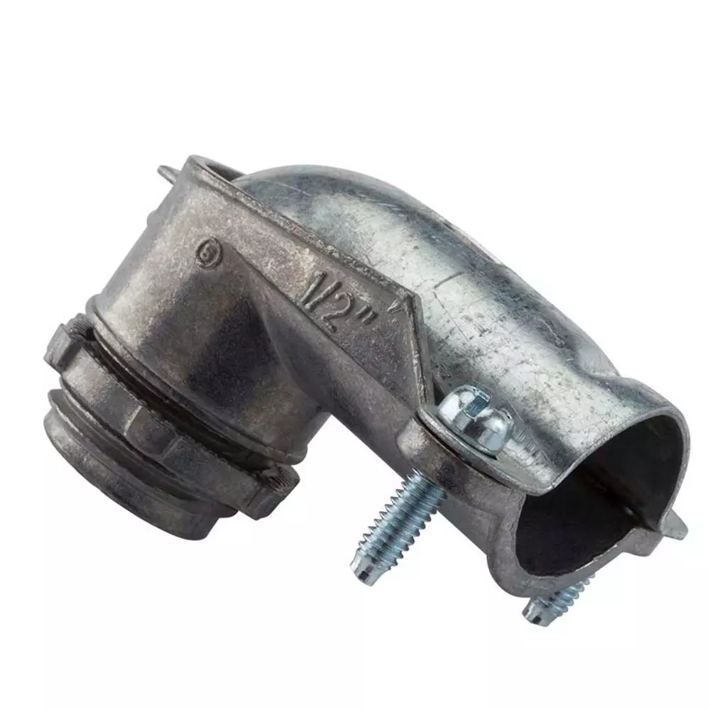 The 1/2 in. 90° Connector connects and effectively bonds flexible metal conduit (FMC), Mc and Ac to a steel outlet box or other metal enclosure in a right-angled connection. It is made of galvanized steel and designed to ensure ground continuity. This connector meets UL and CSA requirements.