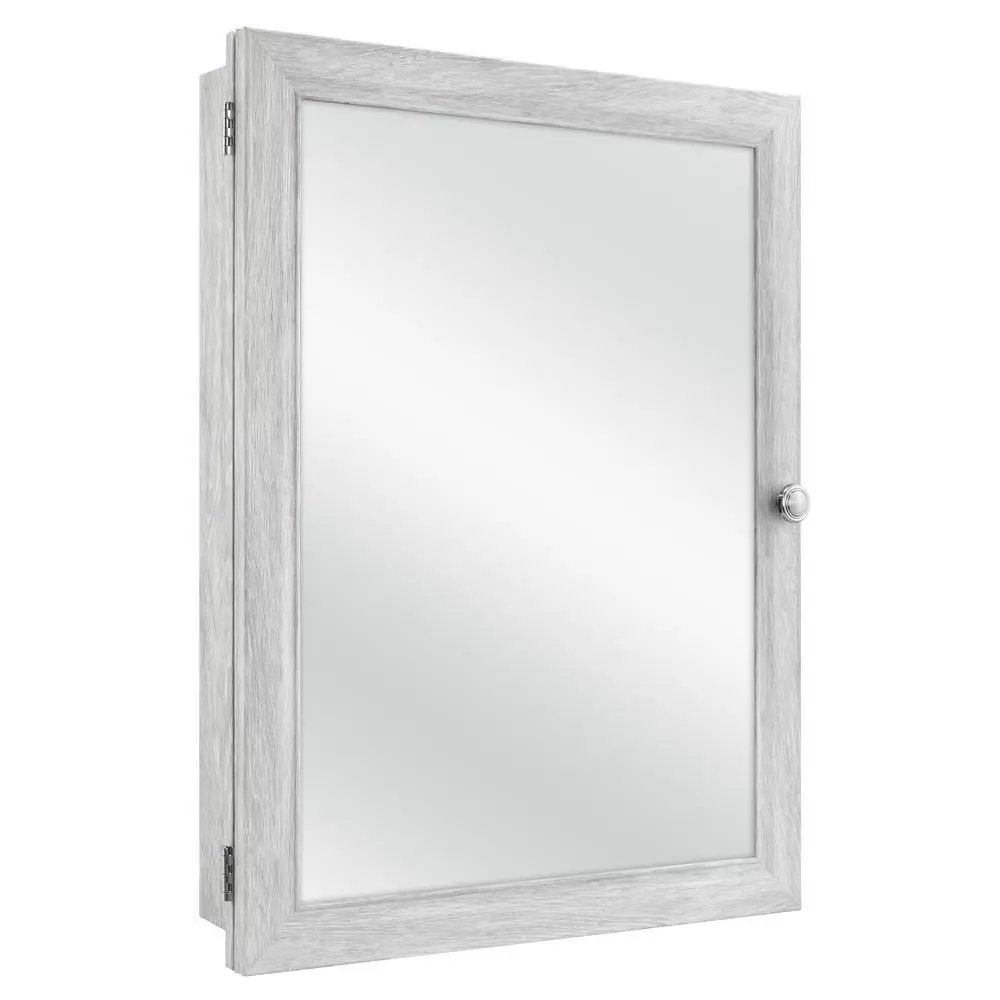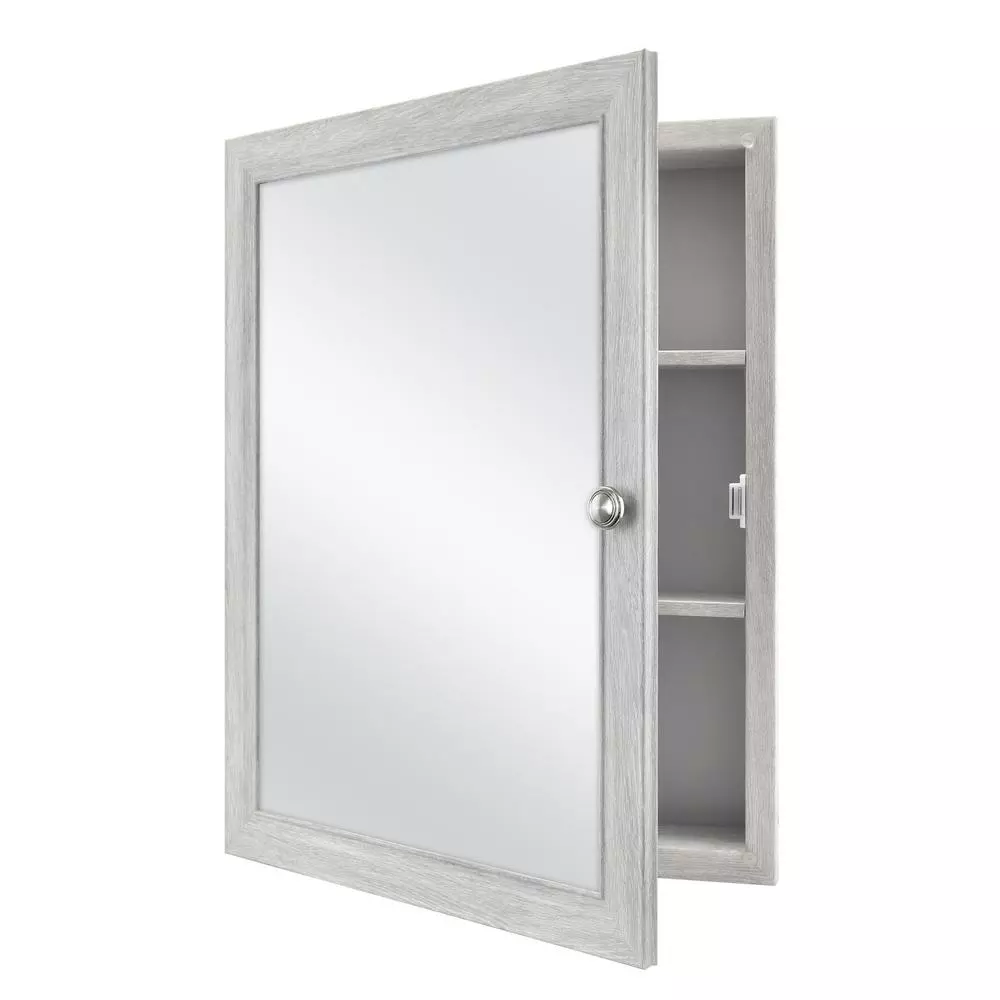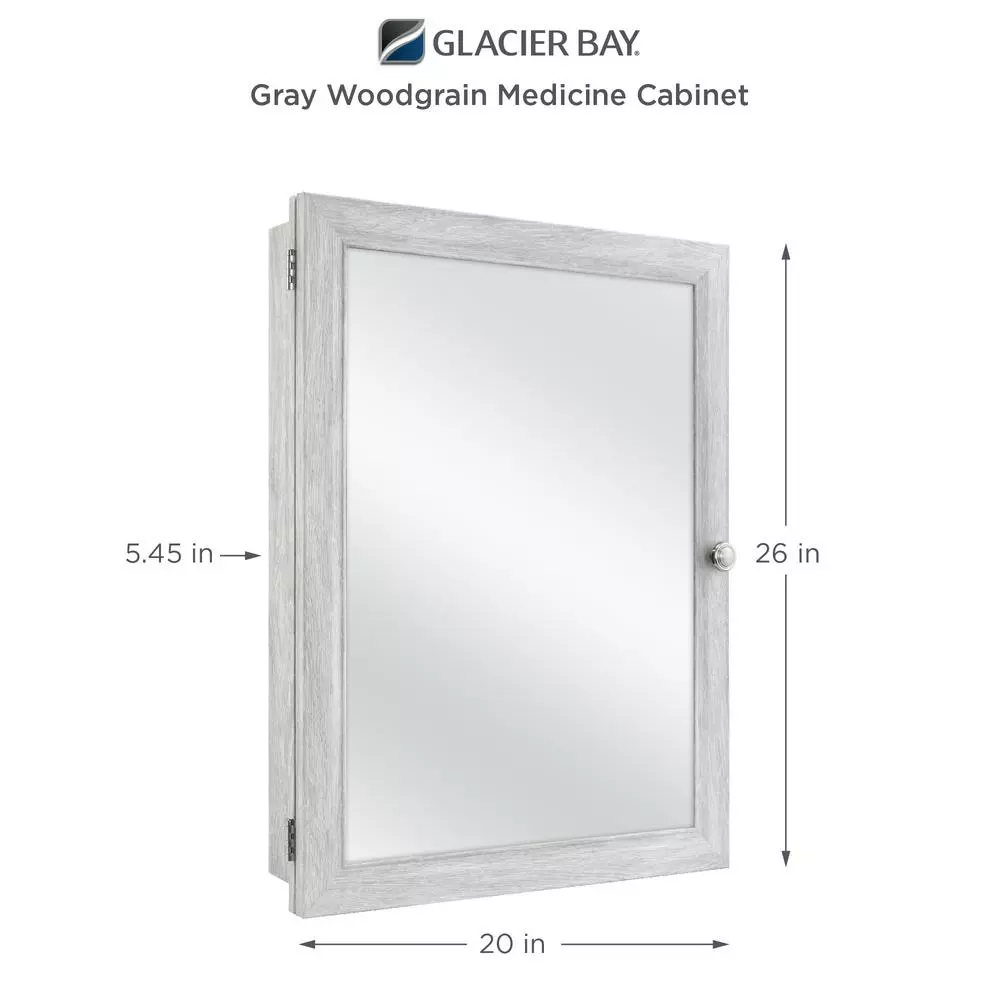 A perfect complement to any bathroom style, the Glacier Bay 20 in. W x 26 in. W x 4.64 in. D Beveled Frameless Medicine Cabinet features a stylist pewter finish. The polystyrene cabinet and frame is lightweight, durable and resistant against mold and mildew. This medicine cabinet can be recessed or surface mounted. Includes double shelf pegs and 2 adjustable shelves that allow for quick and easy customized storage space. The versatility of this cabinet also allows the door to be reversible to open left or right based on your preference and door opens to 140°. The grey woodgrain finish can easily coordinate with any existing bathroom hardware.
