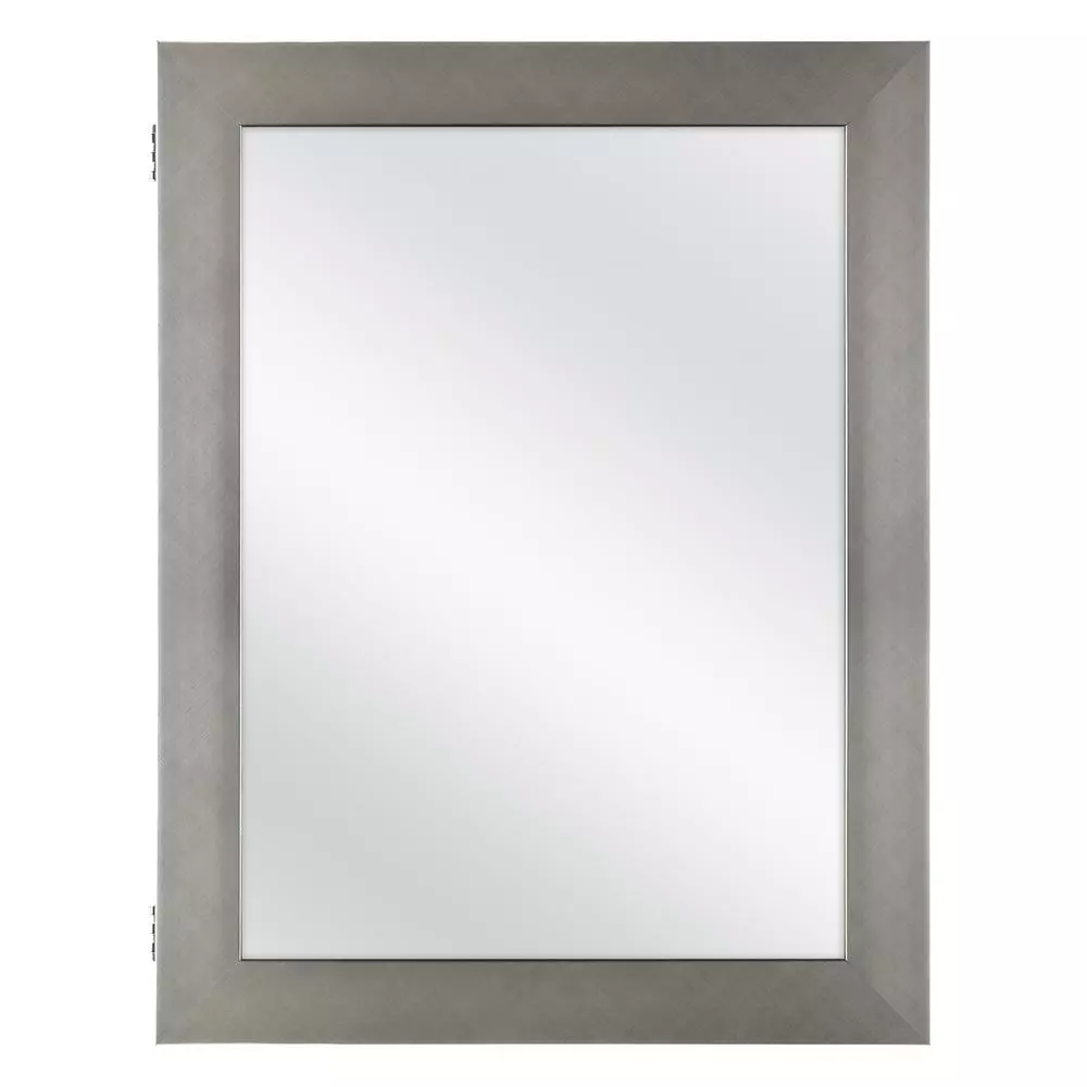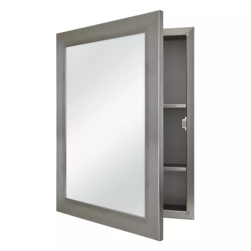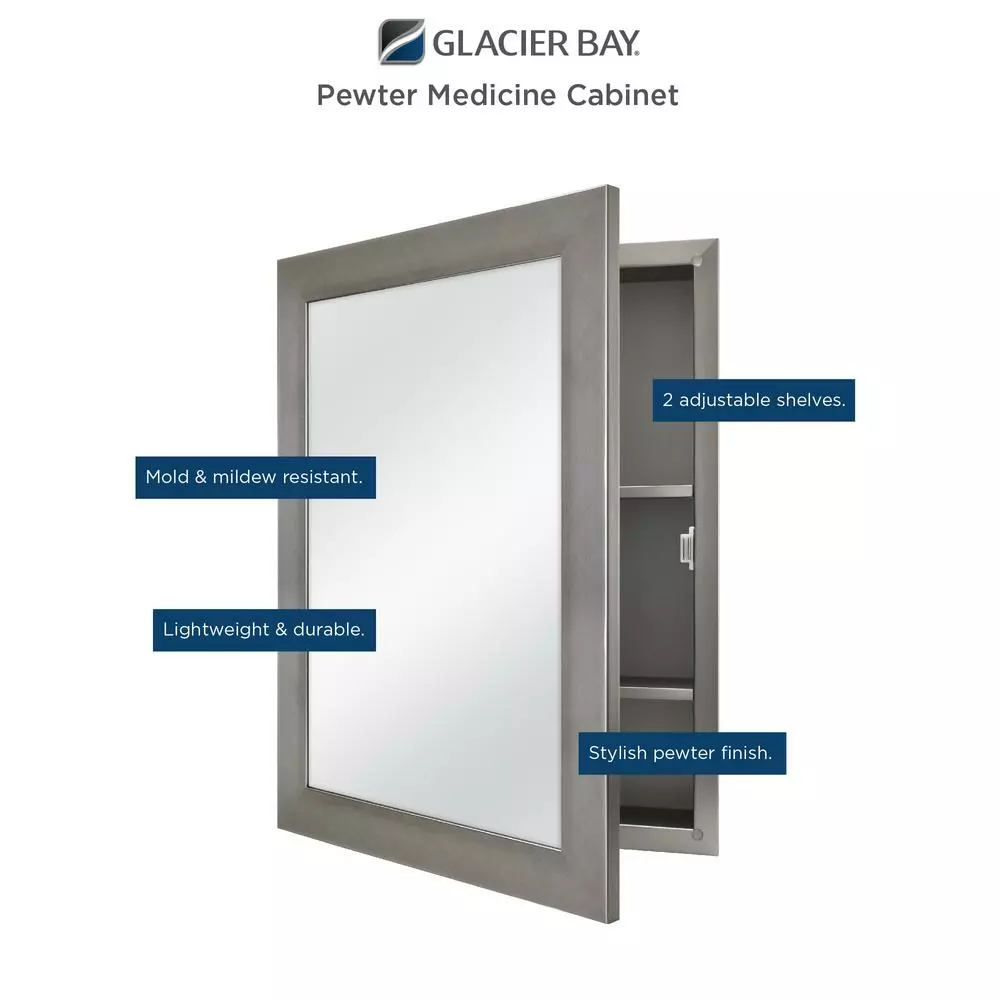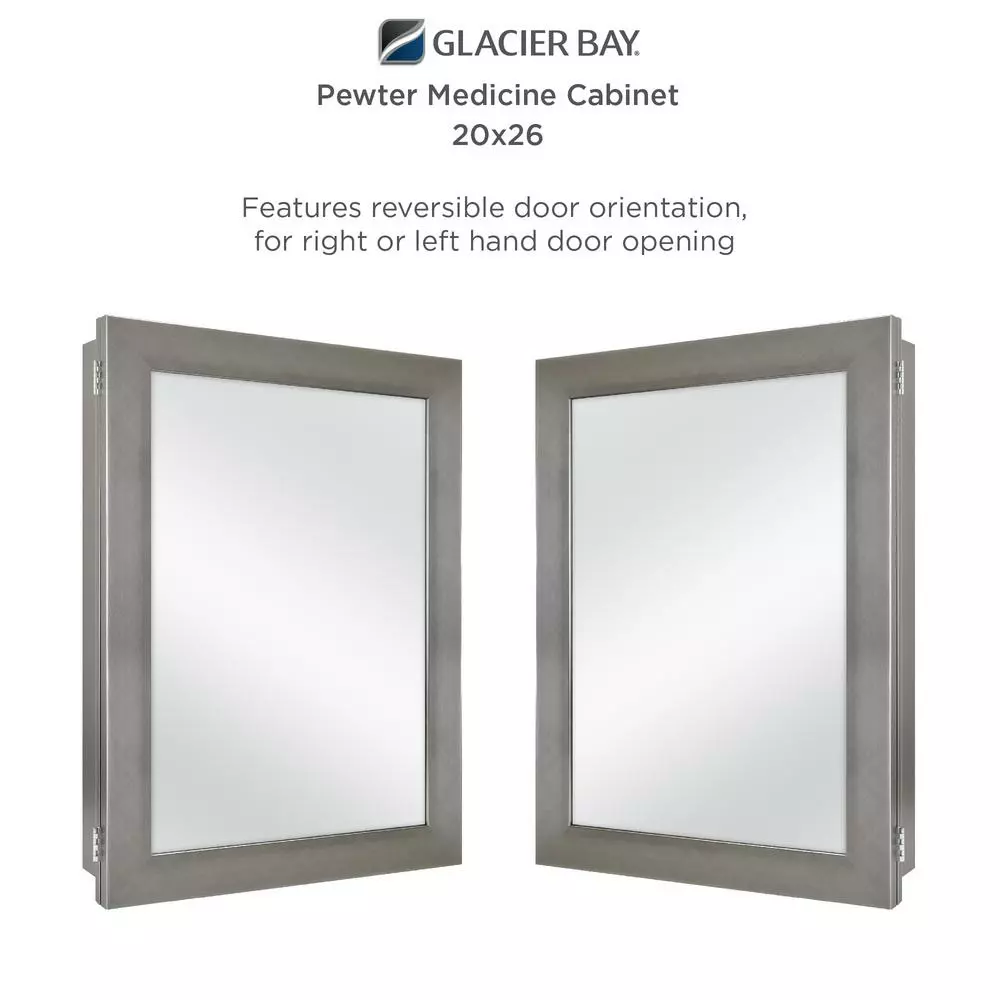 A perfect complement to any bathroom style, the Glacier Bay 20 in. W x 26 in. W x 4.64 in. D Beveled Frameless Medicine Cabinet features a stylist pewter finish. The polystyrene cabinet and frame is lightweight, durable and resistant against mold and mildew. This medicine cabinet can be recessed or surface mounted. Includes double shelf pegs and 2 adjustable shelves that allow for quick and easy customized storage space. The versatility of this cabinet also allows the door to be reversible to open left or right based on your preference and door opens to 140°. The pewter finish can easily coordinate with any existing bathroom hardware.