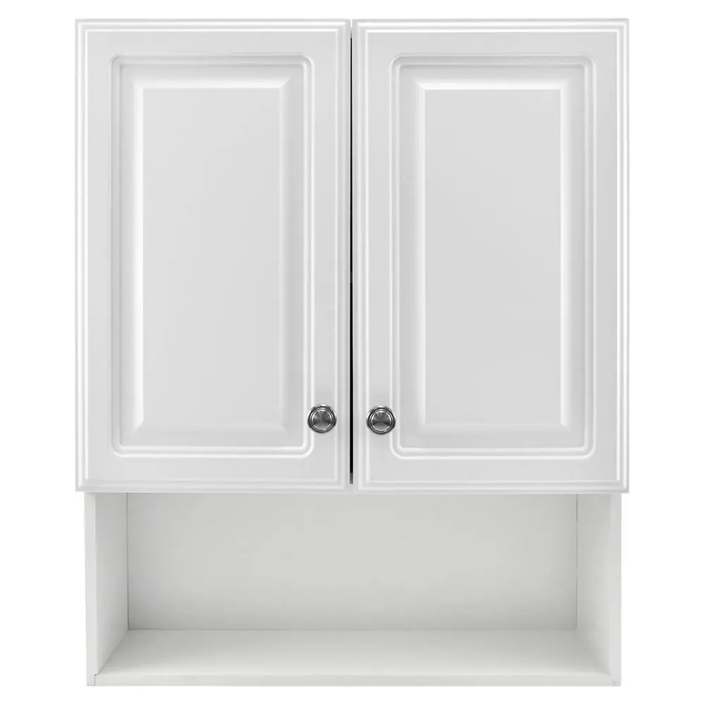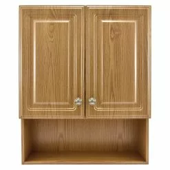 The Glacier Bay 23-1/8 in. W x 27-7/8 in. H x 7-1/2 in. D Oak Framed Surface-Mount Bathroom Medicine Cabinet is a great addition to your bathroom or powder room. The open shelf design provides an area to display decorative objects and the adjustable interior shelf gives you flexible storage space. Double shelf pegs make it quick and easy to customize your cabinet. Wood Composite construction provides exceptional durability and strength. Fully assembled for your convenience.