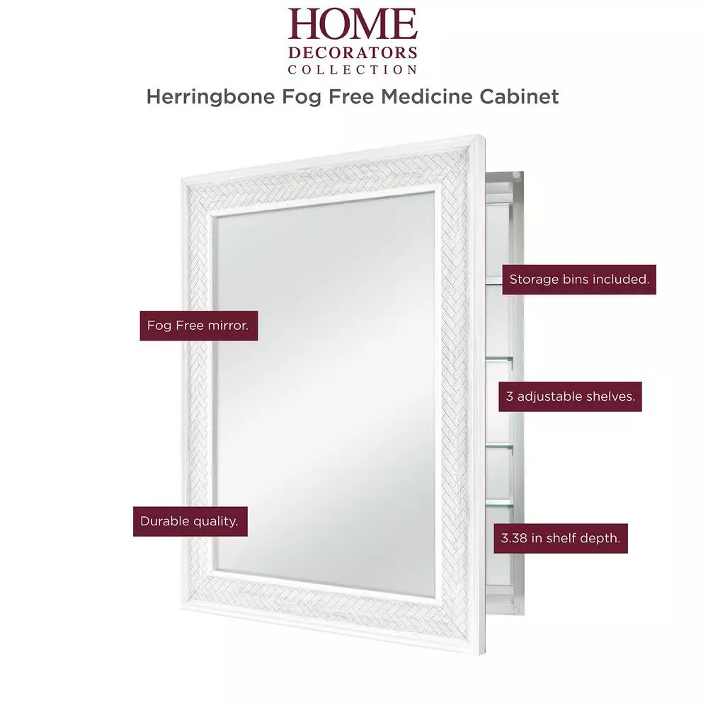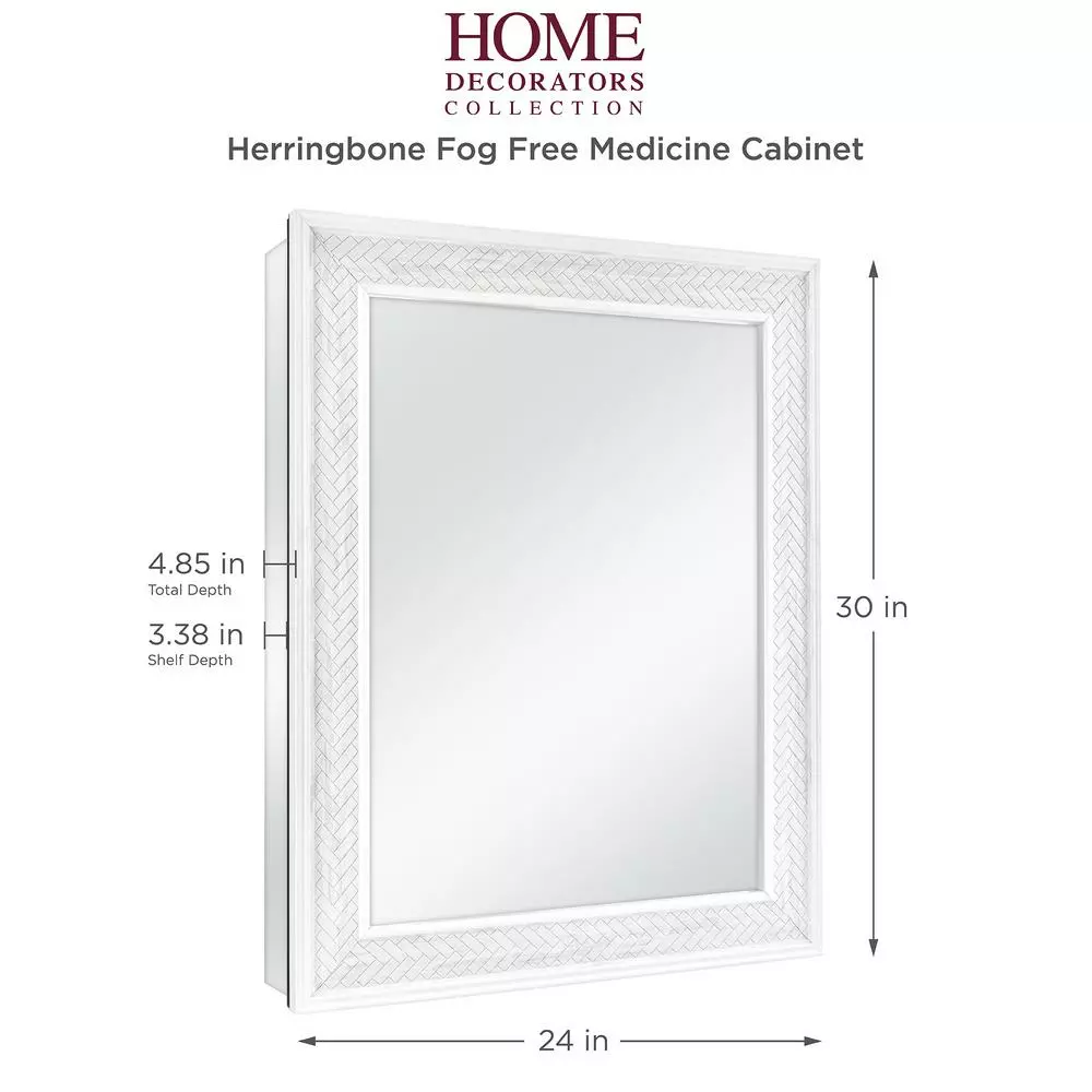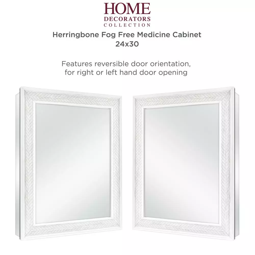 The Home Decorators Collection 24 in. W x 30 in. H x 4.85 in. D Fog Free Framed Marble Herringbone Medicine Cabinet gives you a fogless reflection you’ve always dreams of. Our innovative, fog-free technology is safe, affordable and does not require heating elements. You can finally enjoy a fog-free view after a steamy shower. This medicine cabinet can be recessed or surface mounted. Includes side mirrors and hardware for optional surface mount feature. Use the two double shelf pegs for quick and easy customized storage space along with the 3 adjustable glass shelves. Also included are 3 removable bins for even more storage that are dishwasher safe. The door opens 165° allow for optimal usage of the interior door and back mirror for multiple viewing angles for added functionality. The durable rust-free aluminum frame is exceptionally strong and the mirror is already assembled for your convenience. The EZ-cam hanging system allows you to securely install your medicine cabinet with the included hardware and hanging instructions. The versatility of this cabinet also allows the door to be reversible to open left or right based on your preference. The herringbone design can easily coordinate with any existing bathroom hardware.