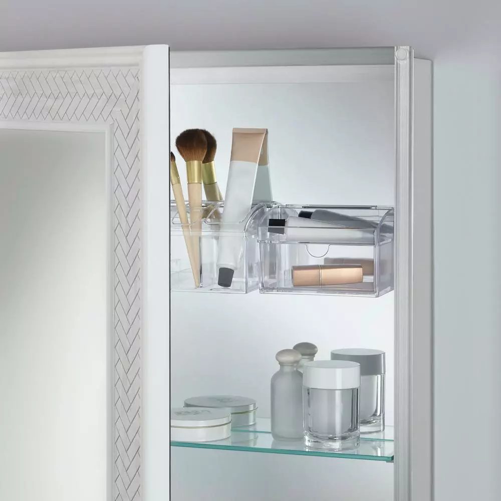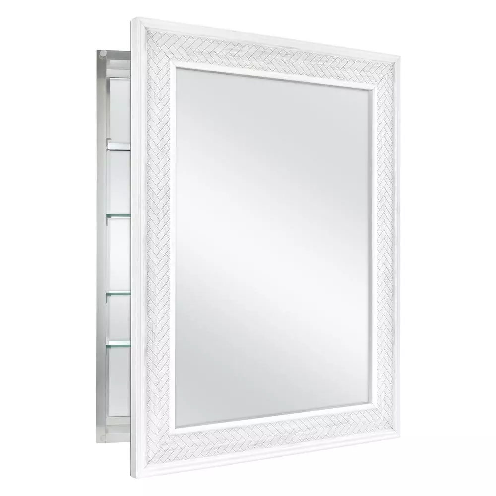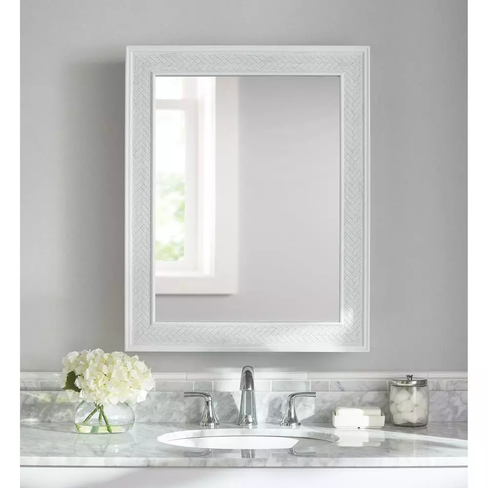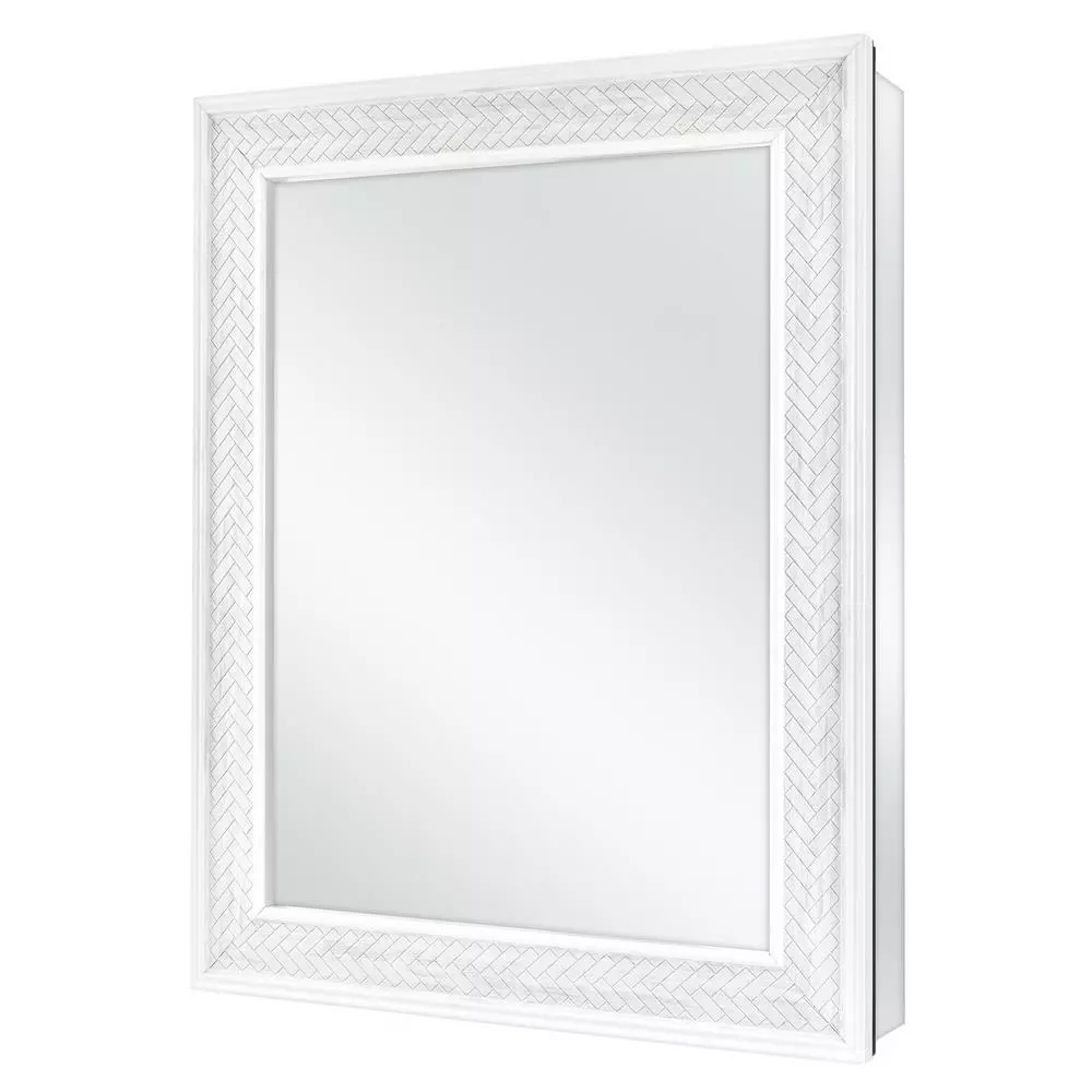 The Home Decorators Collection 24 in. W x 30 in. H x 4.85 in. D Fog Free Framed Marble Herringbone Medicine Cabinet gives you a fogless reflection you’ve always dreams of. Our innovative, fog-free technology is safe, affordable and does not require heating elements. You can finally enjoy a fog-free view after a steamy shower. This medicine cabinet can be recessed or surface mounted. Includes side mirrors and hardware for optional surface mount feature. Use the two double shelf pegs for quick and easy customized storage space along with the 3 adjustable glass shelves. Also included are 3 removable bins for even more storage that are dishwasher safe. The door opens 165° allow for optimal usage of the interior door and back mirror for multiple viewing angles for added functionality. The durable rust-free aluminum frame is exceptionally strong and the mirror is already assembled for your convenience. The EZ-cam hanging system allows you to securely install your medicine cabinet with the included hardware and hanging instructions. The versatility of this cabinet also allows the door to be reversible to open left or right based on your preference. The herringbone design can easily coordinate with any existing bathroom hardware.
