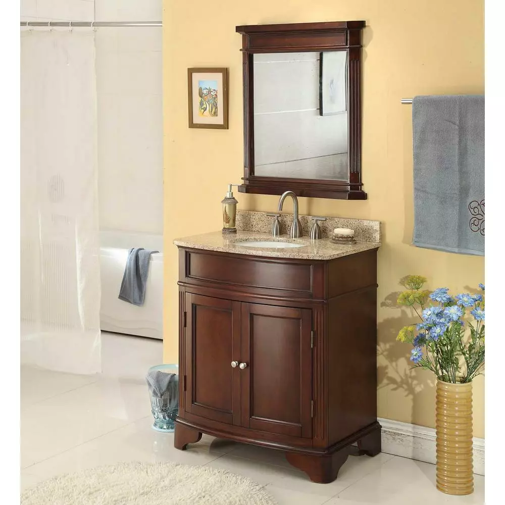 The 26 in. W x 30-1/8 in. H x 2-3/16 in. D Mirror in Cherry is hanging on the wall and is ideal for saving space. Cherry finish is sure to complement your decor. With its clean and classic design to pair it with a matching vanity for a coordinated set.