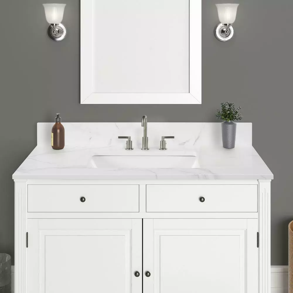 43 in. Calacatta White Engineered Marble Top. Attached stylish rectangular white vitreous china undermount bowl with safety overflow hole. 4 in. high backsplash included to help protect walls from water damage.