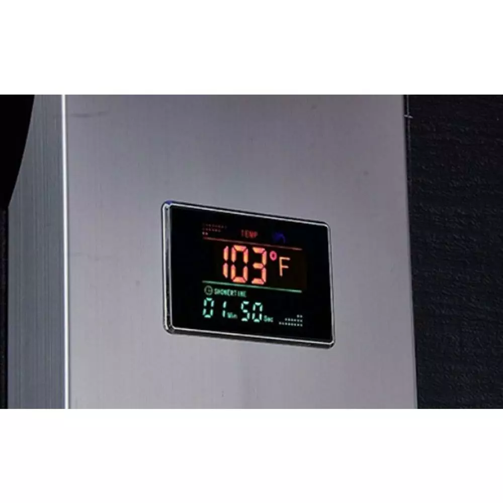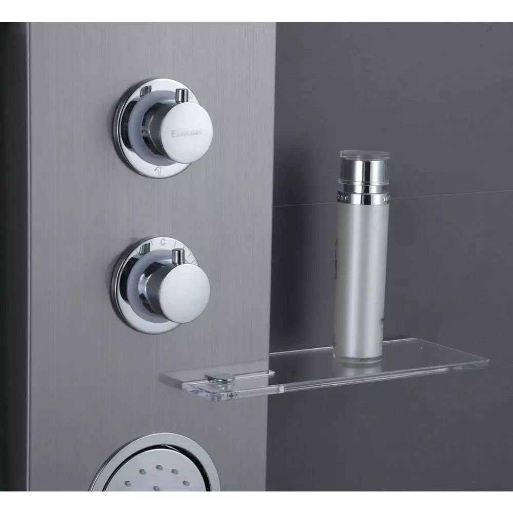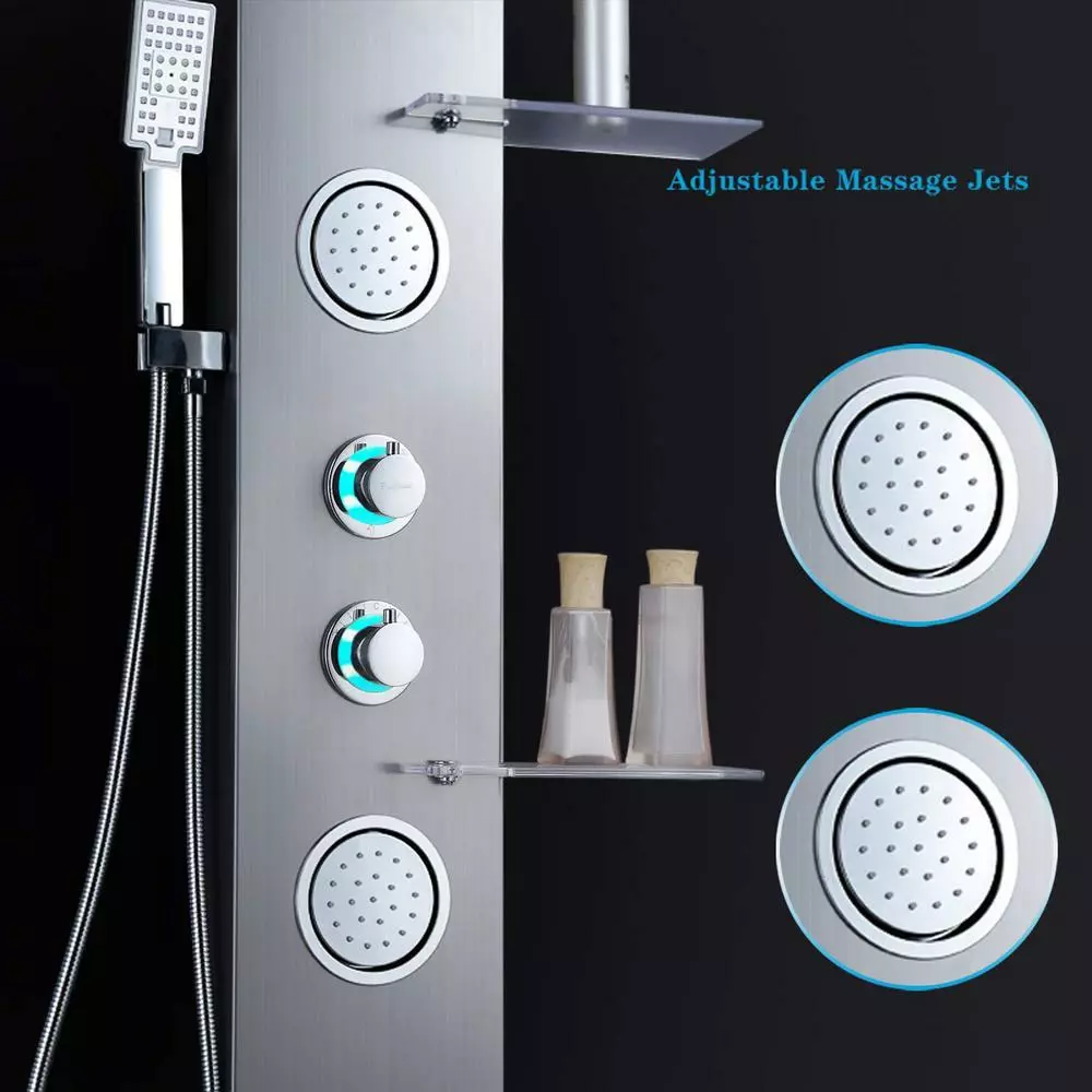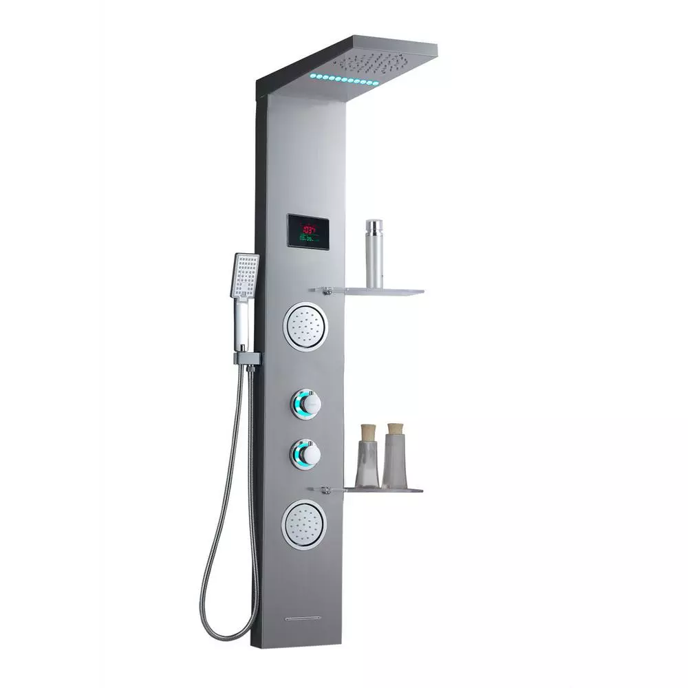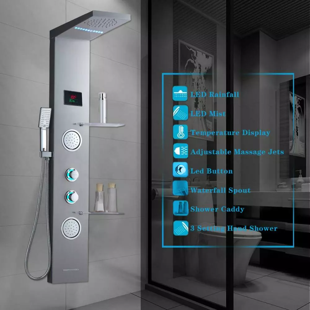 - Luxury shower panel has built-in LED temperature display, LED overhead rainfall showerhead, adjustable high-powered body massage jets, tub spout, and high-efficiency multi-function handheld shower wand
