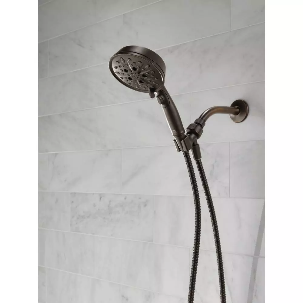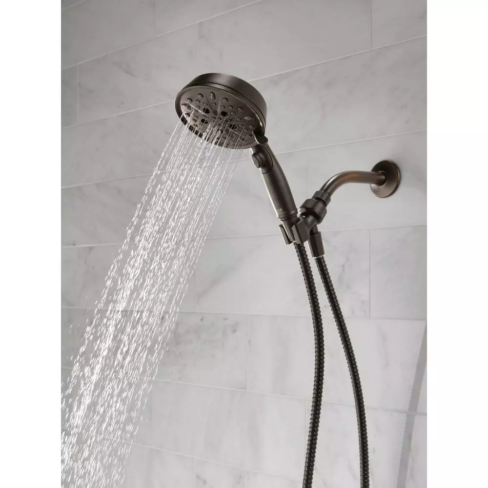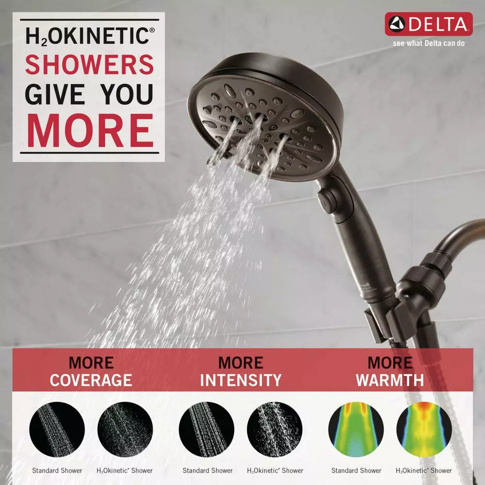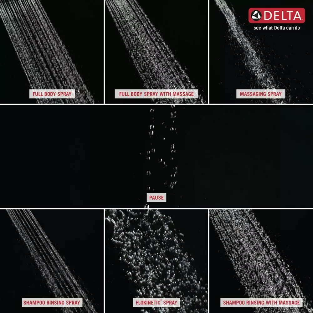 Delta H2Okinetic PowerDrench Showers look different because they are different. H2Okinetic showers are powered by an innovative technology that sculpts the water into a unique wave pattern, giving you the feeling of more water without using more water and creating a shower with more warmth, coverage and intensity. So go ahead and indulge, because now you can enjoy the feeling of more water without using more water. Delta SpotShield Technology helps to keep your faucet or shower cleaner, longer by resisting water spots and fingerprints. Keep your space spotless with SpotShield Technology, available across a variety of finishes for the kitchen and bath. While other products may gather unsightly mineral build-up over time, Delta soft rubber Touch-Clean spray holes allow any mineral residue to simply be wiped away for an instantly refreshed look with no need for soaking or the aid of chemical cleaners. The pause setting gives you ample space for shaving, lathering and other shower tasks, without worrying about overspray or water waste. This spray setting helps you conserve water, so you can worry less about depleting your supply of hot water – and you help the environment too. Delta WaterSense labeled faucets, showers and toilets use at least 20% less water than the industry standard saving you money without compromising performance.