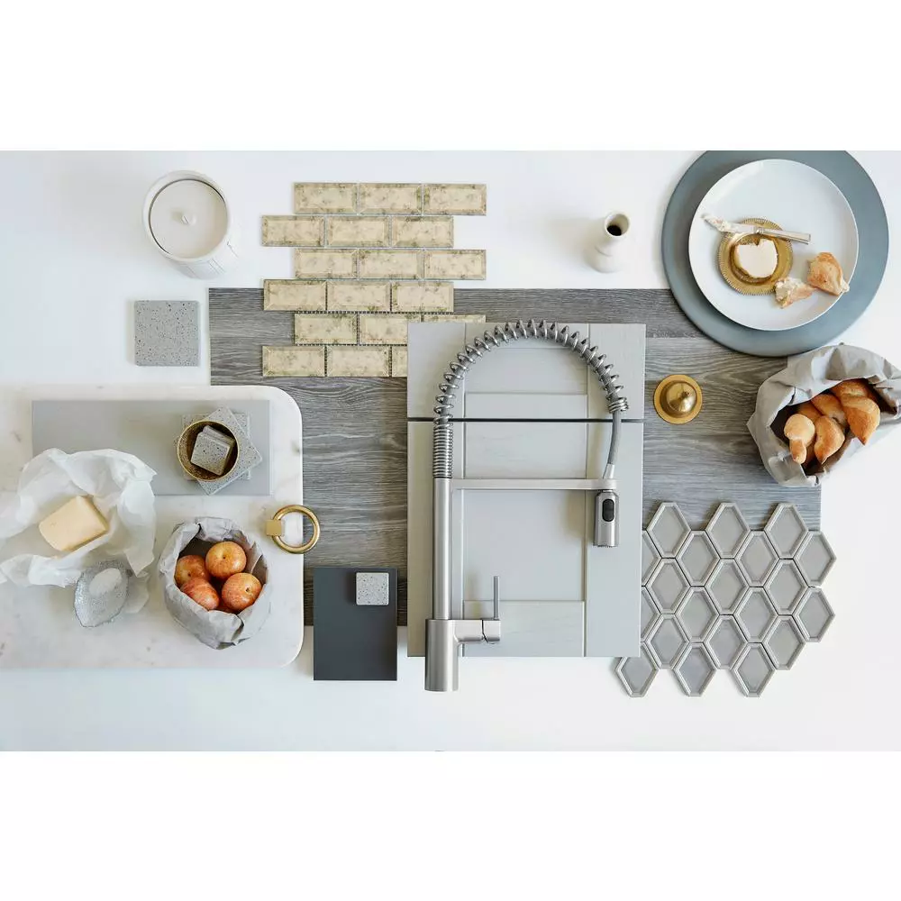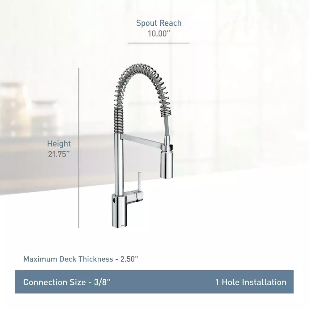 Dramatic design with modern features, the MOEN Align Spring Pulldown Kitchen Faucet delivers quality performance. This kitchen faucet offers plenty of clearance for taller pots and pans, extends your reach in and around the sink, and provides 2 spray options to make everyday cleaning jobs easier. Featuring single-sensor touchless activation, MotionSense Wave allows you to easily turn water on and off with the wave of a hand no need to touch the faucet with dirty or wet hands. Installation is quick and easy with the Duralock Quick Connect system, and the faucet can be mounted on either a sink or countertop.
