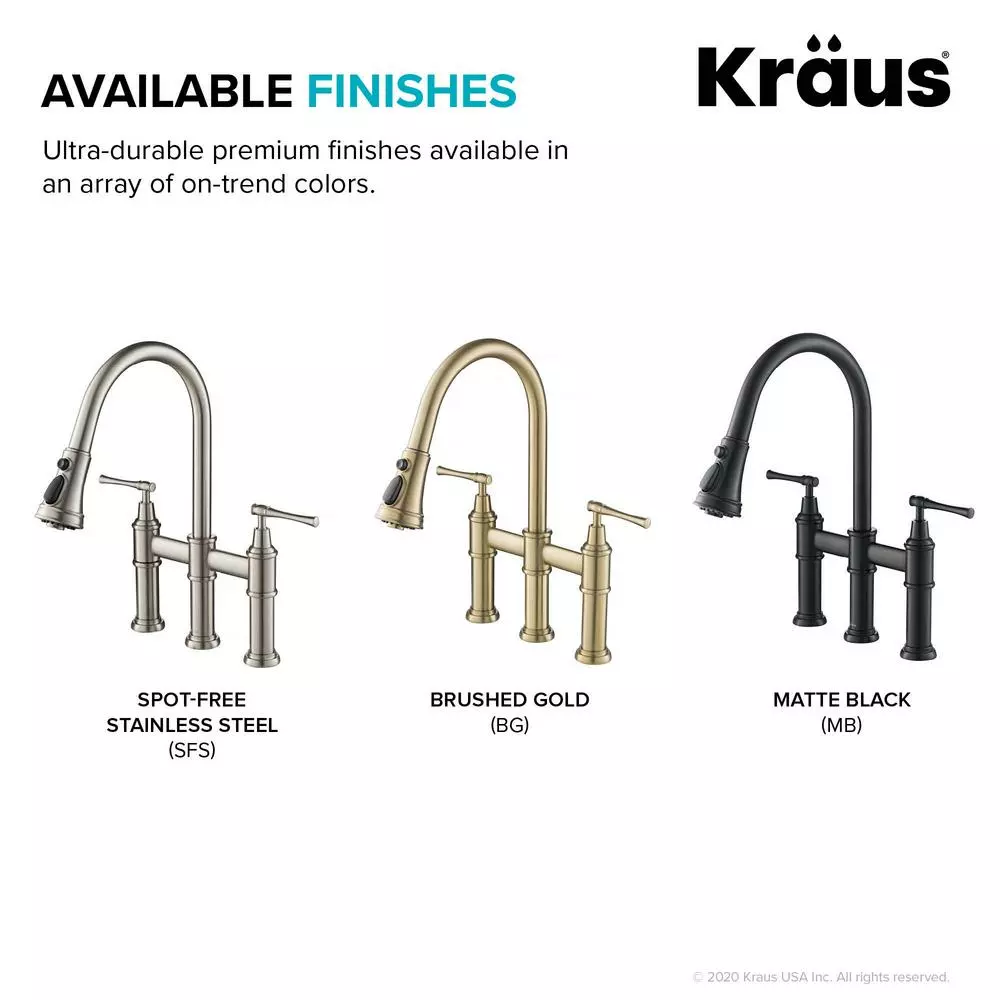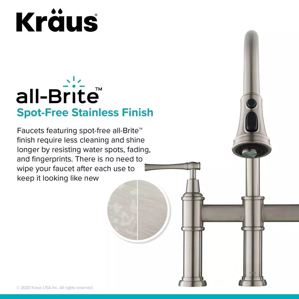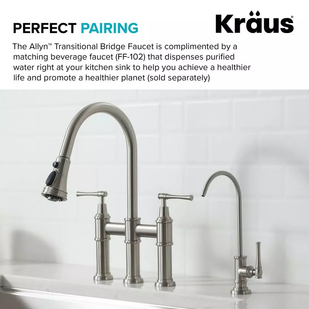 Striking the perfect balance between classic and contemporary style, the graceful curves and decorative details of the Allyn Bridge Faucet create a transitional look that complements any kitchen. Designed for ultimate convenience, the 3-function pull-down spray head provides maximum flexibility for all your kitchen tasks and allows you to hit every hard-to-reach corner of your kitchen sink. Switch from aerated stream or spray for everyday tasks to a powerful blade of water that sweeps away food residue at the push of a button. The elegant gooseneck spout easily accommodates your largest cookware, and adds to the soft transitional aesthetic. Solid brass construction and best-in-industry components ensure long-lasting leak-free performance. Customize the Allyn faucet with your choice of finish, including Brushed Gold, Matte Black, and Spot Free all-Brite Stainless Steel which prevents fingerprints and requires less cleaning.