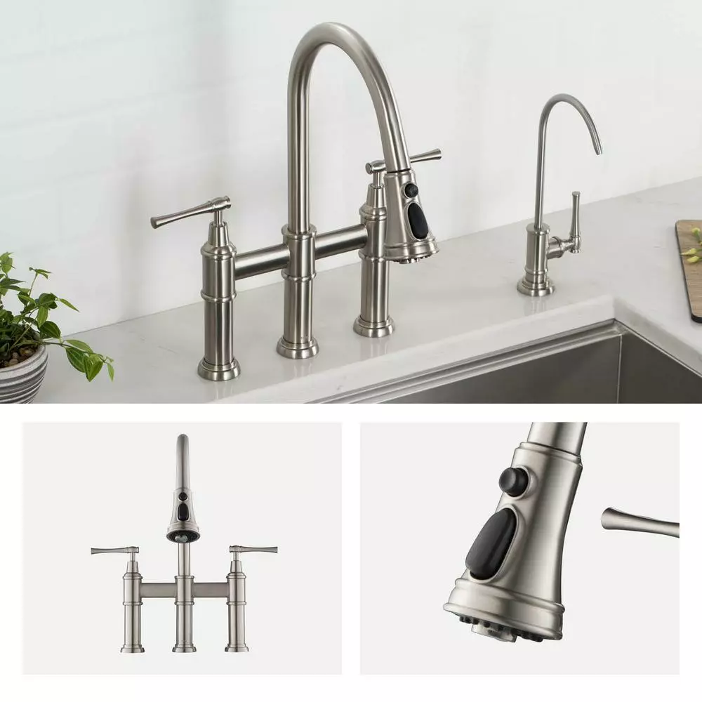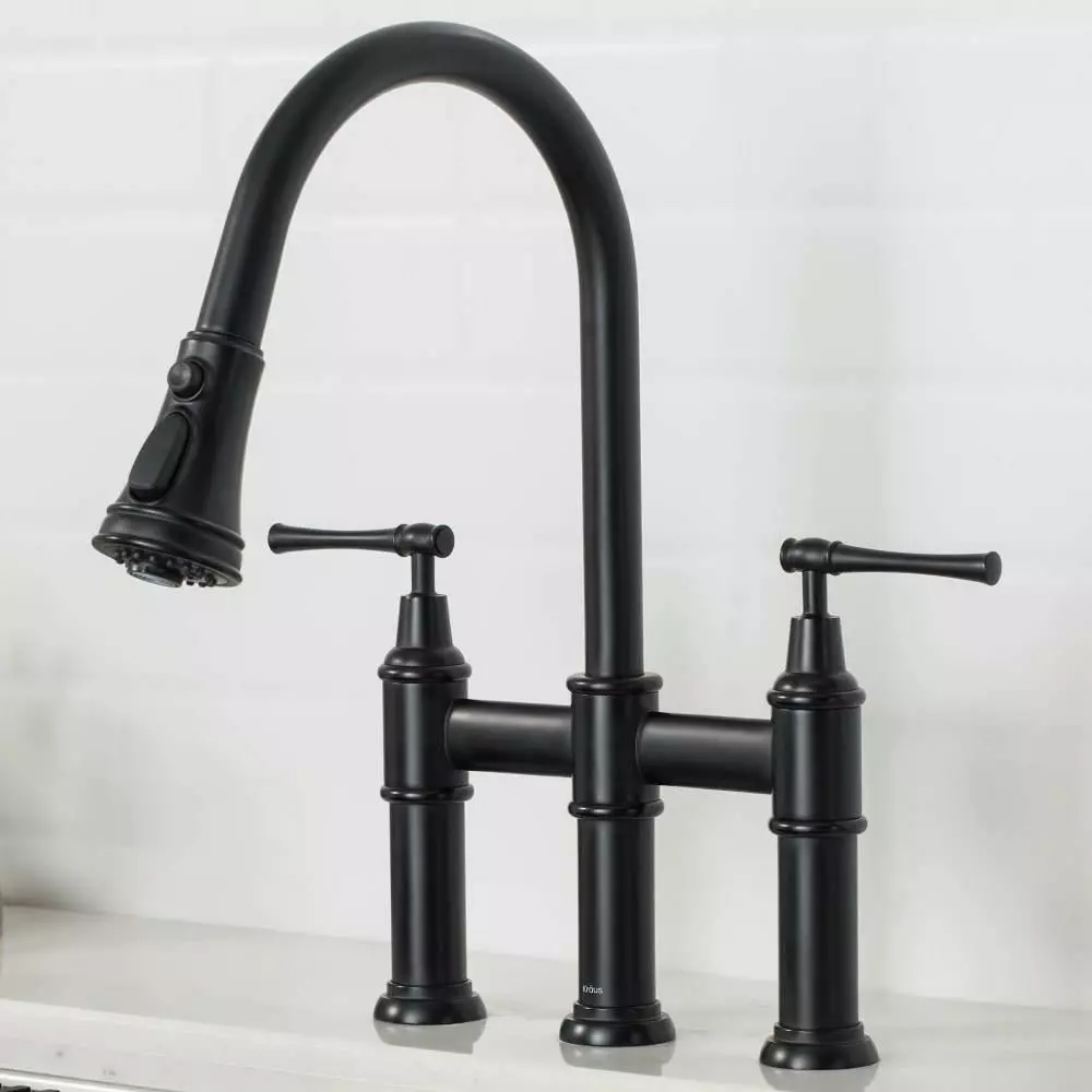 - Bridge faucet design: a horizontal bar connects hot and cold water handles to the faucet spout for a bold classically-inspired look