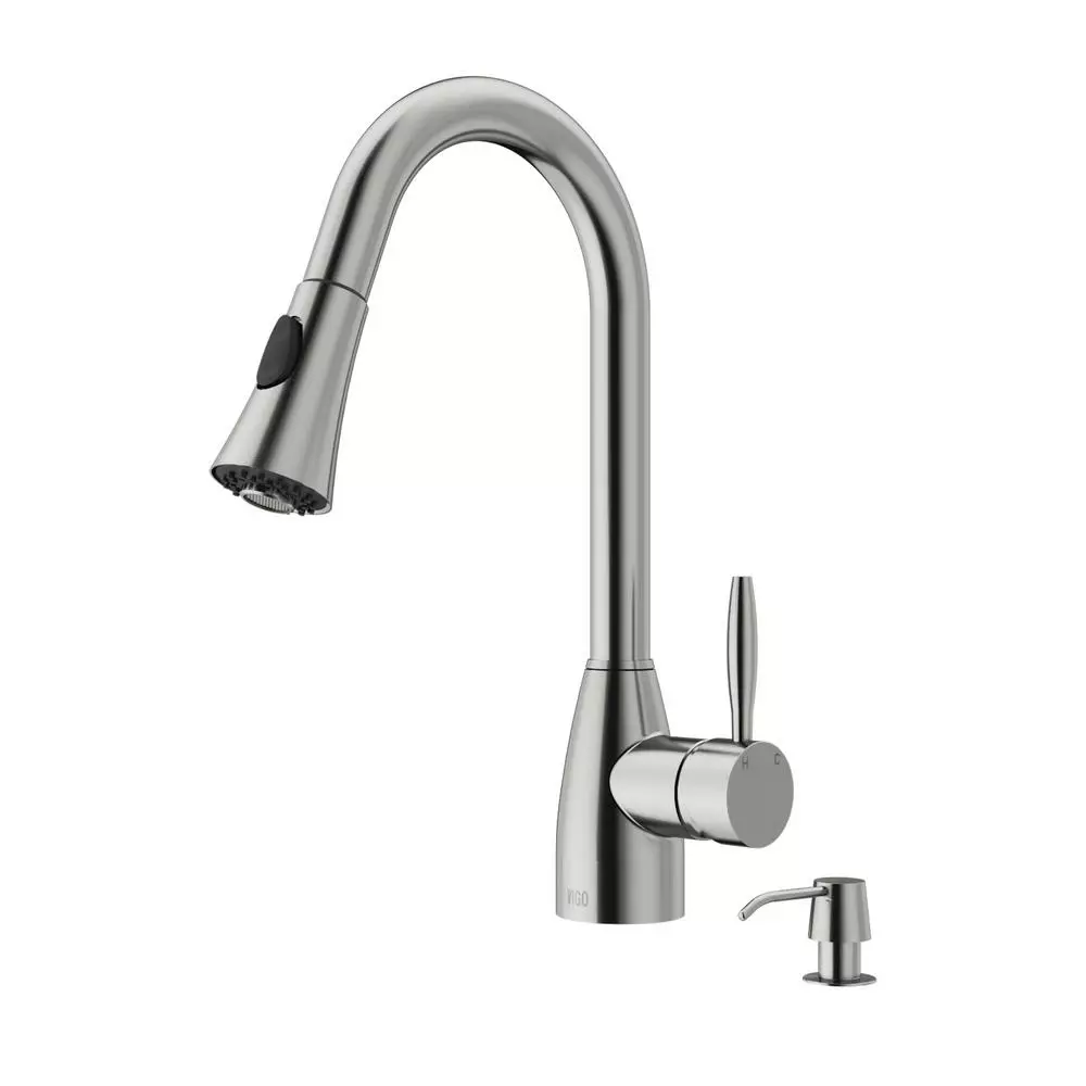 The VIGO Aylesbury Pull-Down Spray Kitchen Faucet is both versatile and specific. A retractable spray head with a 30 inch extension features a 360° swivel spout for practical modernism. The faucet’s dual function capabilities offer an aerated flow or powerful spray to satisfy all of your kitchen needs. An above-counter soap dispenser with a refillable 12 ounce reservoir that sits below the counter completes this set.