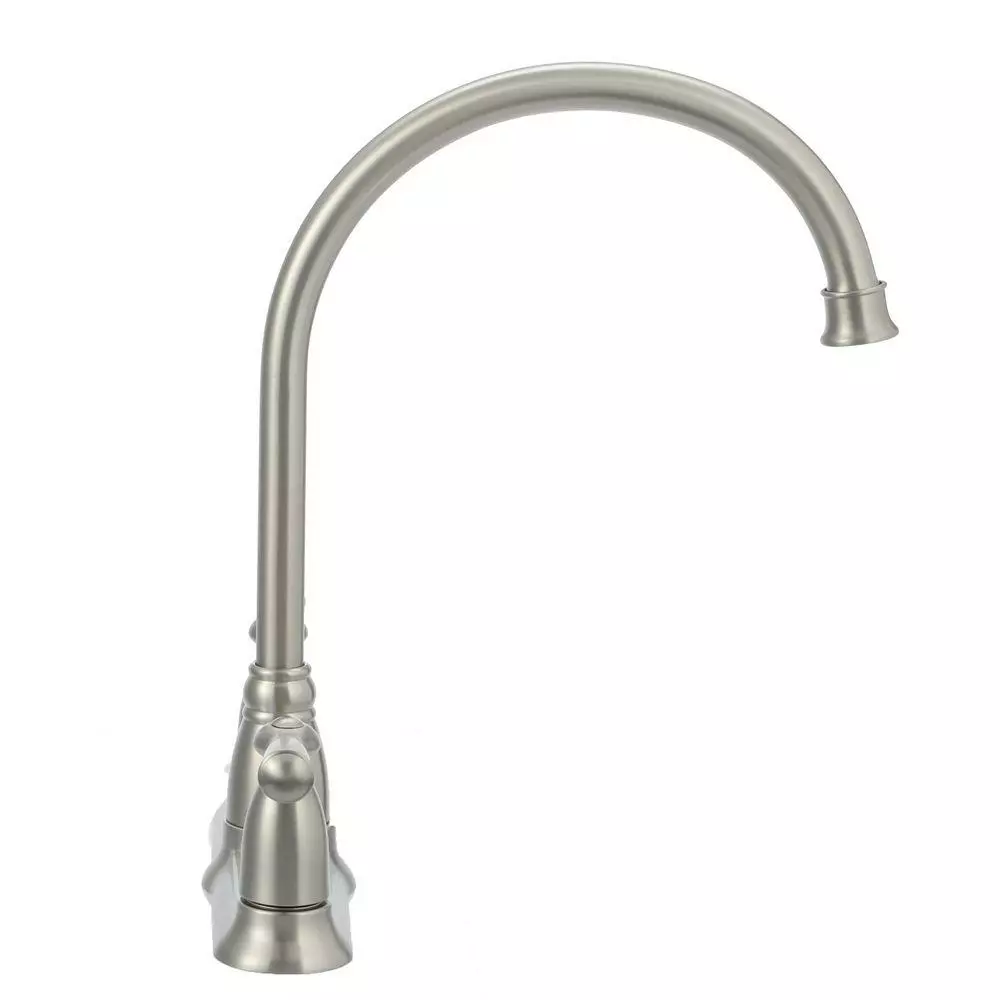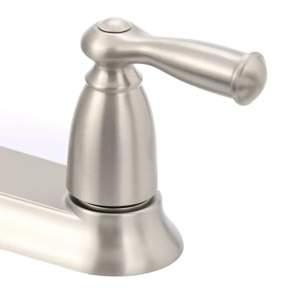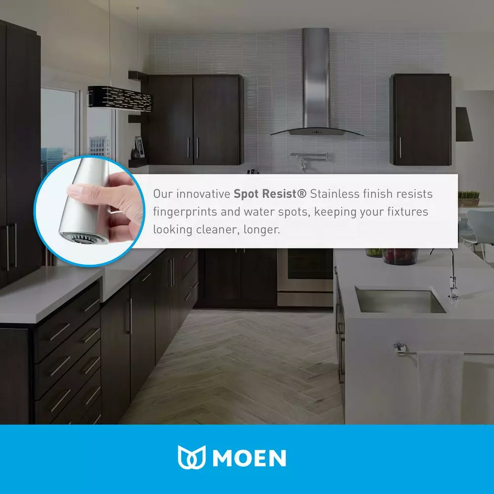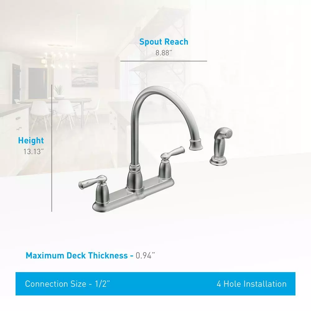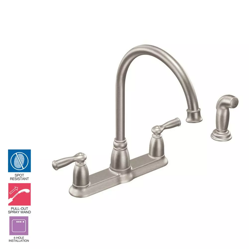The MOEN Banbury 2-Handle Kitchen Faucet is perfect for the busy kitchen with its conventional deck-mount design. Its Spot Resist finish helps repel fingerprints and water spots to maintain the brilliance of the original finish and wipe clean easily. The high-arc spout allows for greater clearance so you can wash large pots and pans. It includes a convenient side sprayer, ideal for washing large pots and pans, and rinsing the sink down afterwards.