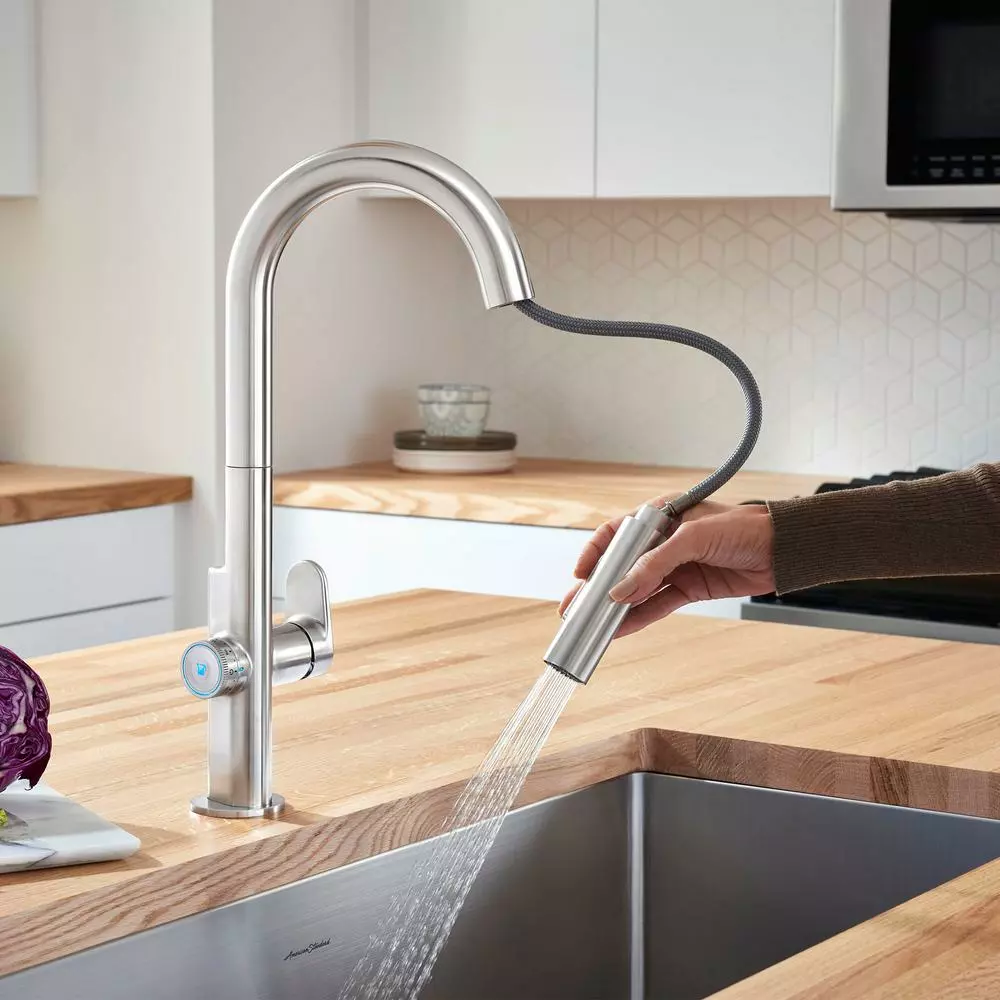 - Sleek, contemporary tube style design features a comfortable rounded handle shape and coin edge knurling on the faucet dial for extra grip – blue LED light illuminates when the faucet is in use