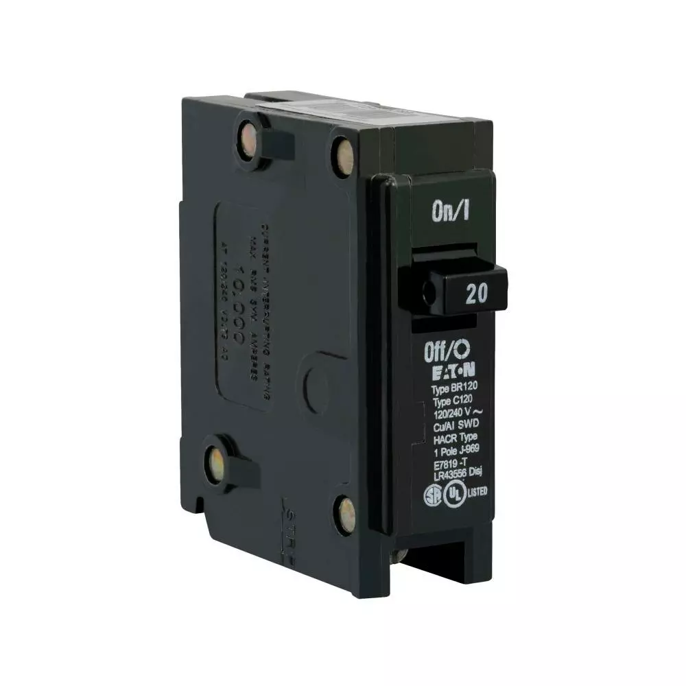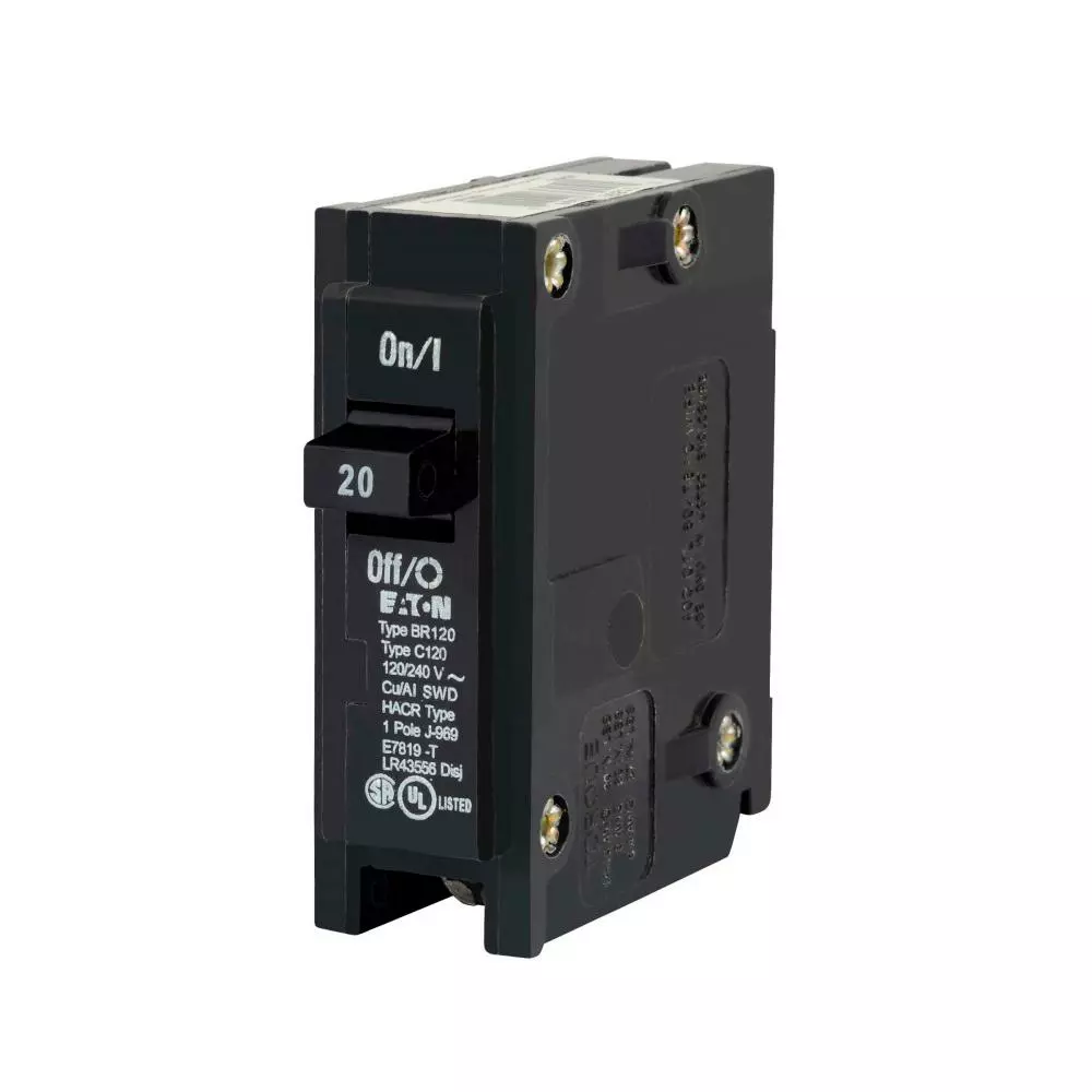 The Eaton Cutler-Hammer 20 Amp 1 in. Single-Pole Type BR Replacement Circuit Breaker is designed to protect house wires from overheating or causing a short-circuit. Single pole breaker applications include use with dishwashers, waste disposals, refrigerators, freezers, washing machines, televisions and window air conditioners. The UL-listed breaker is compatible with Westinghouse, Challenger and Bryant load centers and has a maximum load of 240-Volt.
