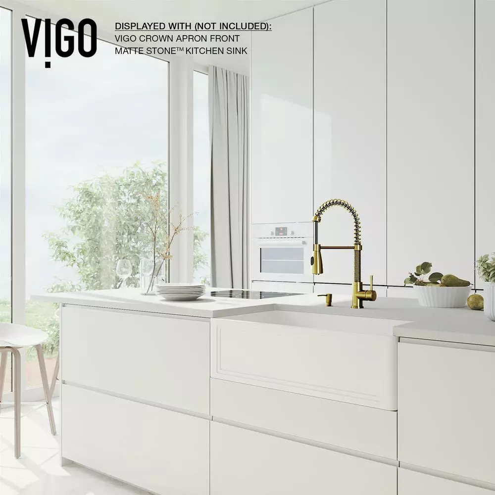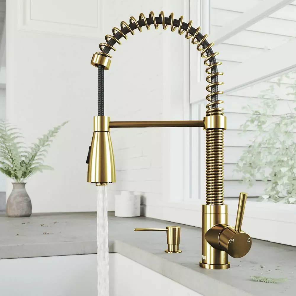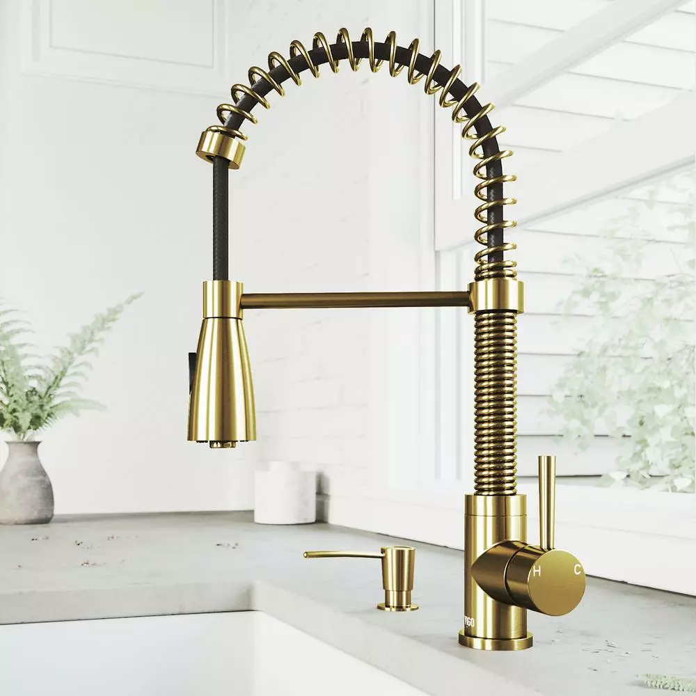 Engineering excellence meets creative hardware in the VIGO Brant Pull-Down Spray Kitchen Faucet and Soap Dispenser. The dual-function, pull-down spray head allows for either a powerful spray or an aerated flow and extends up to 30 in. with 360° swivel capabilities. The faucet is made from solid brass for top of the line construction and durability. High-end in every regard, this model comes complete with an in-counter soap dispenser that can refill up to 10 oz. of hand soap, dish soap, or hand lotion.