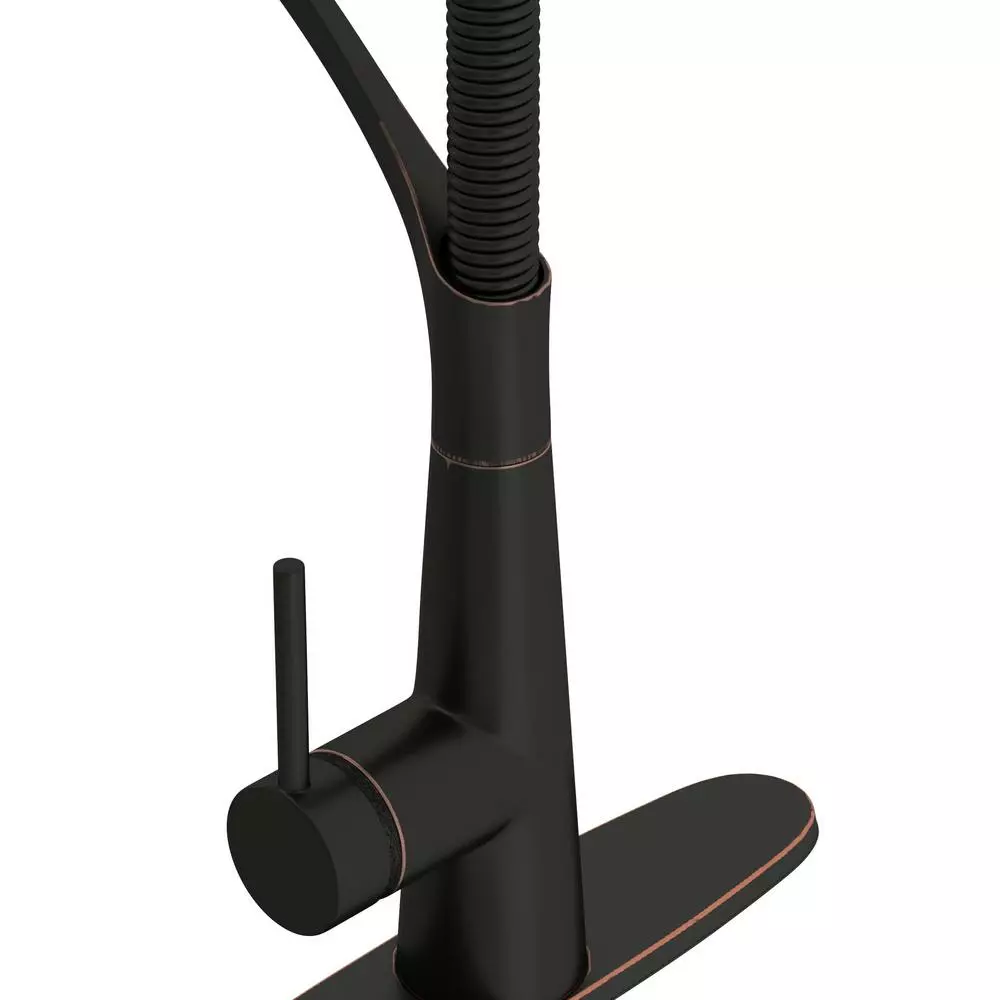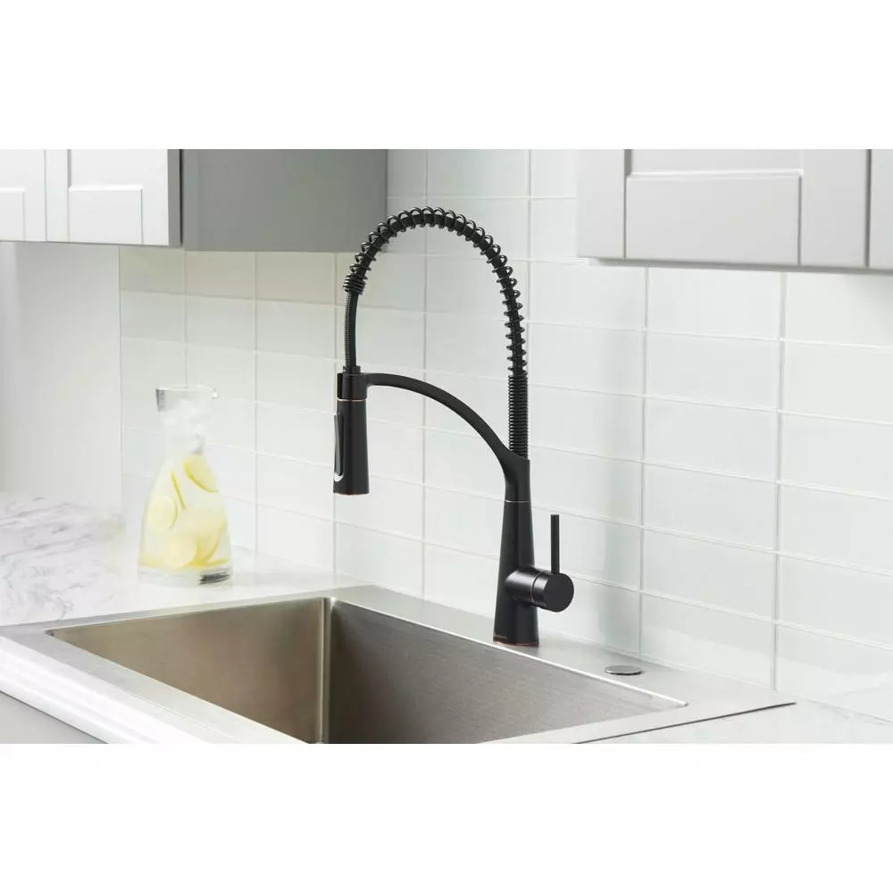 Enhance your kitchen with the professional style of this single-handle, pull-down kitchen faucet. Designed with a modern, oil-rubbed bronze finish, it features a spring-neck design for flexibility. The dual-function spray and stream offers additional versatility. Boasting a water-saving 1.8 GPM flow rate, this durable kitchen faucet includes quick connections and supply lines for easy installation on one- or three-hole sinks. It also comes with a drip-free cartridge and easy-clean removable coil.