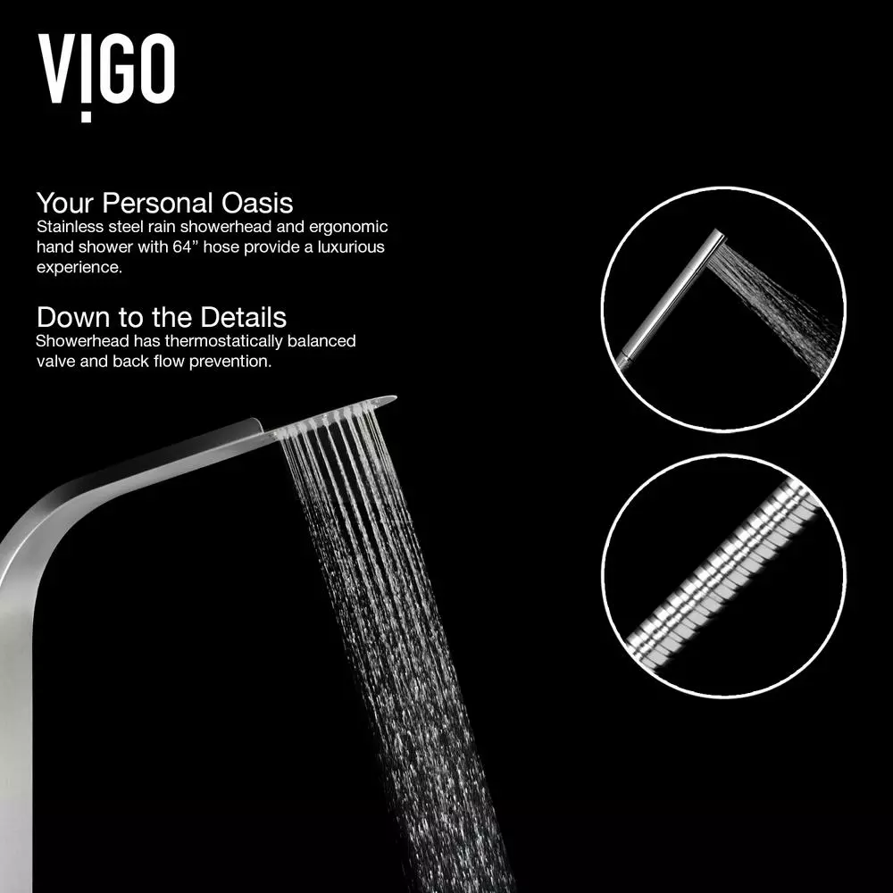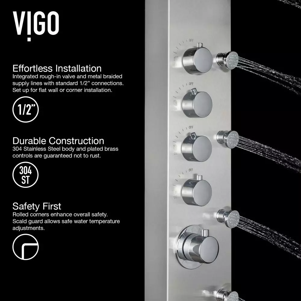 6 massage jets and a round rain showerhead make the VIGO Brielle Shower Massage Panel your ideal. Its stainless steel hand shower has a 58 in. chrome finished brass hose for easy maneuverability. For a truly invigorating, spa-like shower, simultaneously operate showerhead, massage jets and hand shower all together. Pre-plumbed for easy installation, this shower panel is sure to transform your entire shower experience.