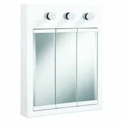 The Design House 532374 Concord White Gloss Lighted Medicine Cabinet Mirror features a durable white gloss finish, concealed adjustable hinges and satin nickel hardware. This triple door cabinet measures 24 in. by 5 in. by 30 in. for ample storage space while the three vanity lights brighten up your entire bathroom. This medicine cabinet features a traditional motif with a bright finish and clean lines, sure to quickly revamp your bathroom. The cabinet doors glide open revealing dual shelves to store shampoo, medicine and makeup. This mirror will resist chipping or staining in steamy bathrooms. Use this mirror for shaving or applying makeup in the morning. The Design House 532374 Concord White Gloss Lighted Medicine Cabinet Mirror has a 1-year limited warranty that protects against defects in materials and workmanship.