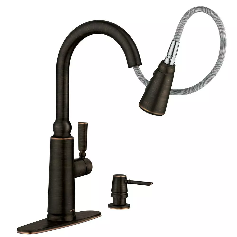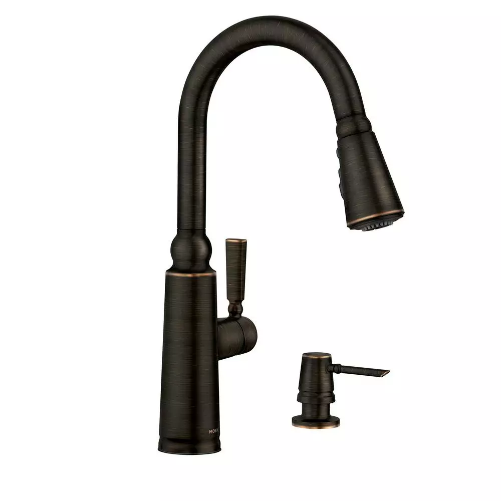 Unique decorative touches and intricate design details give the Coretta pulldown kitchen faucet a sophisticated feel. The faucet features MOEN’s Power Boost technology, which provides a faster clean and a faster fill with the push of a button, while the pulldown hose offers the Reflex system for smooth operation and secure docking of the spray wand. Coretta also offers a matching soap dispenser for fully coordinated convenience. Available in a Mediterranean Bronze finish.