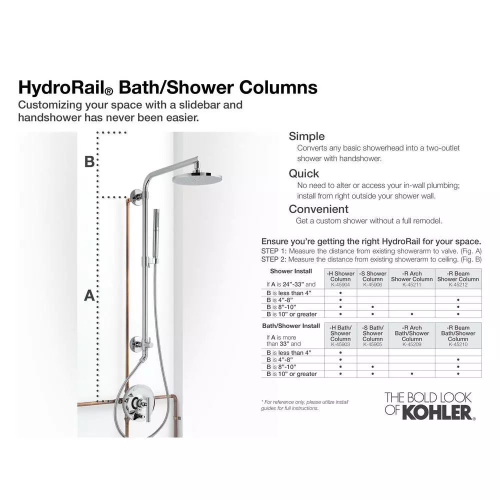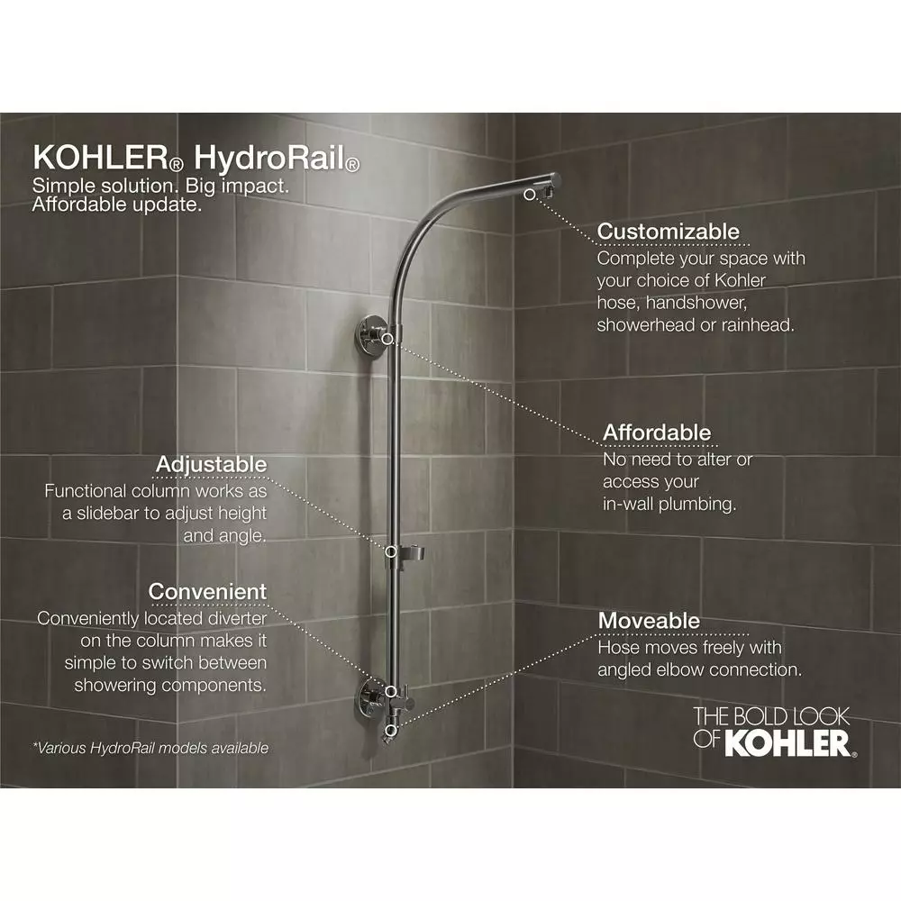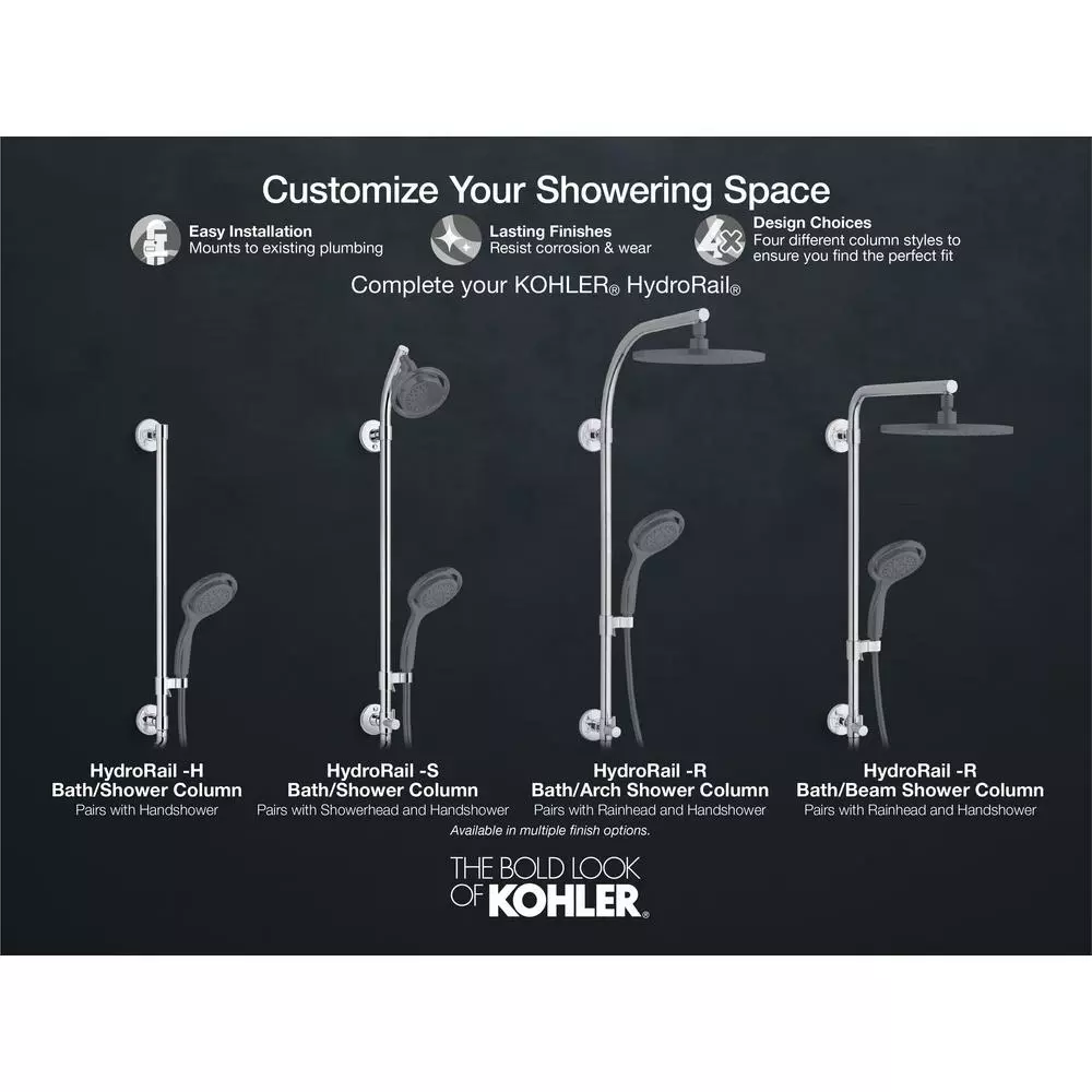 - Includes K-72419 Awaken showerhead, K-72415 Awaken hand shower, K-45906 HydroRail-S shower column, and K-45982 Awaken 60 in. ribbon hose