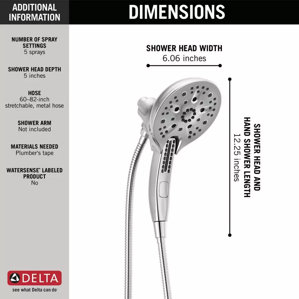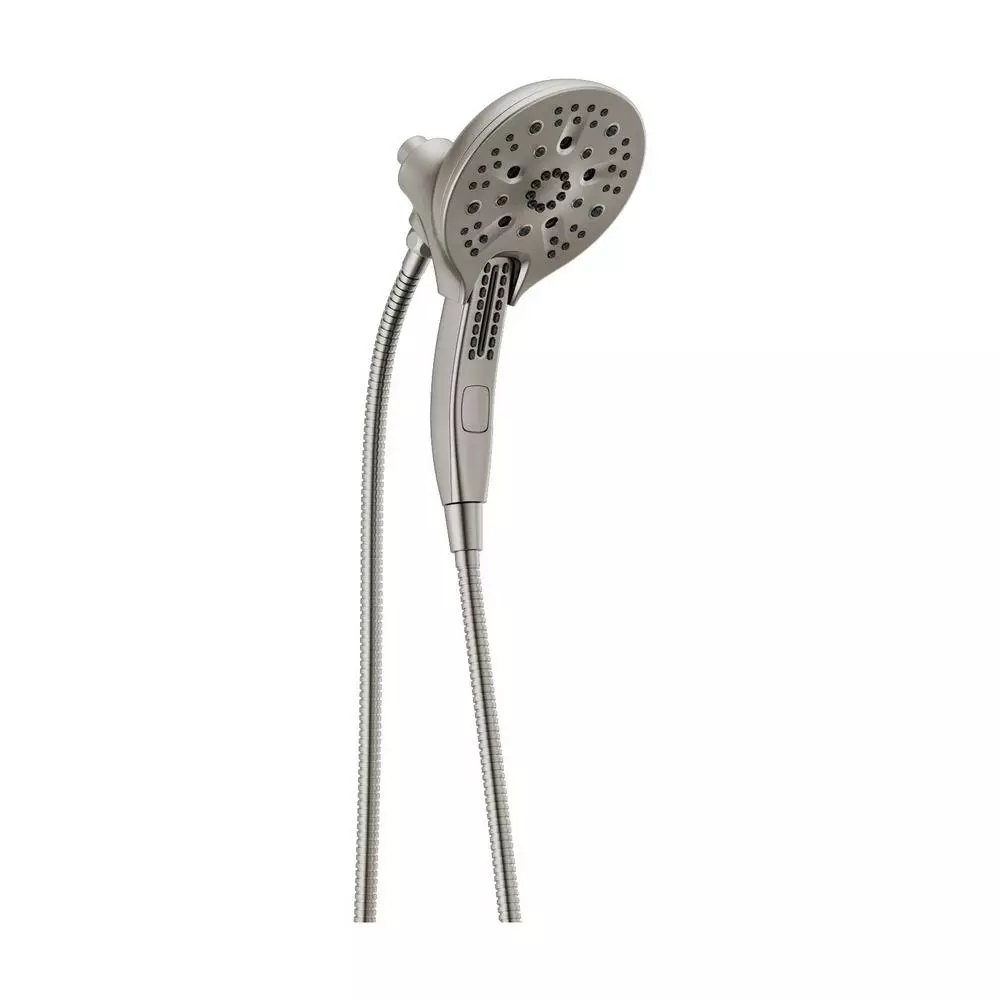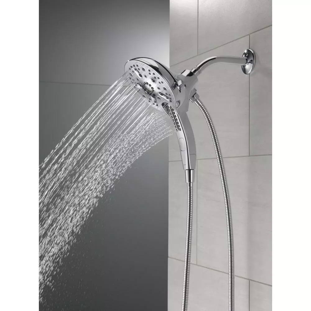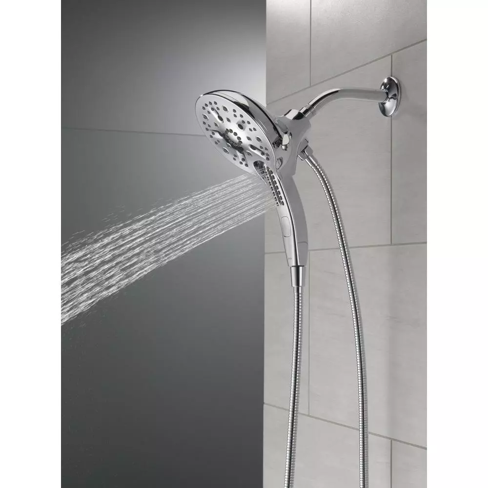 The Delta In2ition Two-in-One Shower features a detachable hand shower which can be used separately from or simultaneously with the shower head. This integrated dual-functionality gives you maximum flexibility without sacrificing warmth, as you can choose to have water streaming from the shower head only, the hand shower only or both the shower head and hand shower at once. Delta H2Okinetic PowerDrench Showers are powered by an innovative technology that sculpts the water into a unique wave pattern, giving you the feeling of more water without using more water and creating a shower with more warmth, coverage and intensity. So go ahead and indulge, because now you can enjoy the feeling of more water without using more water. Delta MagnaTite Docking uses a powerful integrated magnet to pull your faucet spray wand or In2ition hand shower precisely into place and hold it there so it stays docked when not in use. While other products may gather unsightly mineral build-up over time, Delta soft rubber Touch-Clean spray holes allow any mineral residue to simply be wiped away for an instantly refreshed look – with no need for soaking or the aid of chemical cleaners. The pause setting gives you ample space for shaving, lathering and other shower tasks, without worrying about overspray or water waste. This spray setting helps you conserve water, so you can worry less about depleting your supply of hot water – and you help the environment too.
