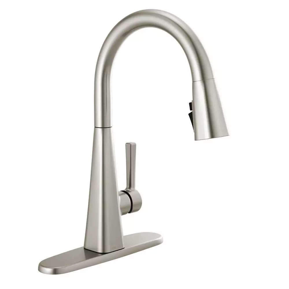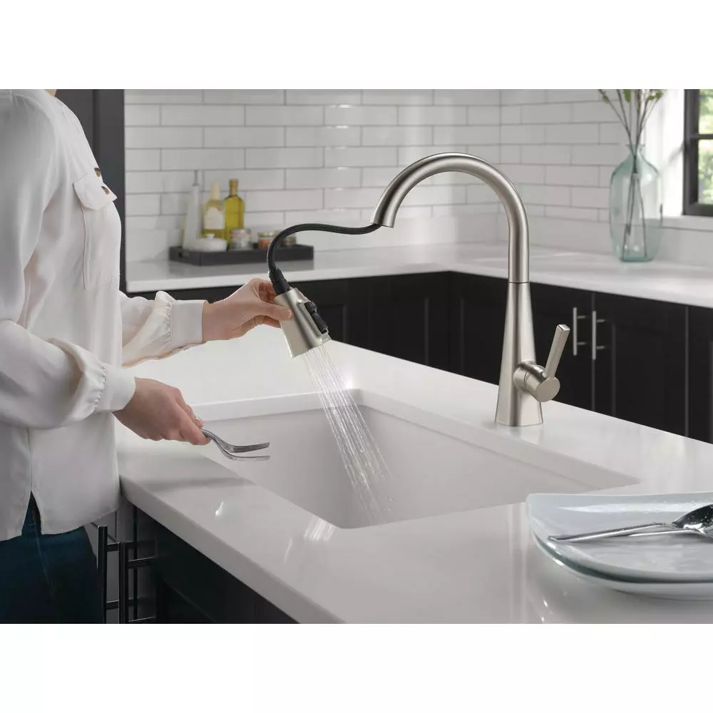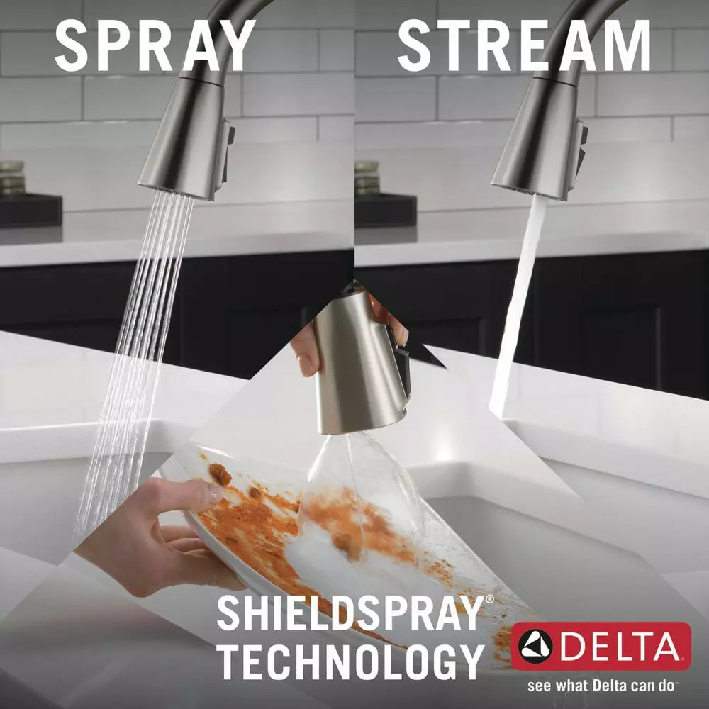 Kitchen sink faucets with Touch-Clean Spray Holes allow you to easily wipe away calcium and lime build-up with the touch of a finger. Delta ShieldSpray Technology cleans with laser-like precision while containing mess and splatter. A concentrated jet powers away stubborn messes while an innovative shield of water contains splatter and clears off the mess, so you can spend less time soaking, scrubbing and shirt swapping. Delta SpotShield Technology helps to keep your kitchen faucet cleaner, longer by resisting water spots and fingerprints. Keep your space spotless with SpotShield Technology, available across a variety of finishes for the kitchen and bath. Delta kitchen faucets with DIAMOND Seal Technology perform like new for life with a patented design which reduces leak points, is less hassle to install and lasts twice as long as the industry standard. Kitchen sink faucets with Touch-Clean Spray Holes allow you to easily wipe away calcium and lime build-up with the touch of a finger. You can install with confidence, knowing that Delta kitchen faucets are backed by our Lifetime Limited Warranty. Industry standard is based on ASME A112.18.1 of 500,000 cycles.