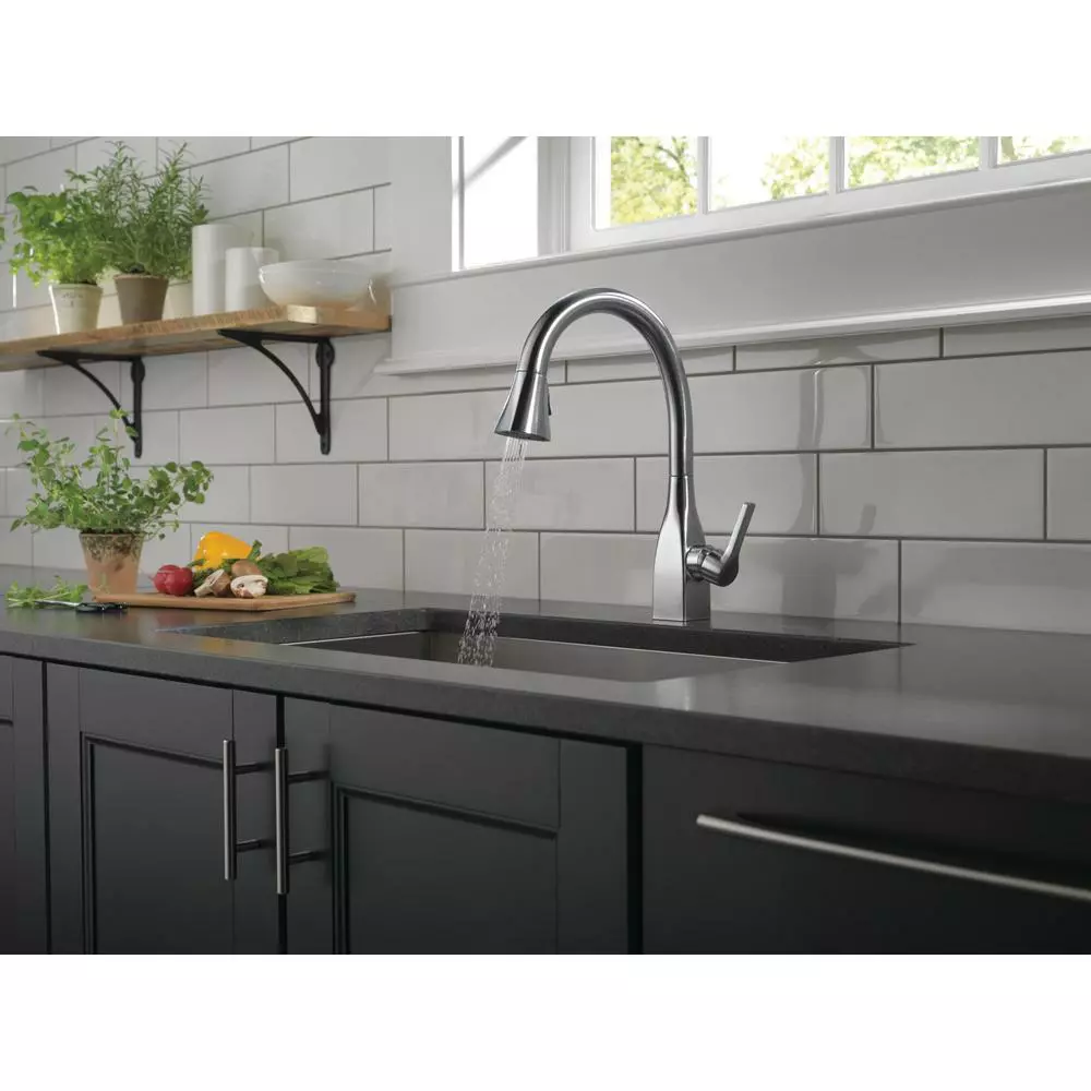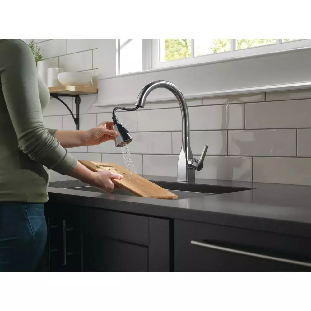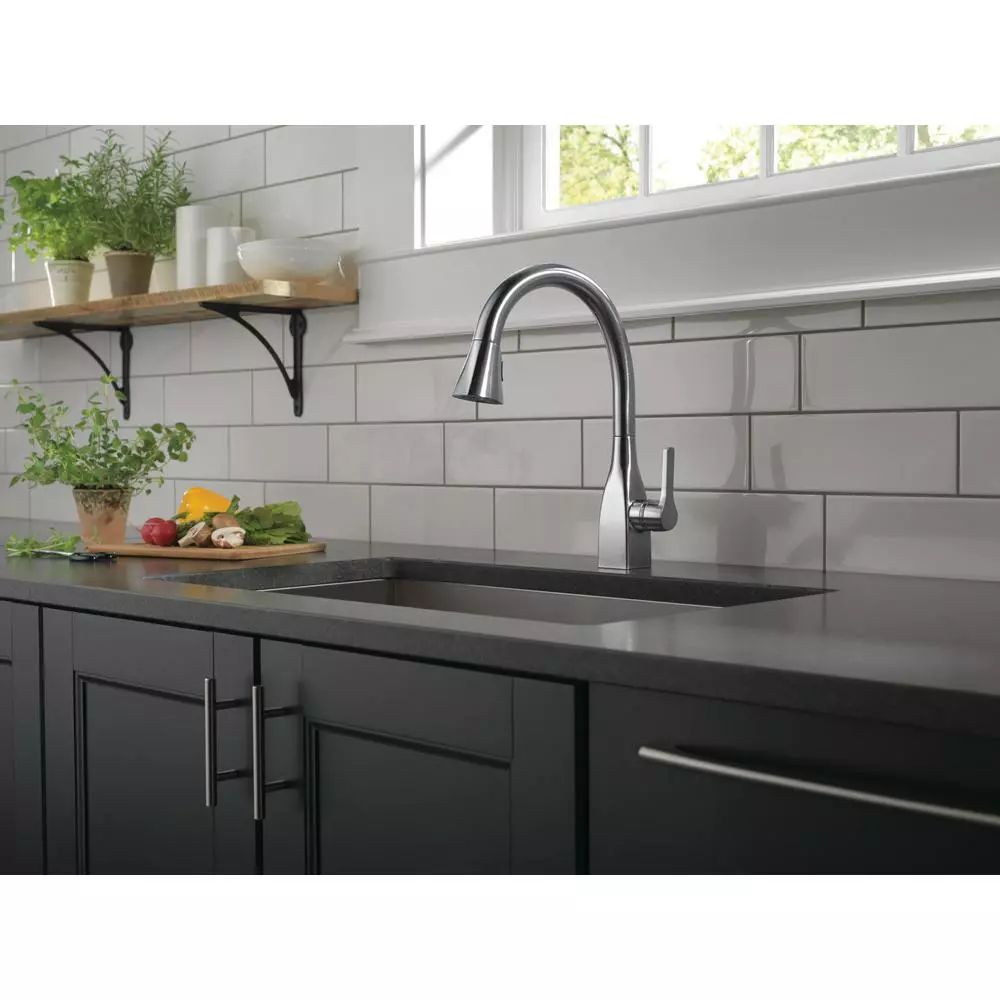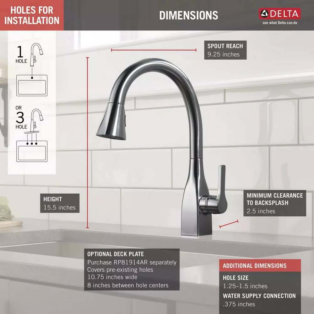 Delta ShieldSpray Technology cleans with laser-like precision while containing mess and splatter. A concentrated jet powers away stubborn messes while an innovative shield of water contains splatter and clears off the mess, so you can spend less time soaking, scrubbing and shirt swapping. Delta faucets with DIAMOND Seal Technology perform like new for life with a patented design which reduces leak points, is less hassle to install and lasts twice as long as the industry standard. Kitchen faucets with Touch-Clean Spray Holes allow you to easily wipe away calcium and lime build-up with the touch of a finger. You can install with confidence, knowing that Delta faucets are backed by our Lifetime Limited Warranty. Industry standard is based on ASME A112.18.1 of 500,000 cycles.