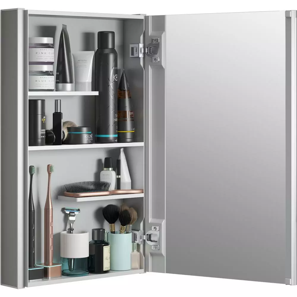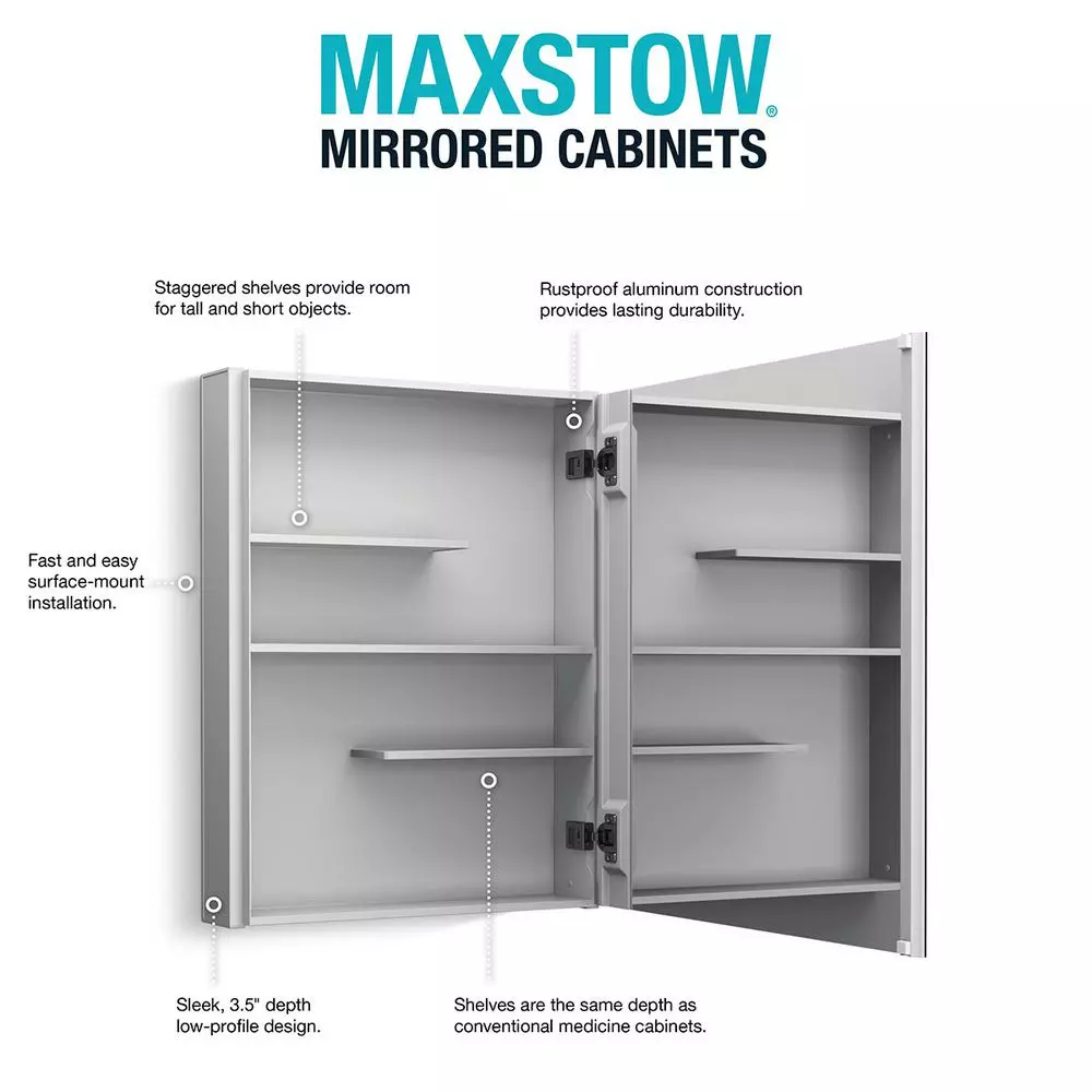 Maximize your bathroom storage with the Maxstow medicine cabinet. Staggered shelving holds tall and short items with no wasted space, fitting everything you need and keeping clutter off your countertop. The slim 3-1/2 in. -deep design provides the same internal storage space as traditional 5 in. -deep cabinets. Installation is fast and easy simply screw to the wall, right out of the box.