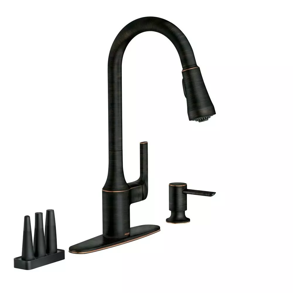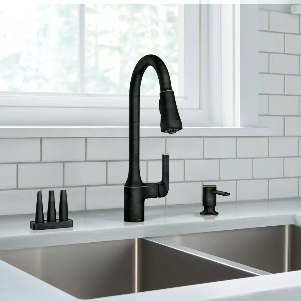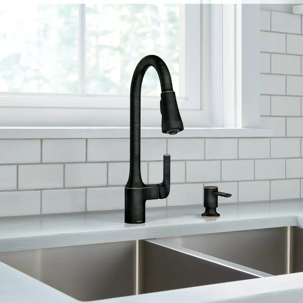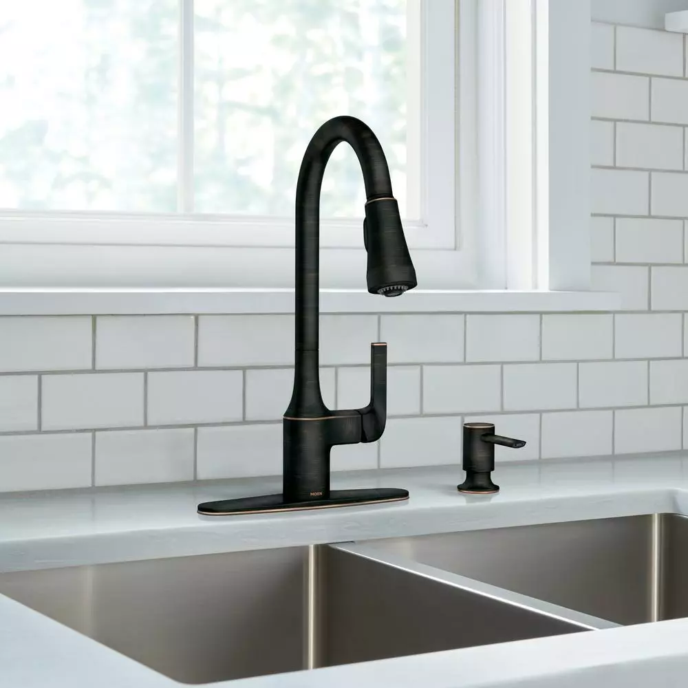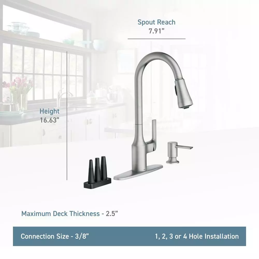 The timeless yet fashion-forward design of the Milton pulldown kitchen faucet offers a flexible, detailed look that is complementary to a variety of kitchen styles. The fixture features MOEN’s Power Clean spray technology, which cleans 50% faster than MOEN faucets without the technology, and includes 3 additional Power Clean attachments to provide multiple, focused spray options for hard-to-clean items. It also comes equipped with MOEN’s Reflex system to ensure smooth operation and secure docking of the spray wand, as well as a matching soap dispenser for a coordinated appearance.