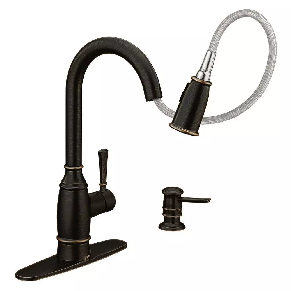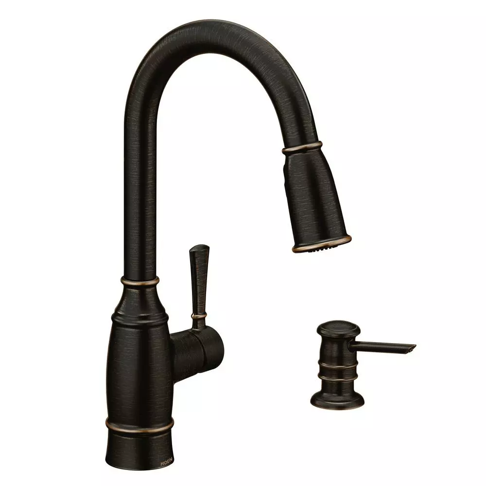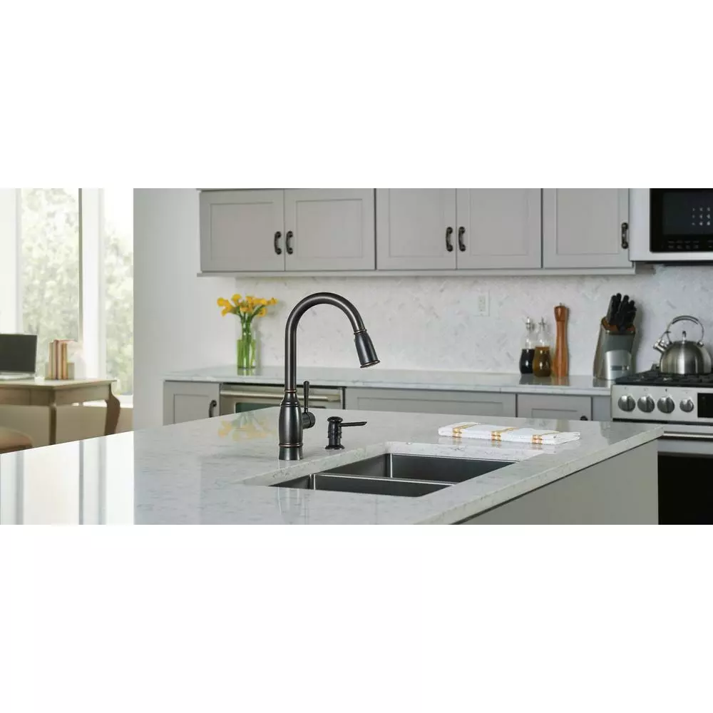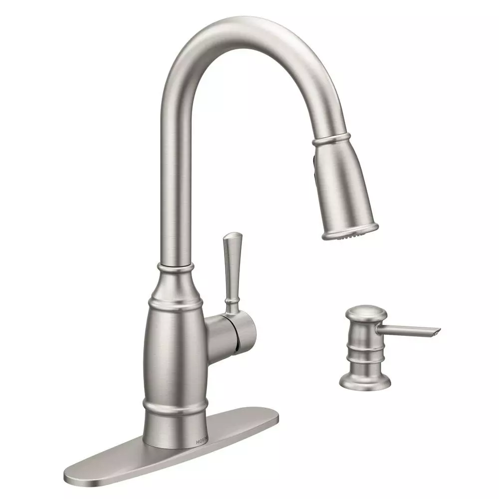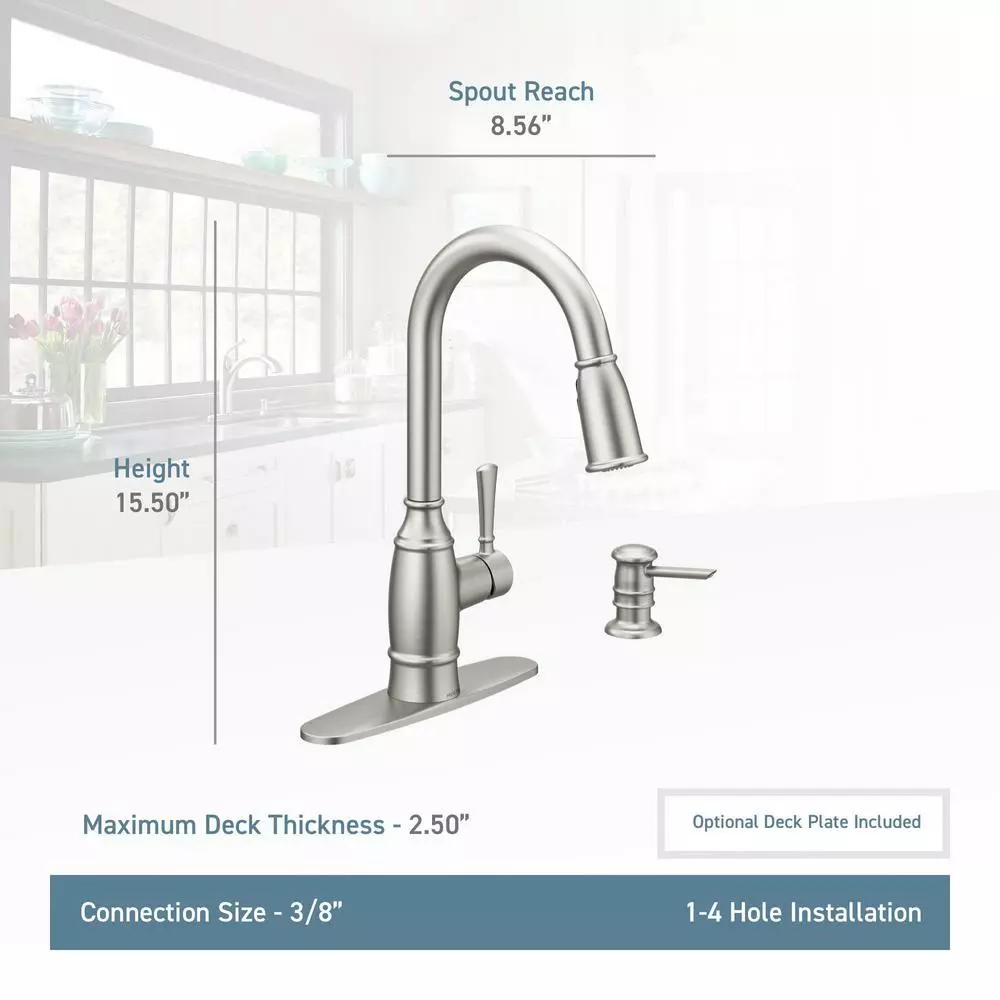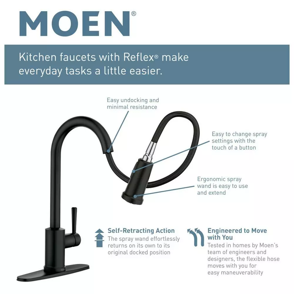 The MOEN Noell 1-Handle Pull-Down Sprayer Kitchen Faucet was designed with attention to detail. The Noell collection embodies elaborate traditional designs to enhance the style and design of any home. This faucet has a convenient pull-down sprayer and swivel spout that enables you to reach every corner of your sink. Reflex system for smooth operation.