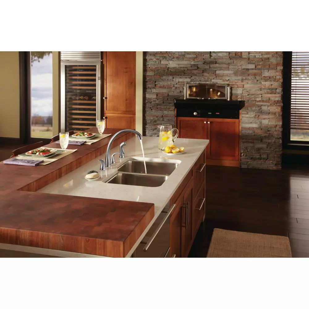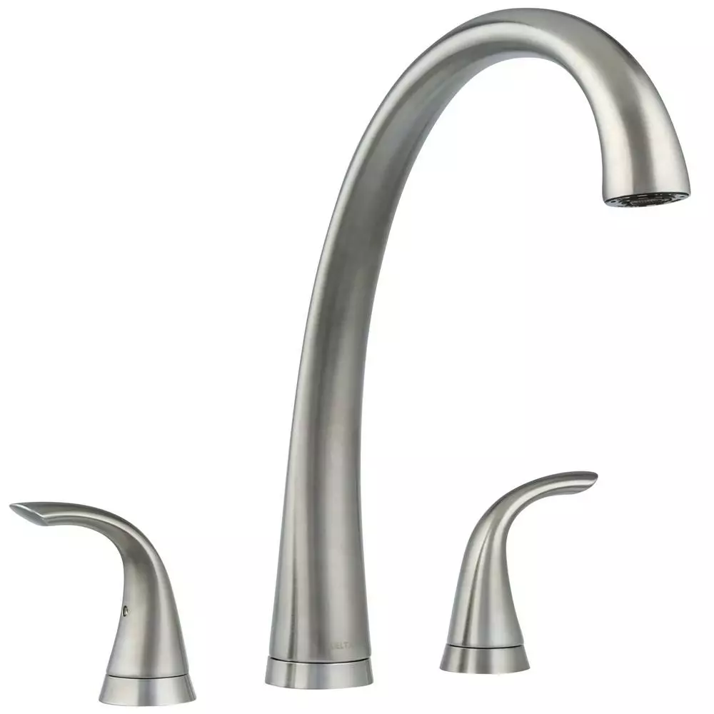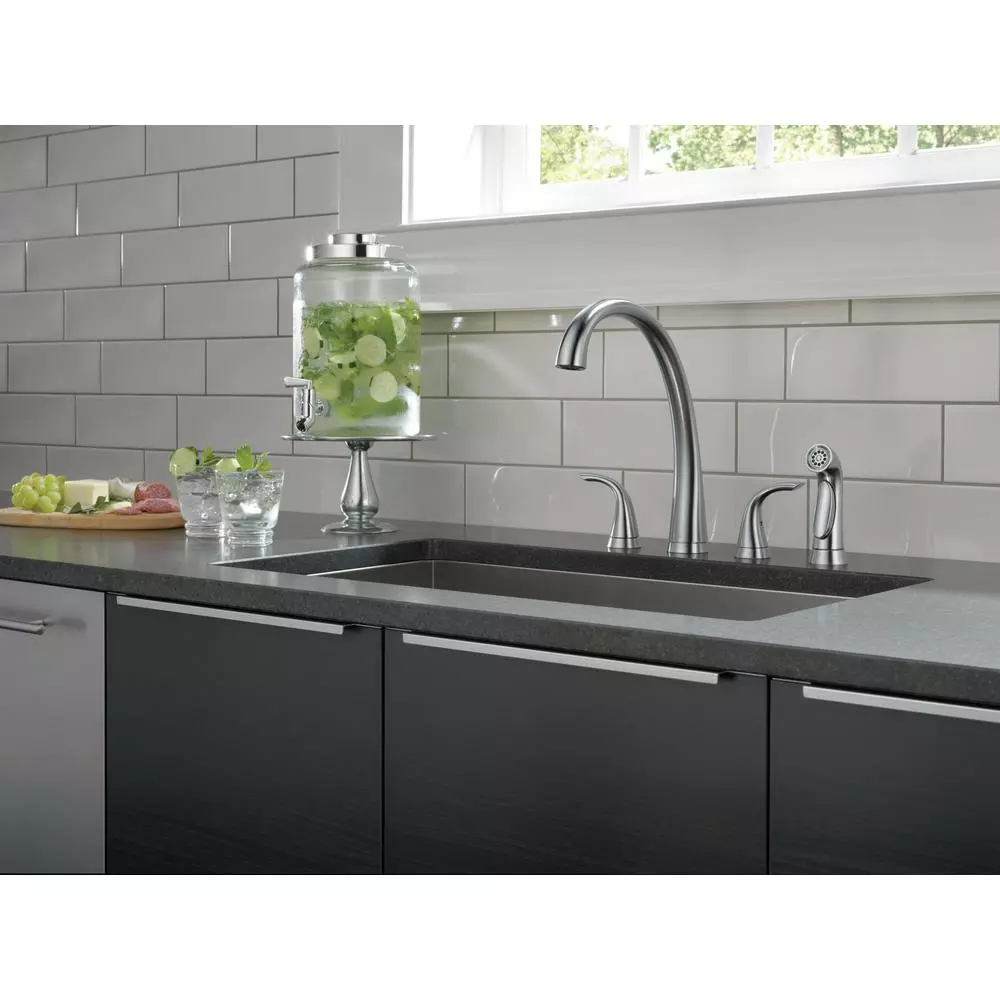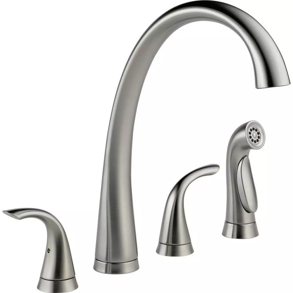 Inspired by a fusion of technology and nature, this Pilar Two Handle Kitchen Faucet with Spray in Arctic Stainless offers sweeping lines with advanced functionality. Delta’s exclusive DIAMOND Seal Technology uses a valve with a tough diamond coating. InnoFlex PEX waterways keep water inside the faucet out of contact with potential metal contaminants. This powerful combination brings you a faucet built to last up to 5 million uses. The color-matched side sprayer can be used for washing vegetables and also for washing down the sink.