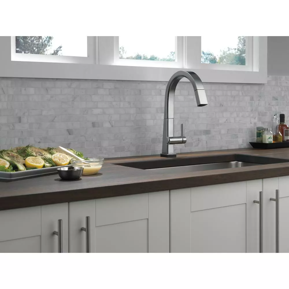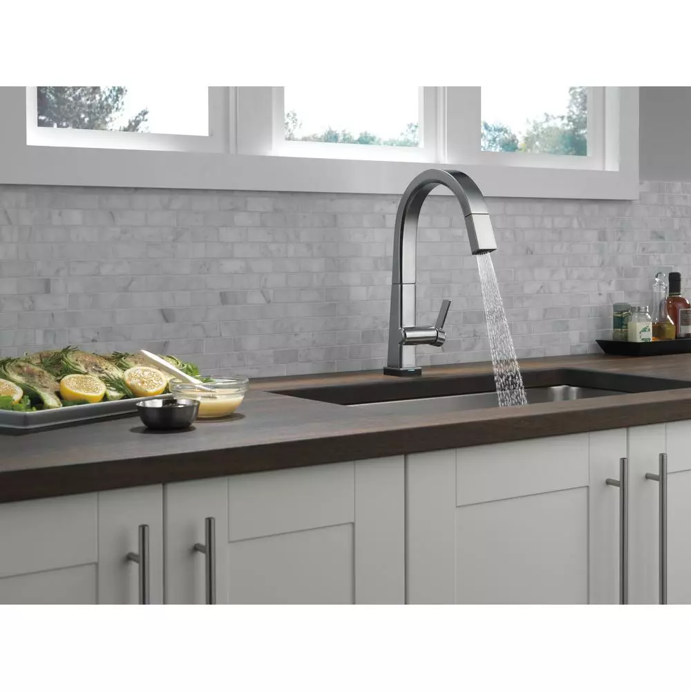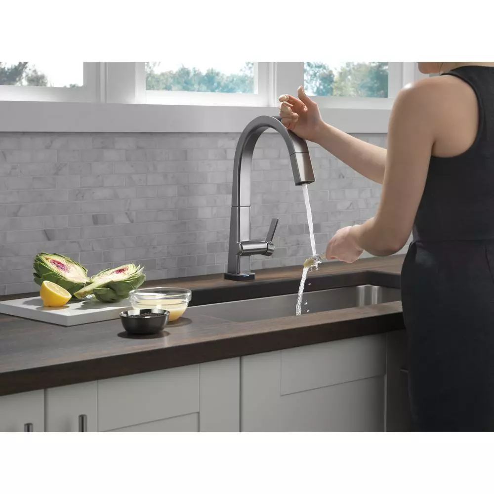The confident slant of the Pivotal Collection makes it a striking addition to your kitchens contemporary geometry for a look that makes a statement. Touch it on. Touch it off. Whether you have two full hands or 10 messy fingers, Delta Touch2O Technology helps keep your faucet clean, even when your hands aren’t. A simple touch anywhere on the spout or handle with your wrist or forearm activates the flow of water at the temperature where your handle is set. The Delta TempSense LED light changes color to alert you to the waters temperature and eliminate any possible surprises or discomfort. Delta MagnaTite Docking uses a powerful integrated magnet to pull your faucet spray wand precisely into place and hold it there so it stays docked when not in use. Delta faucets with DIAMOND Seal Technology perform like new for life with a patented design which reduces leak points, is less hassle to install and lasts twice as long as the industry standard. You can install with confidence, knowing that Delta faucets are backed by our Lifetime limited warranty. Electronic parts are backed by our 5-year electronic parts warranty. Industry standard is based on ASME A112.18.1 of 500,000 cycles.