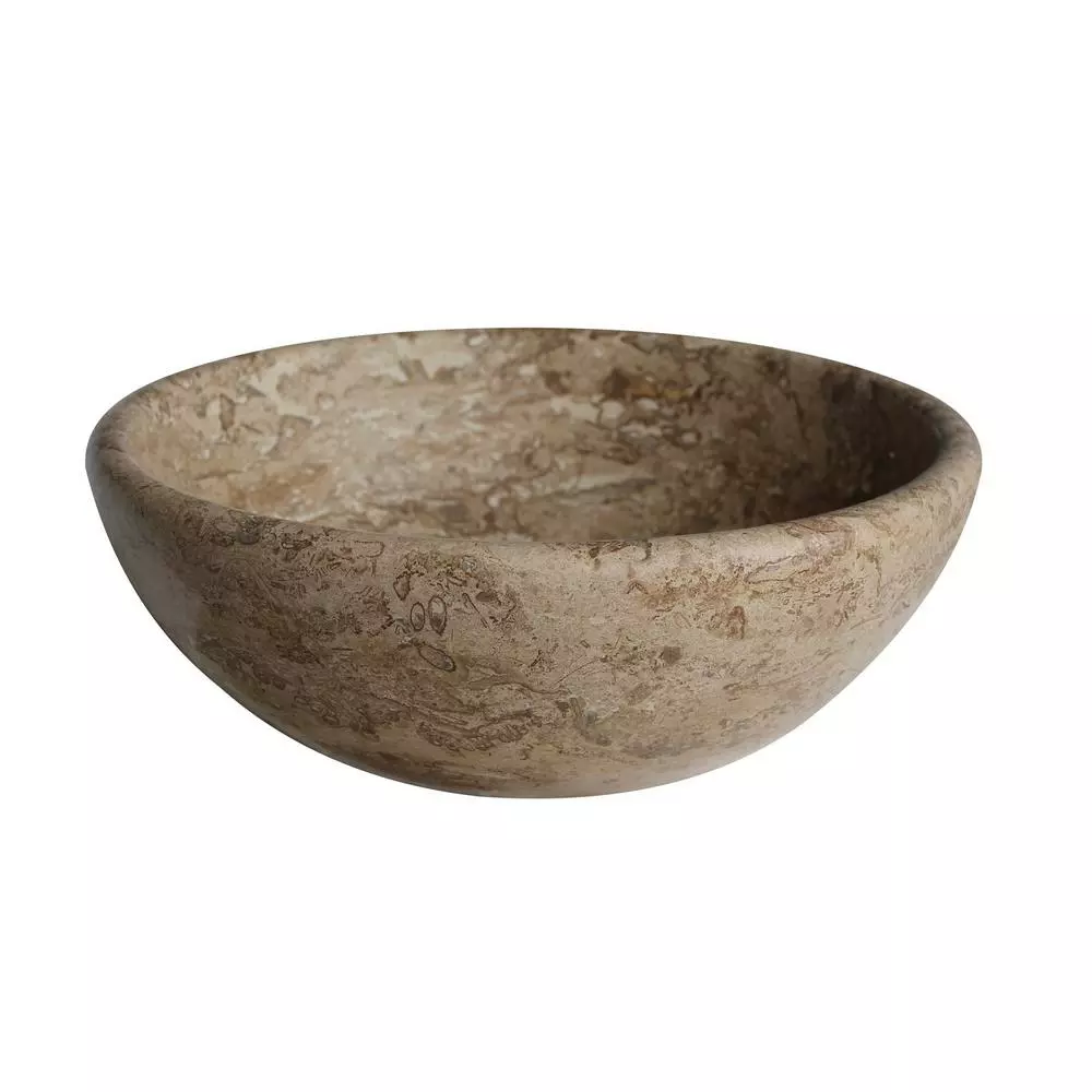 Add a luxurious accent to your bathroom project with a TashMart Round Natural Stone Vessel Sink in Almond Brown. This unique hand-crafted sink is carved from 1 solid piece of natural travertine. Each sink is a unique work of art. The sink’s classic design can work with a variety of countertops and bases allowing you to create a customized design to fit your bathroom.