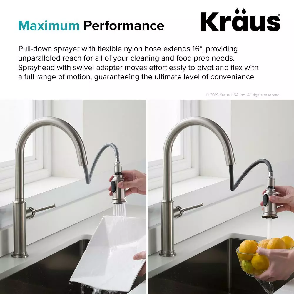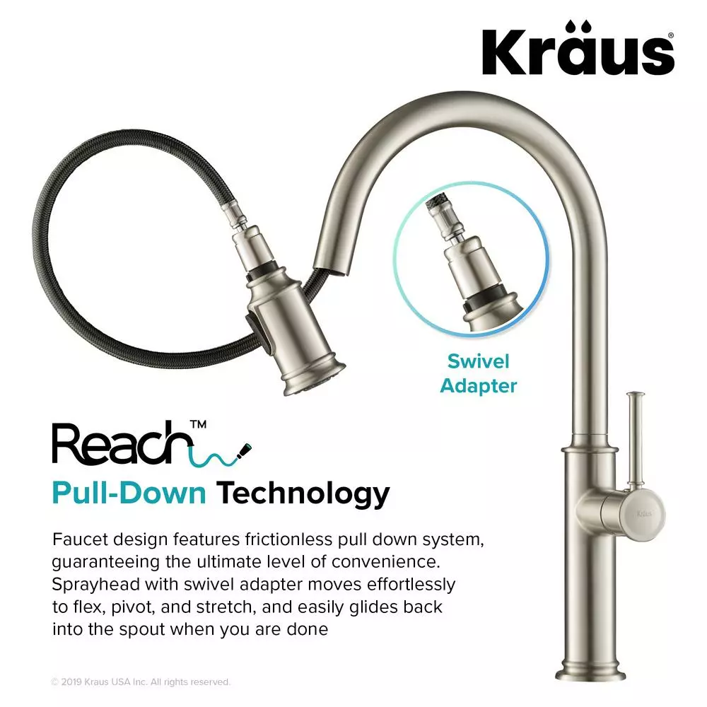 - Pull-Down System with Reach™ Technology: State-of-the-art spout, swivel sprayhead connector, and counterweight offer frictionless performance. Sprayhead moves effortlessly to flex, pivot, stretch, and easily glide back into the spout
