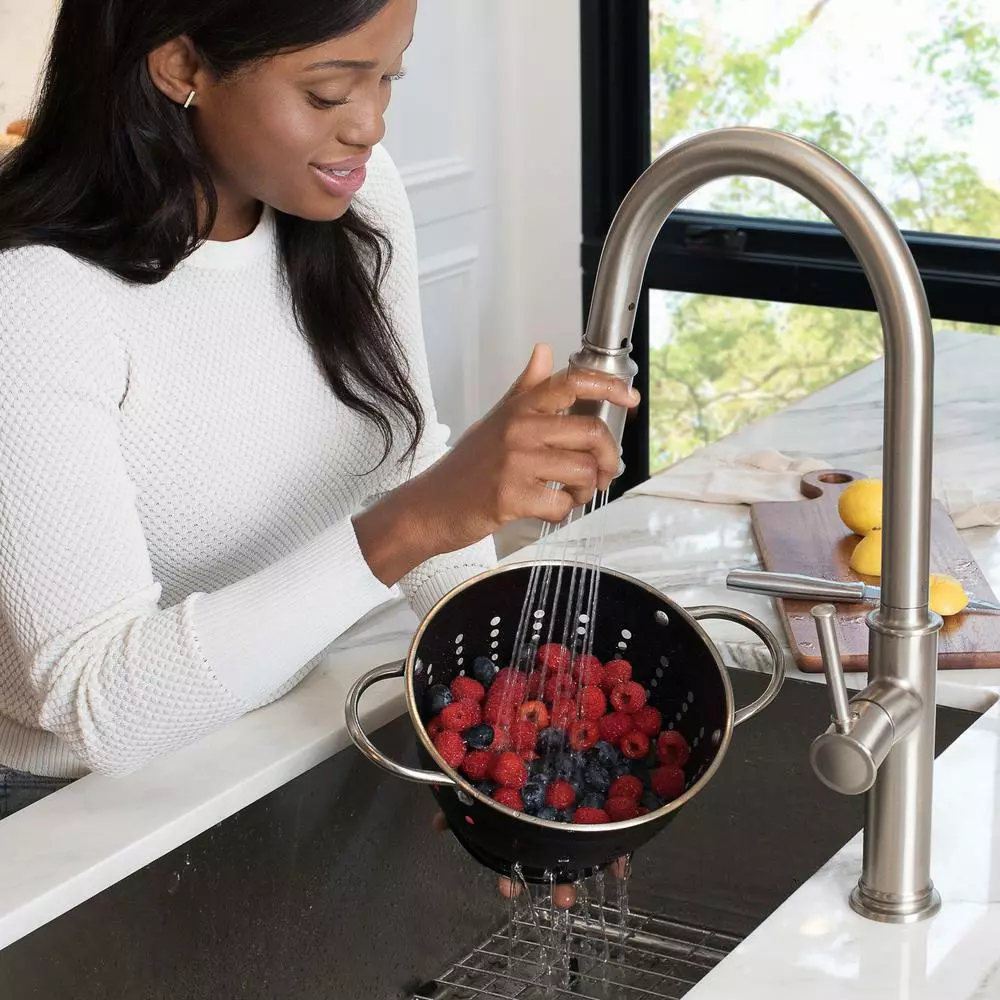 - Secure Docking Mechanism: Sprayhead securely clicks into place, with no drooping over time. Under-sink counterweight offers smooth retraction and a stable hold