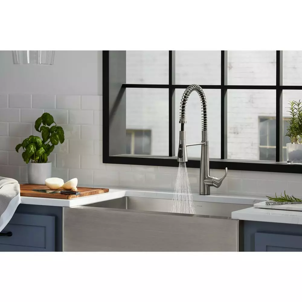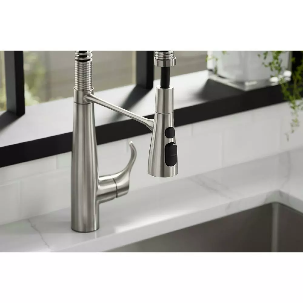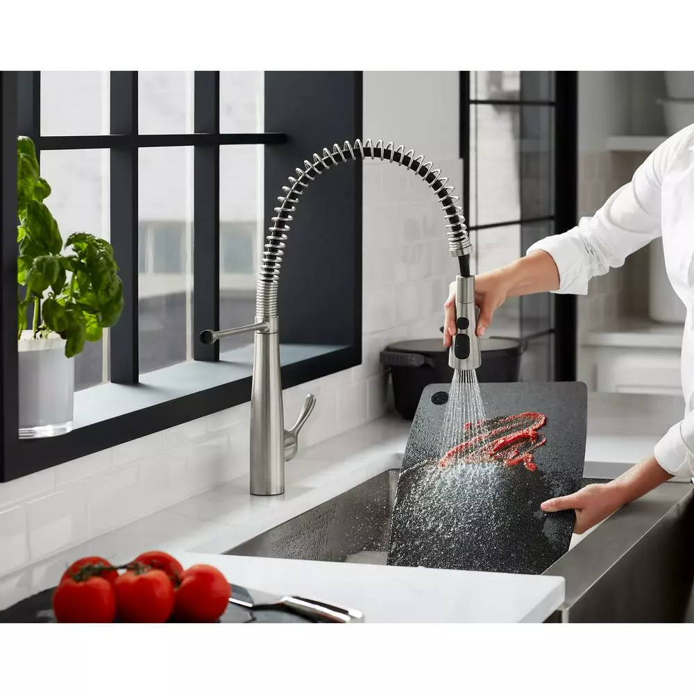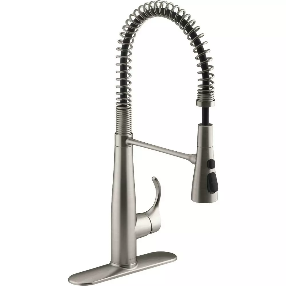 Work like a pro in the kitchen. Inspired by professional kitchens, the Simplices faucet brings elegant design and exceptional ergonomics to home chefs. The pull-down spray head lets you switch between 3 functions with pushbutton ease: an aerated stream for filling pots and pitchers; Sweep spray for cleaning; and Boost function for increased flow. The high-arching coil spring removes for easy cleaning.
