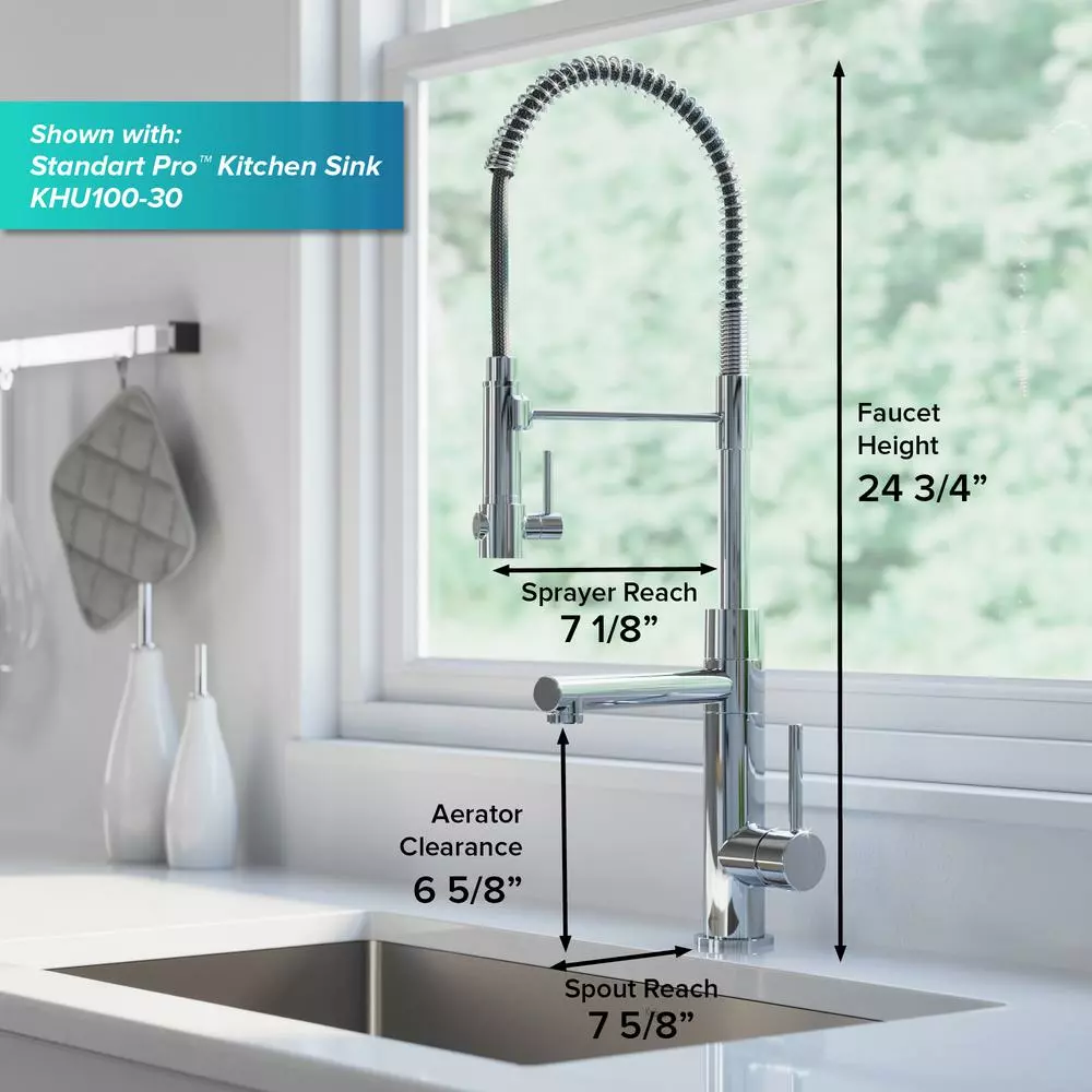 - DIMENSIONS: Faucet Height: 24 3/4 in., Spout Height: 6 5/8 in., Spout Reach 7 5/8 in., Sprayer Height 11 1/4 in., Sprayer Reach 7 1/8 in.