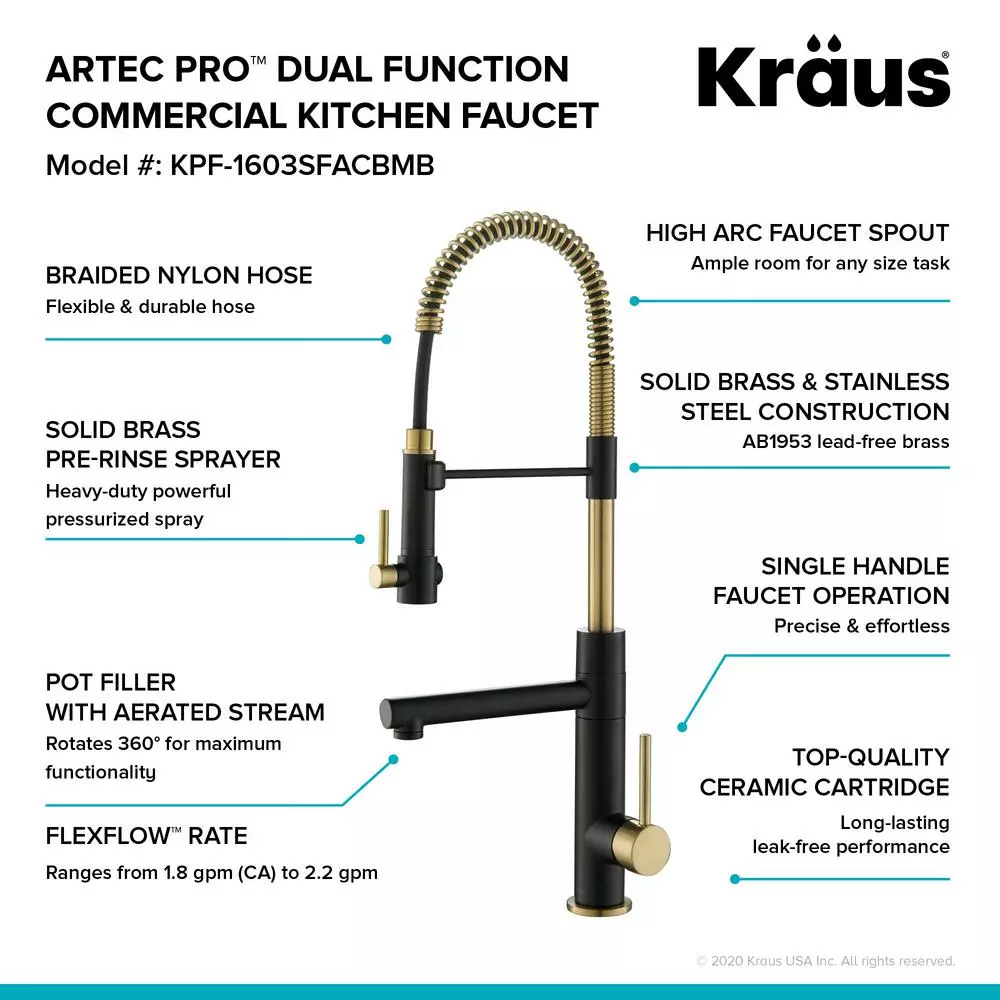 Designed for powerful performance and lasting style, Artec Pro simplifies everyday tasks with a multifunctional design. This faucet features a pre-rinse sprayer to blast away food residue and a rotating pot filler for quick fill-ups of pots and pitchers. Waterlines pre-attached for easy install.