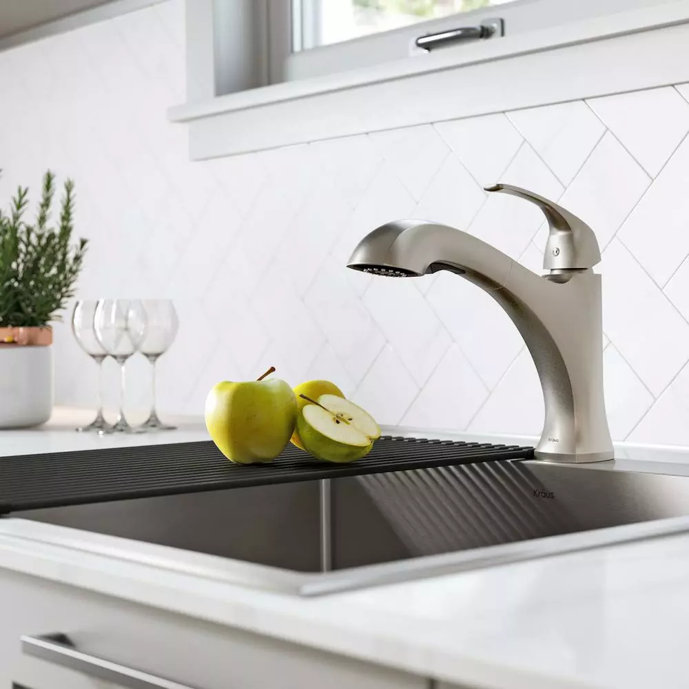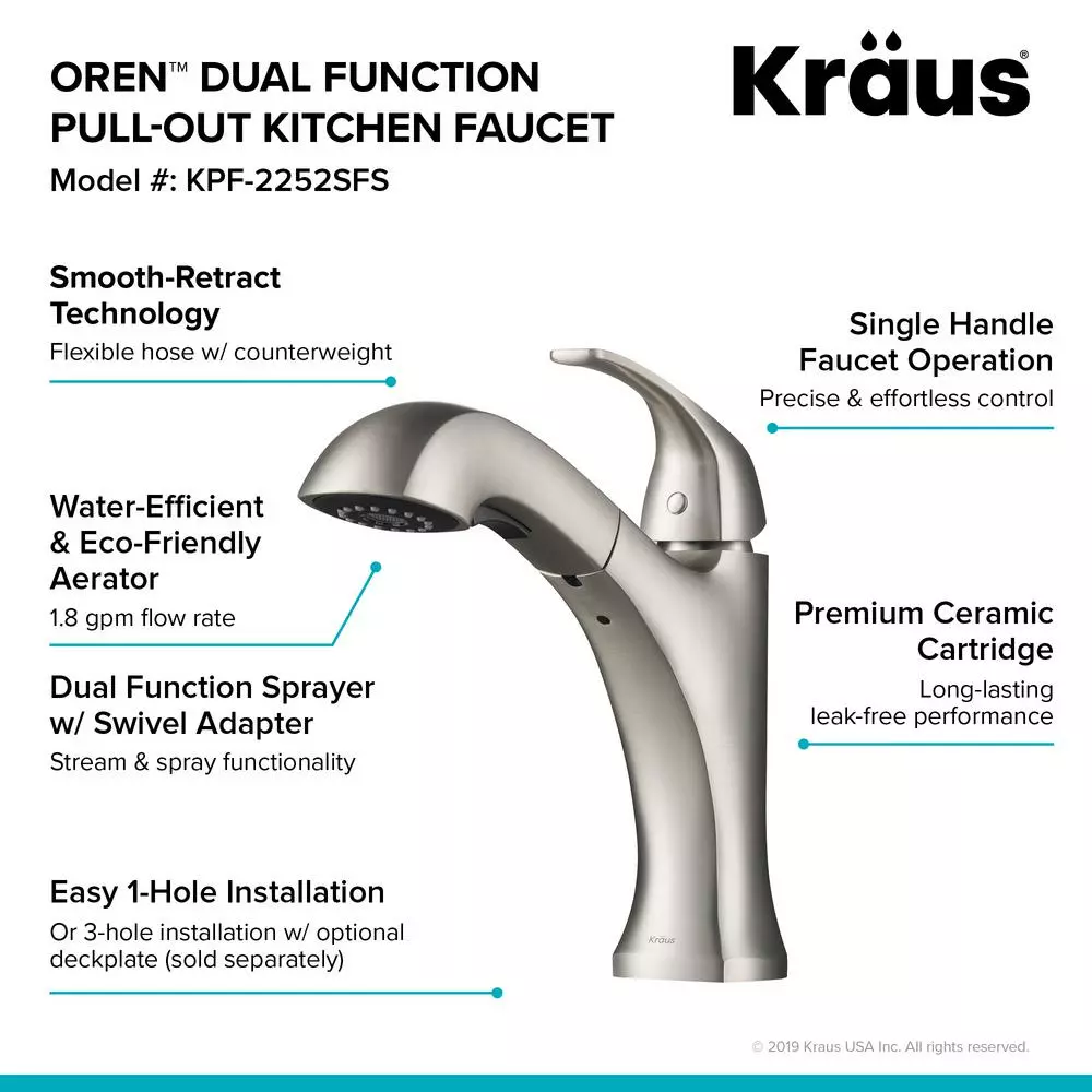 Simple lines and transitional styling make the Oren pull-out faucet a perfect complement for any kitchen decor, from classic to contemporary. A dual function pull-out spray head switches between aerated stream and rinsing spray. The spray head also includes soft rubber nozzles that allow you to instantly wipe away lime scale build-up for a long-lasting optimized flow.