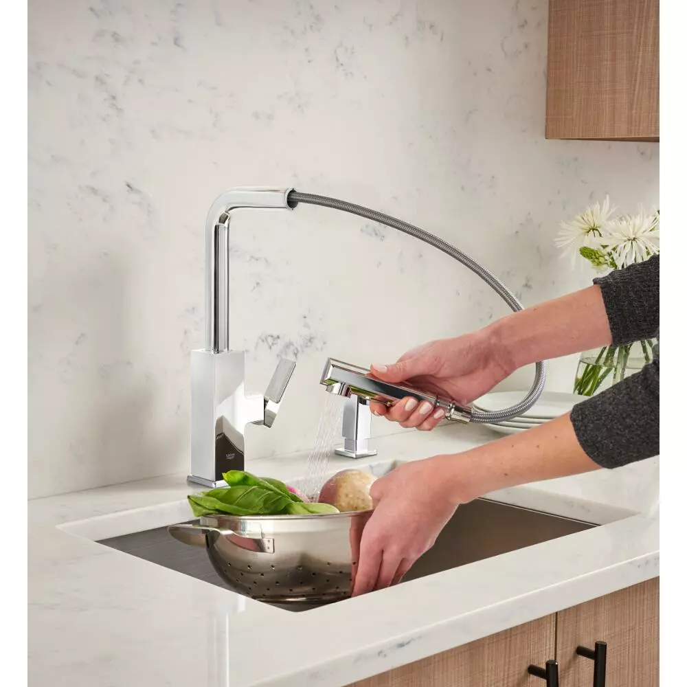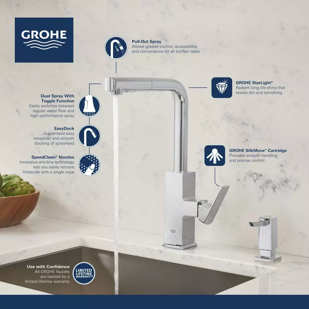 The GROHE Tallinn Pull-Out with Soap Dispenser in Chrome will turn heads with its sleek profile and bold, angular good looks. European designed and German engineered, the kitchen faucet features a side lever handle equipped with a GROHE SilkMove cartridge for easy maneuvering and precise water temperature and volume control, as well as a swivel spout that rotates 360° for maximum accessibility. The dual-function pull-out spray head has GROHE SpeedClean spray nozzles, which protect against lime scale buildup and easily transitions between streams and spray functions with a push of a button. Offered in brilliant GROHE StarLight Chrome, the faucet is dirt- and scratch-resistant, making maintenance a breeze and will look good as new even after a lifetime of use.