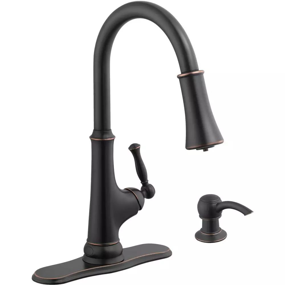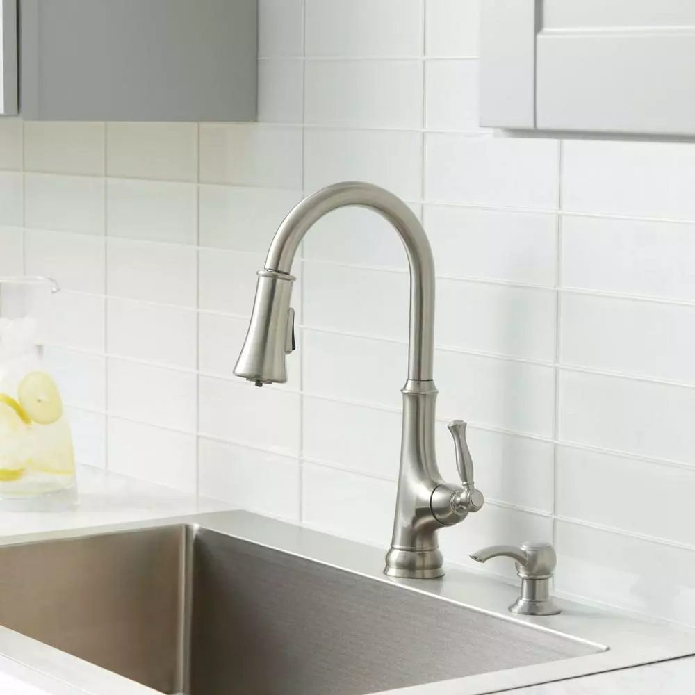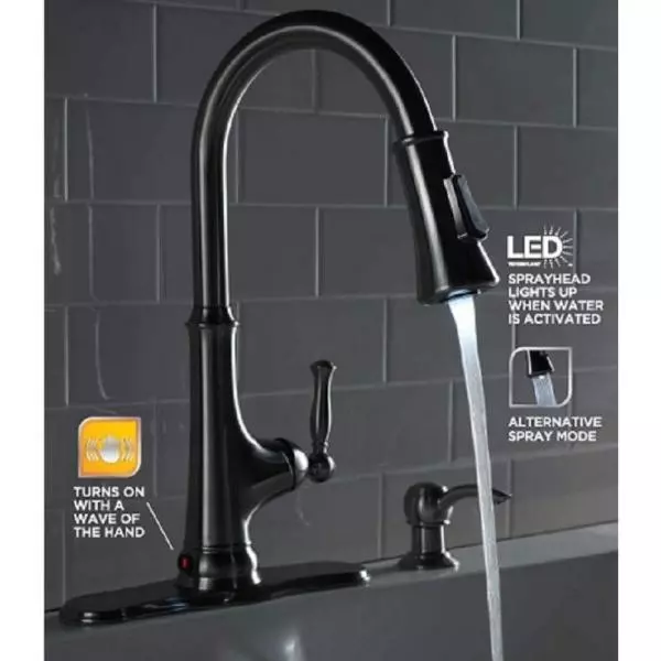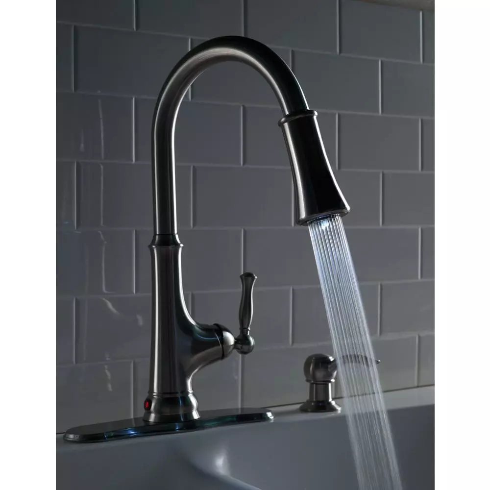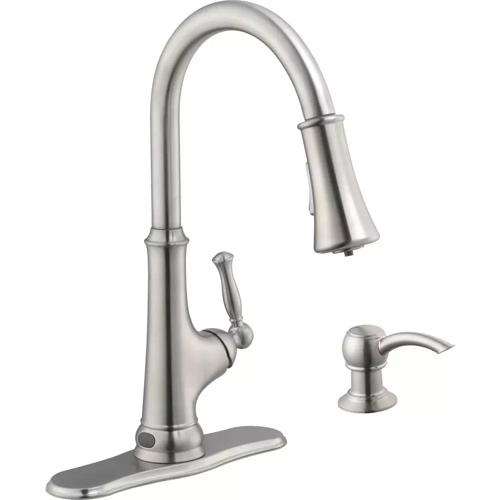 The Glacier Bay Touchless LED Single-Handle Pull-Down Sprayer Kitchen Faucet with Soap Dispenser in Stainless Steel is a faucet that blends innovation with style. The intuitive sensor allows hands free use of the faucet, which is ideal to reduce the spread of bacteria in the kitchen. Simply wave your hand in front of the sensor to start and stop the flow of water. The pull-down spray head features a white LED light that runs off energy generated from the flow of water. The LED provides both an aesthetically pleasing design coupled with a sensible solution for your kitchen needs. Use the LED spray head to ensure your pots and pans are spotless. Easily access your soap with the included matching soap dispenser. This faucet also features a ceramic disc cartridge and limited lifetime warranty.
