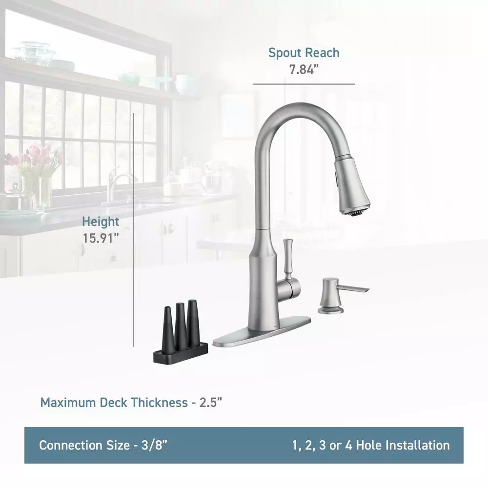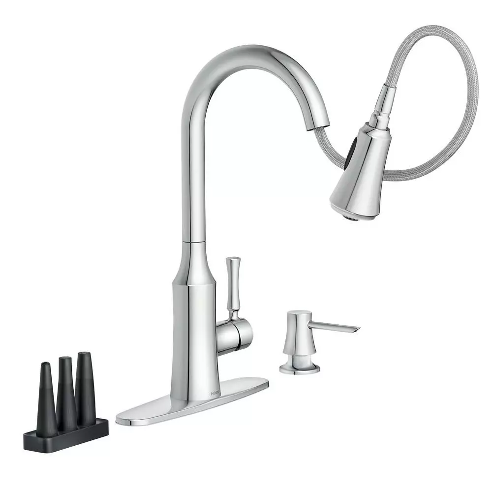 The timeless yet fashion-forward design of the Venango pulldown kitchen faucet offers a flexible, detailed look that is complementary to a variety of kitchen styles. The fixture features MOEN’s Power Clean spray technology, which cleans 50% faster than MOEN faucets without the technology, and includes 3 additional Power Clean attachments to provide multiple, focused spray options for hard-to-clean items. It also comes equipped with MOEN’s Reflex system to ensure smooth operation and secure docking of the spray wand, as well as a matching soap dispenser for a coordinated appearance.