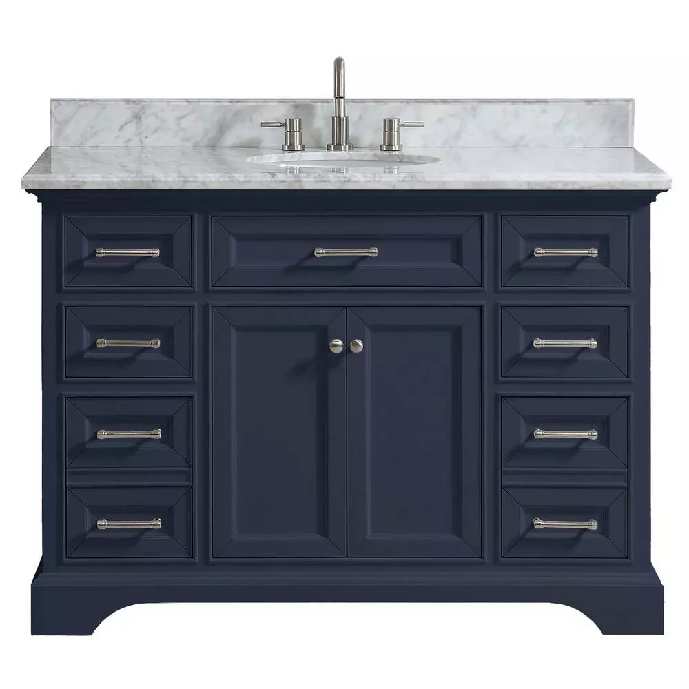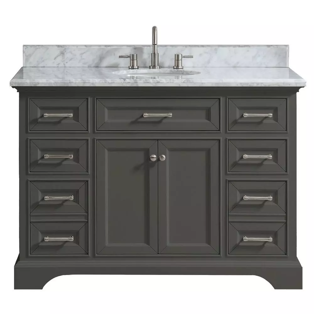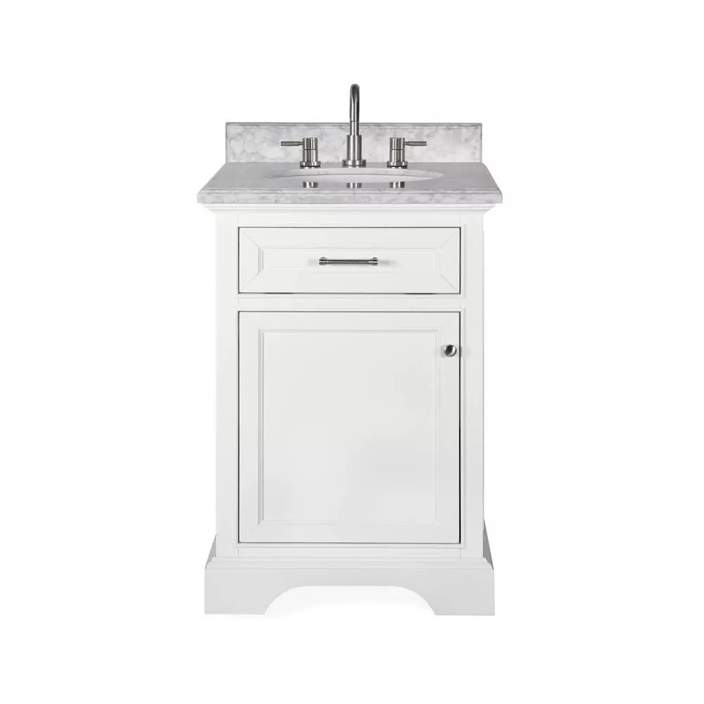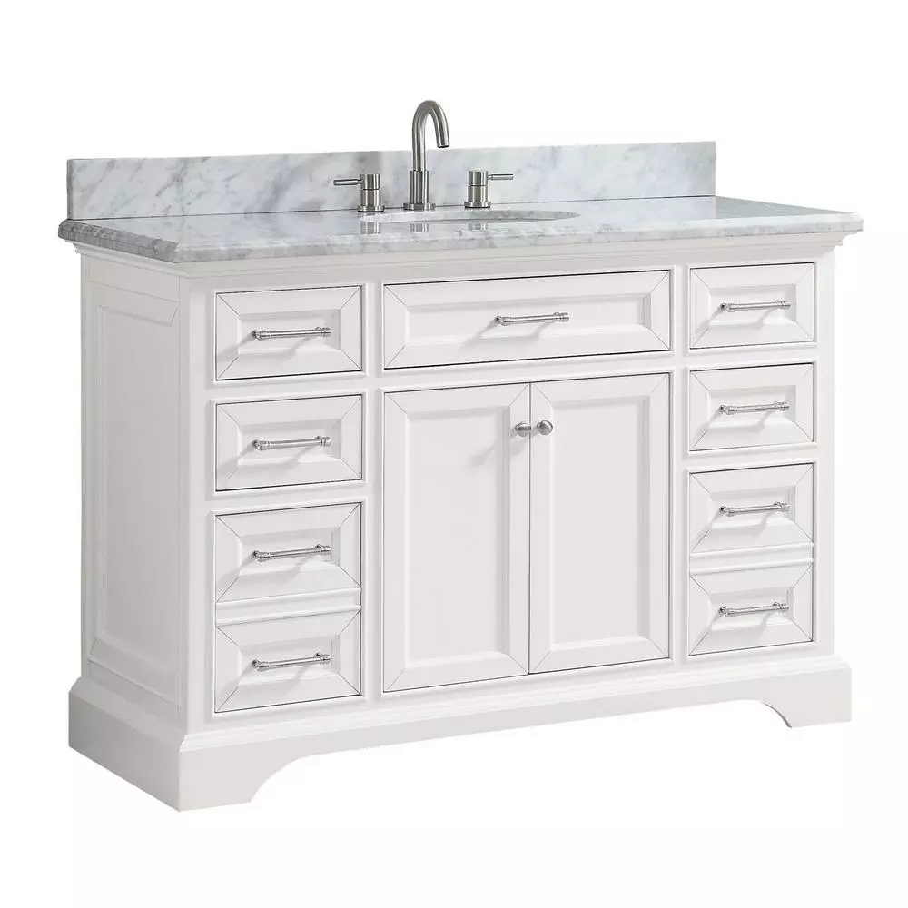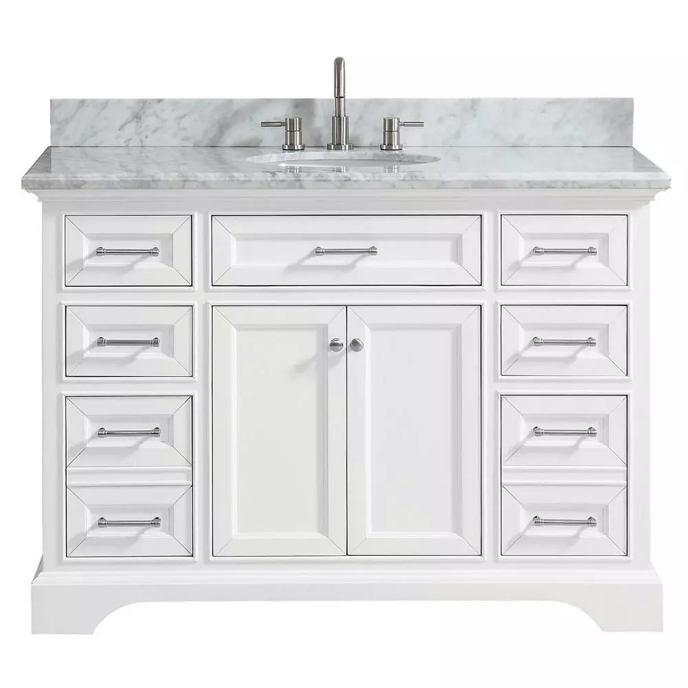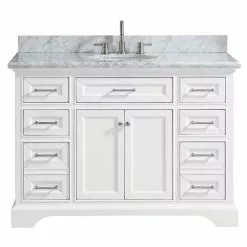 The white finish on the Windlowe 49 in. W x 22 in. D x 35 in. H Bath Vanity Carrara Marble Vanity Top will blend into any existing décor style scheme. The durable wood that it is constructed with is easy to clean and the surface is ample enough to store personal items. This vanity blends contemporary and traditional styles and is sure to bring a timeless touch to your home.