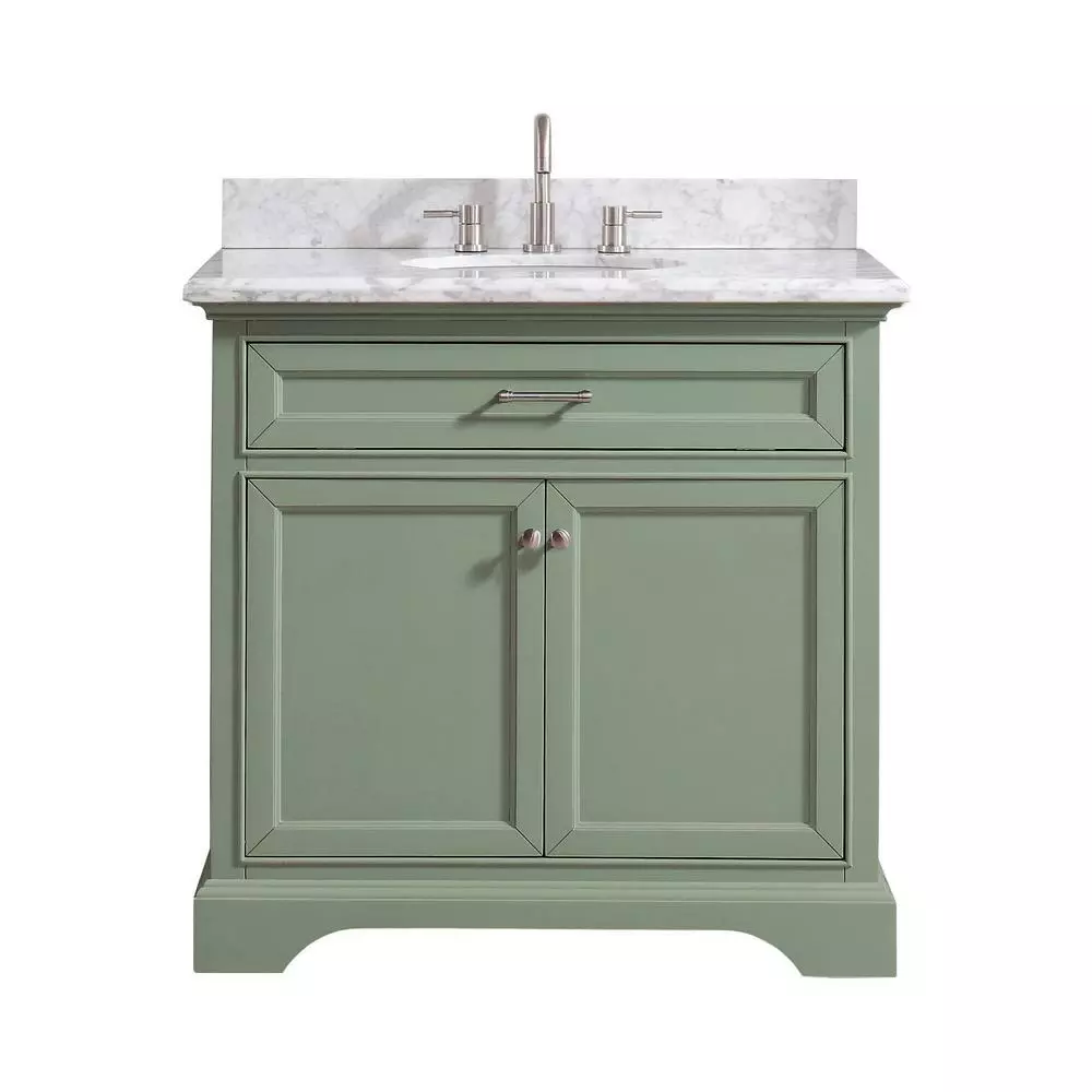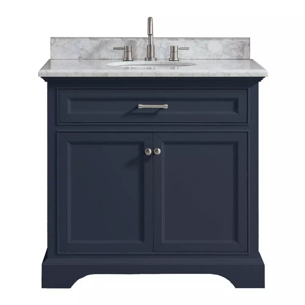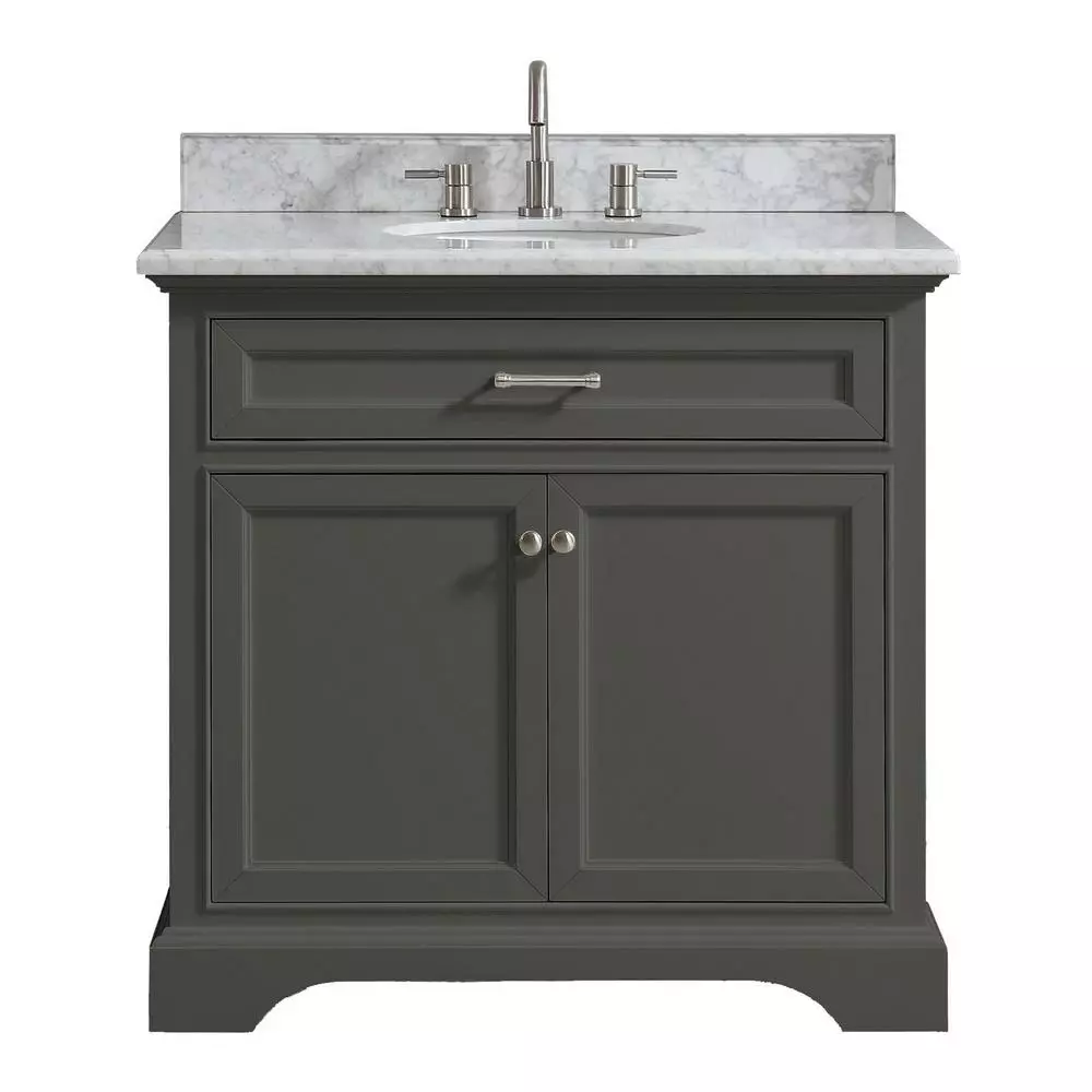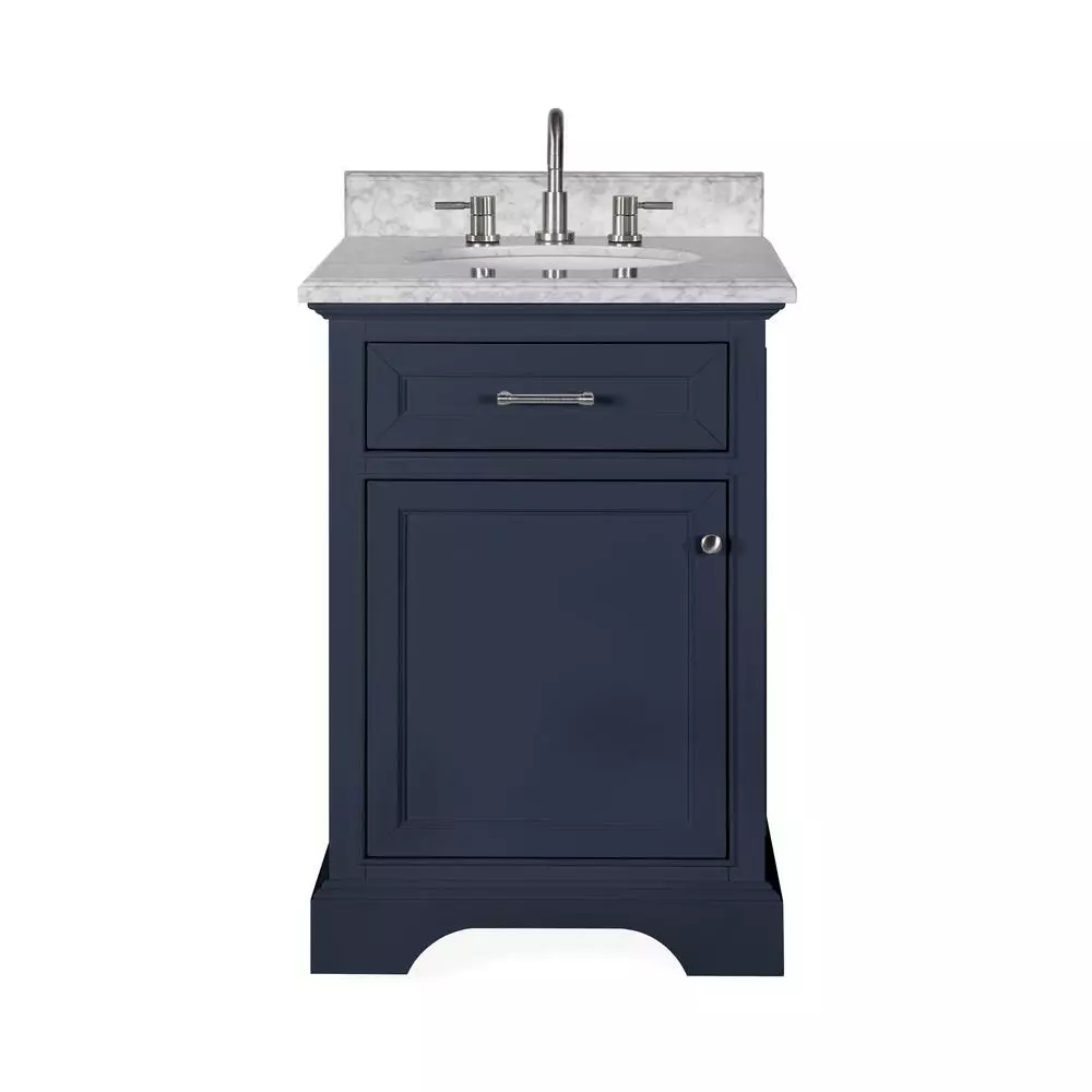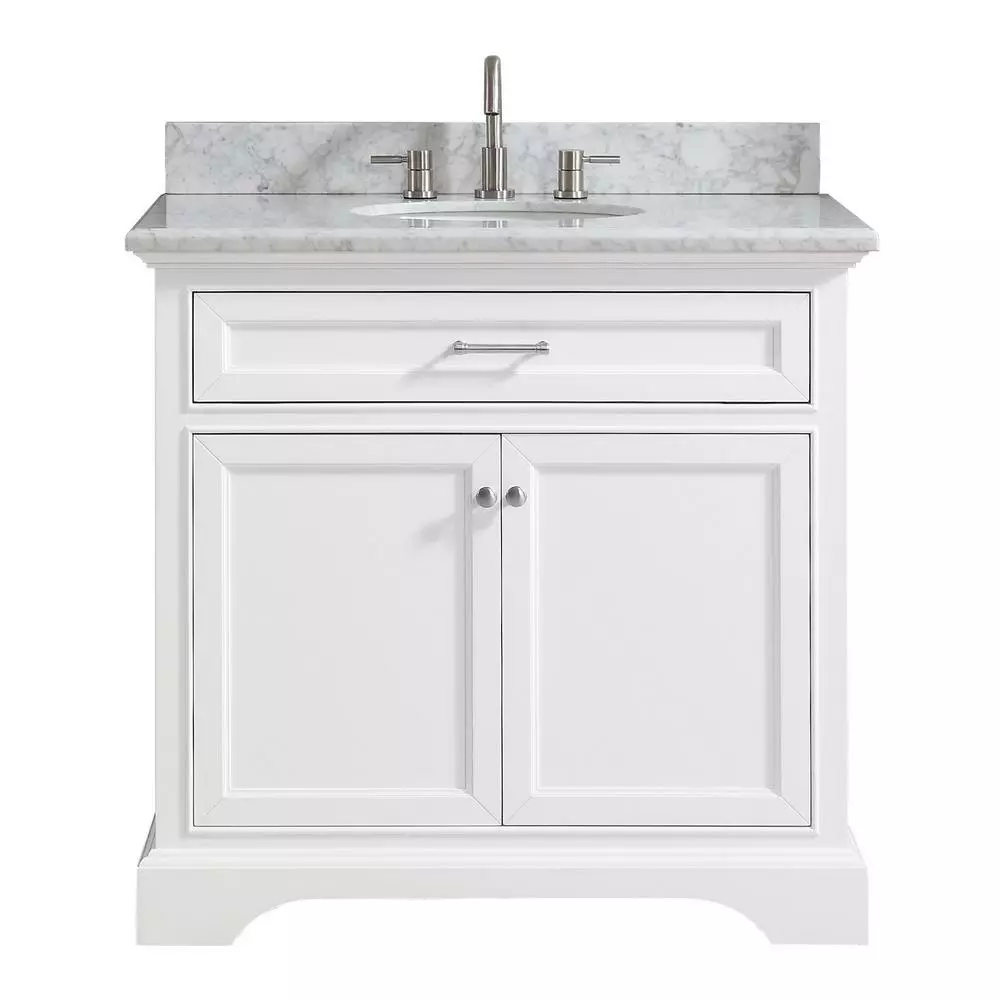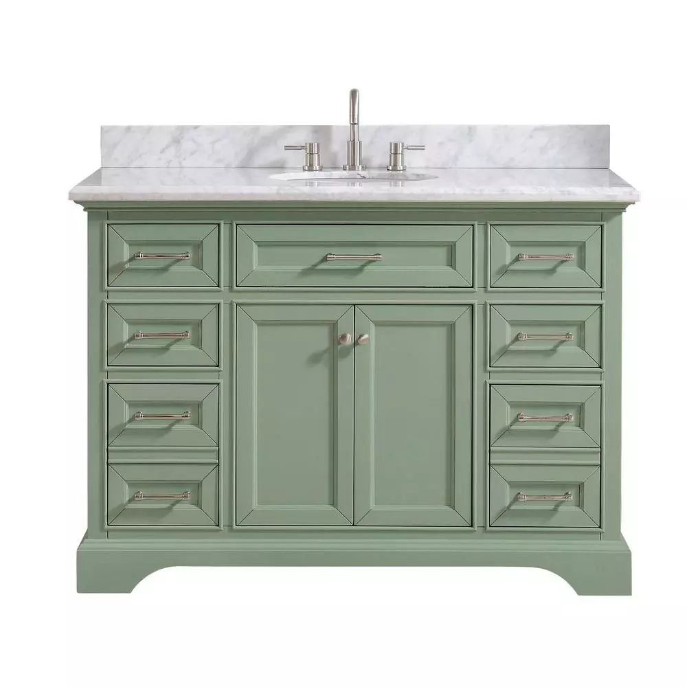 The white finish on the Windlowe 49 in. W x 22 in. D x 35 in. H Bath Vanity Carrara Marble Vanity Top will blend into any existing décor style scheme. The durable wood that it is constructed with is easy to clean and the surface is ample enough to store personal items. This vanity blends contemporary and traditional styles and is sure to bring a timeless touch to your home.