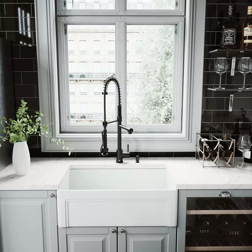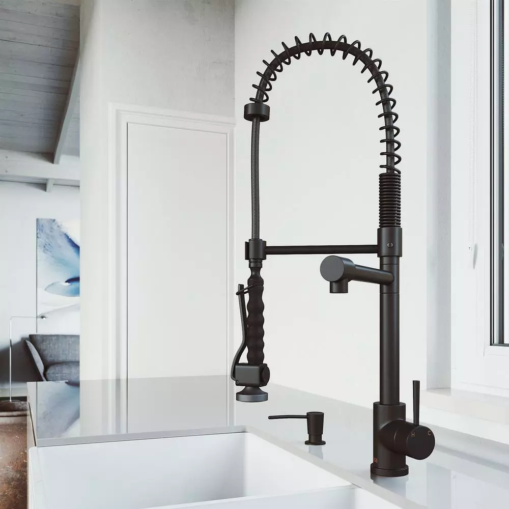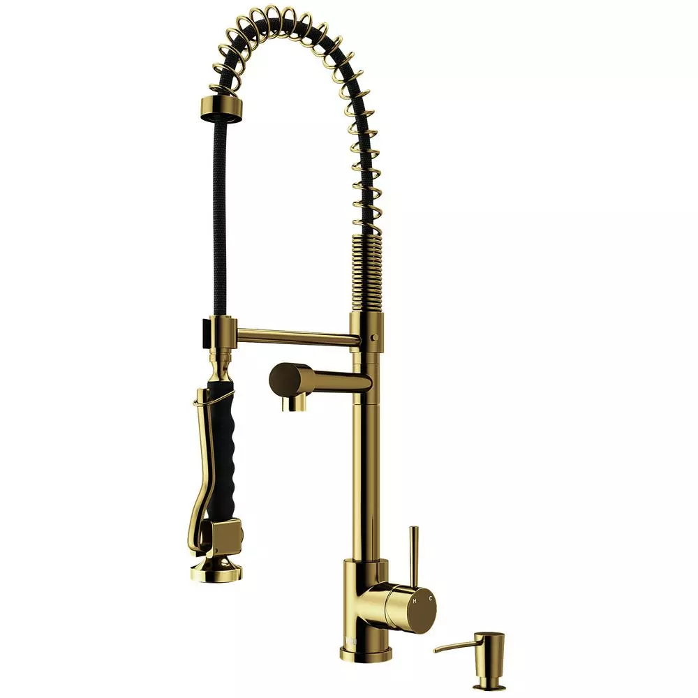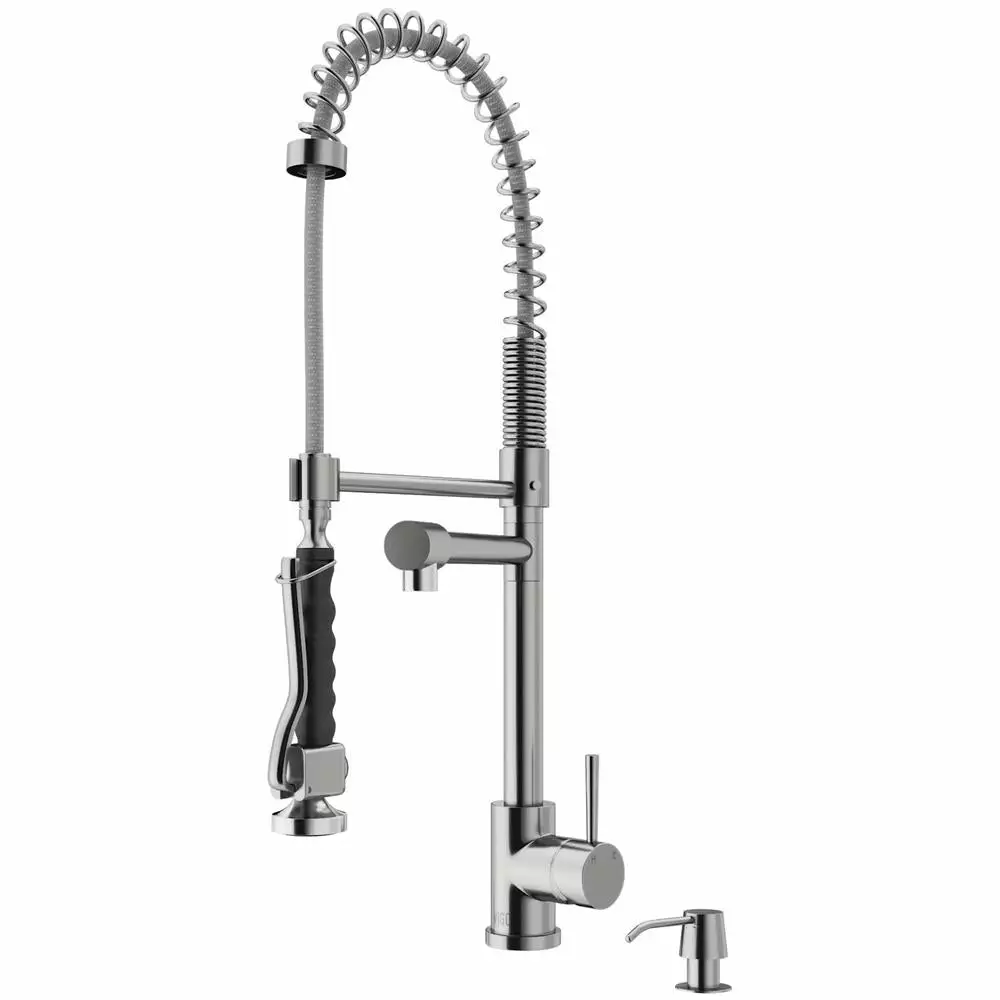 The VIGO Zurich Pull-Down Spray Kitchen Faucet features a pull-down spray head that can extend up to 28 inches, along with a separate pot filler, making it highly functional in any kitchen. This single hole, single lever faucet is constructed from durable solid brass and features a 7-layer plated finish for durability and longevity. Its easy grip handle makes it ideal for use in both residential and commercial kitchens. Included with this faucet is an above-counter pump soap dispenser with a refillable reservoir that sits below the counter.